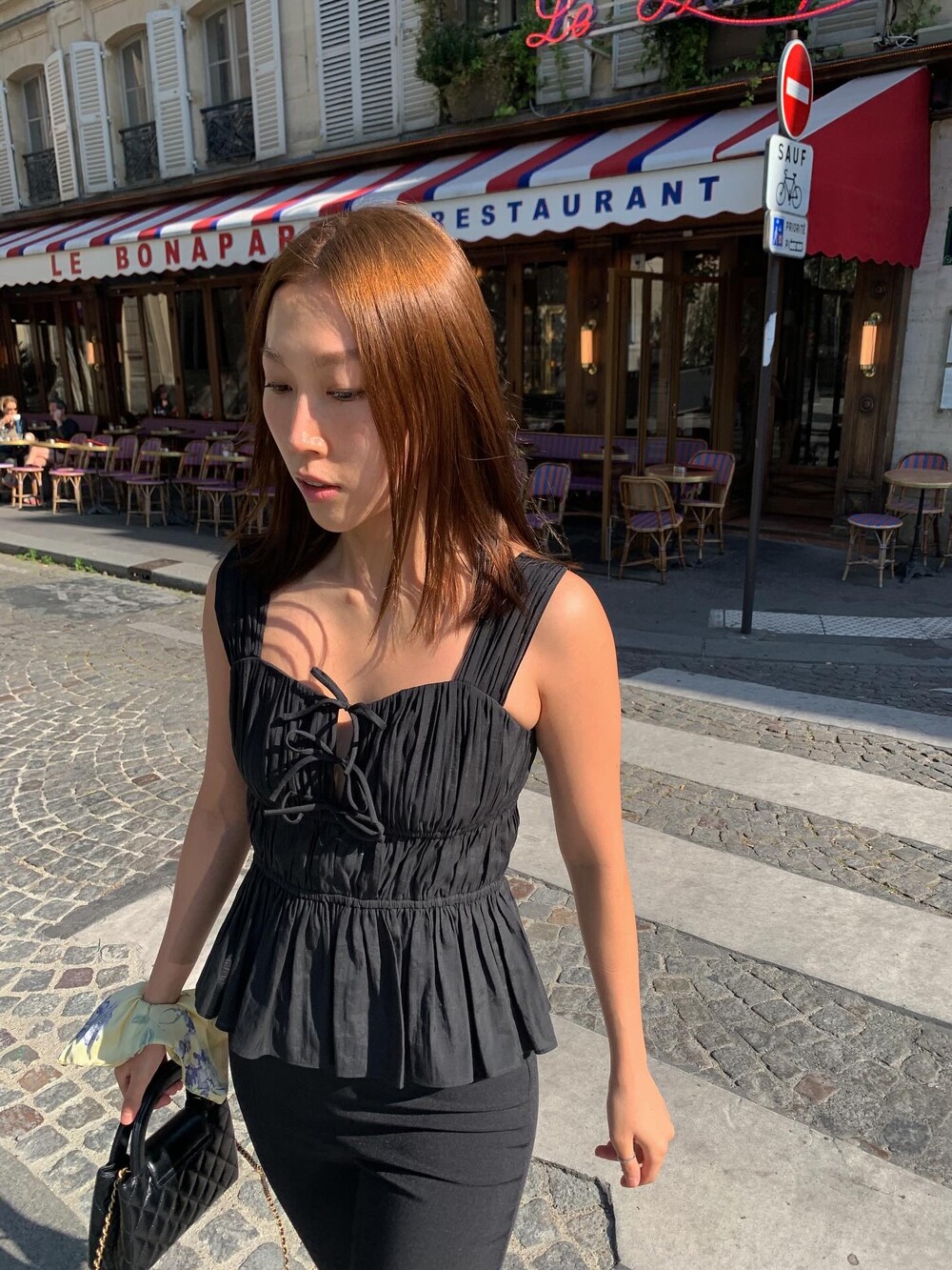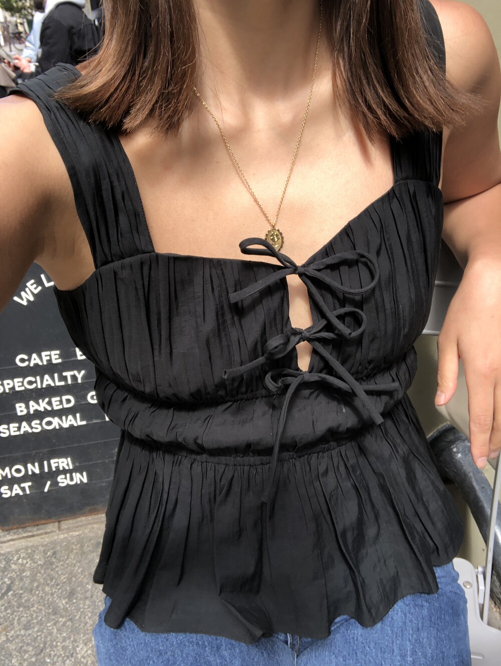 가슴 중심 부에 위치하는 리본 여밈 스트링은 그 너비가 채 3mm가 되지 않도록 생산되었고,