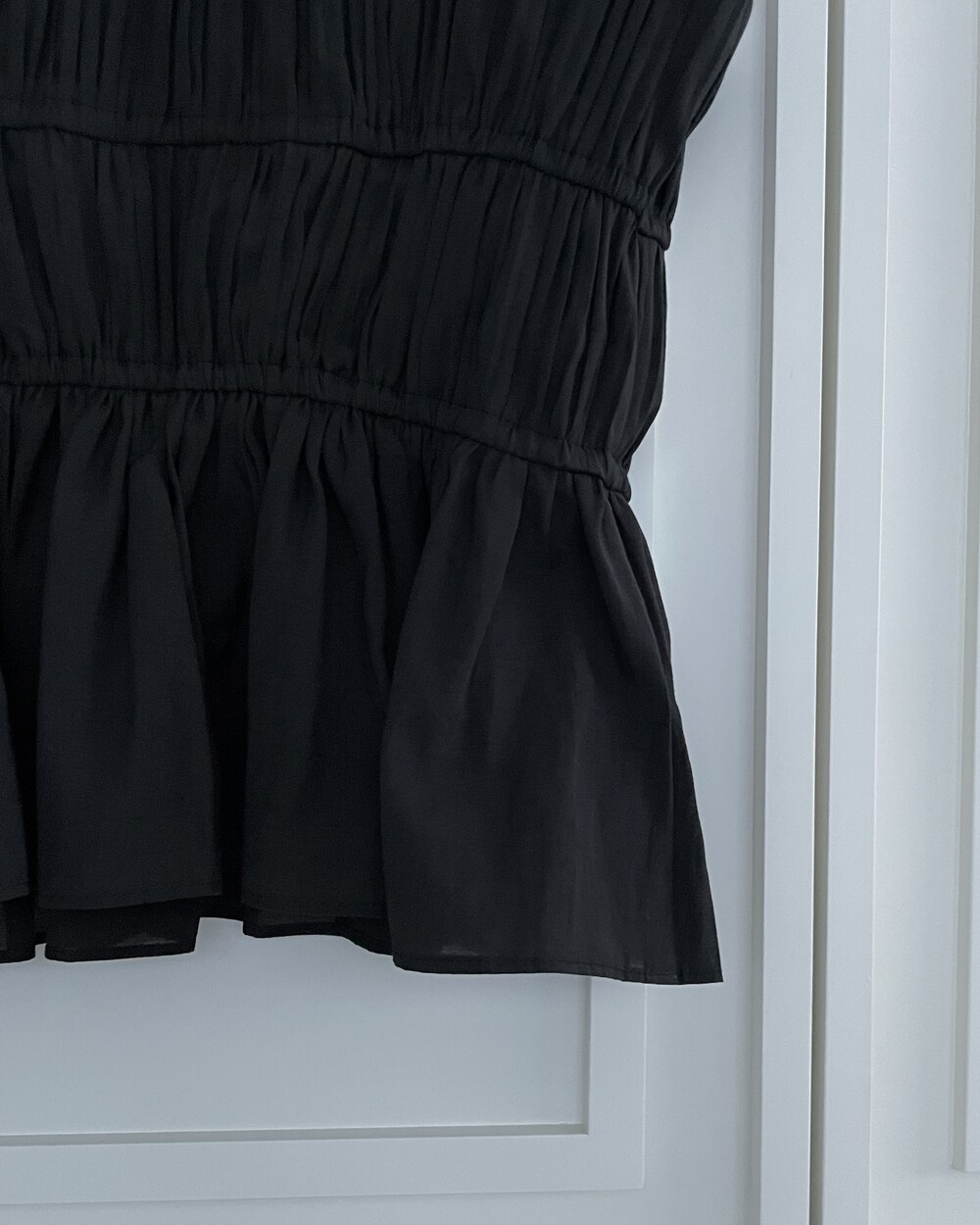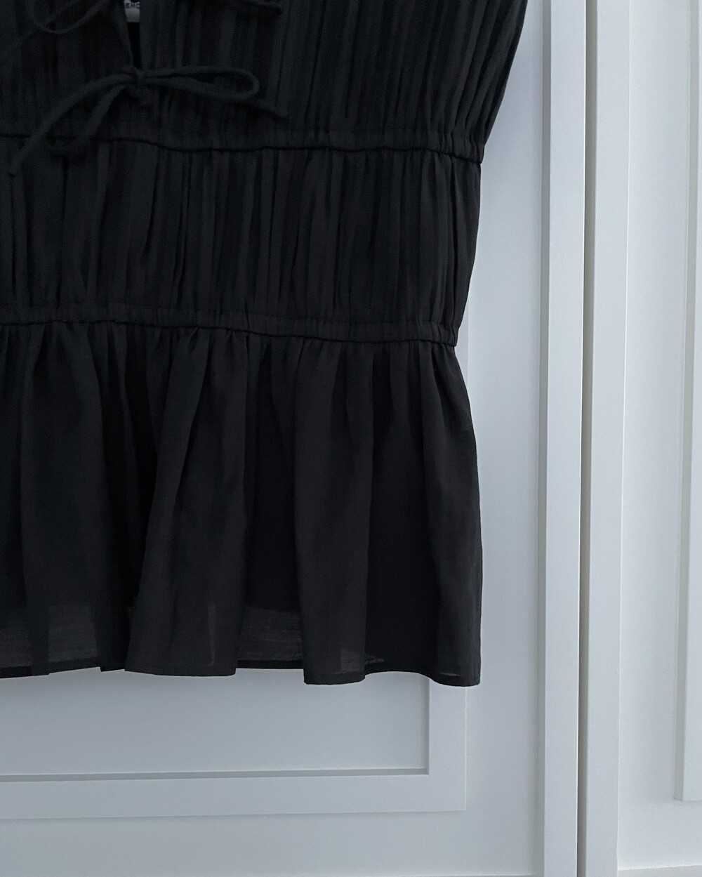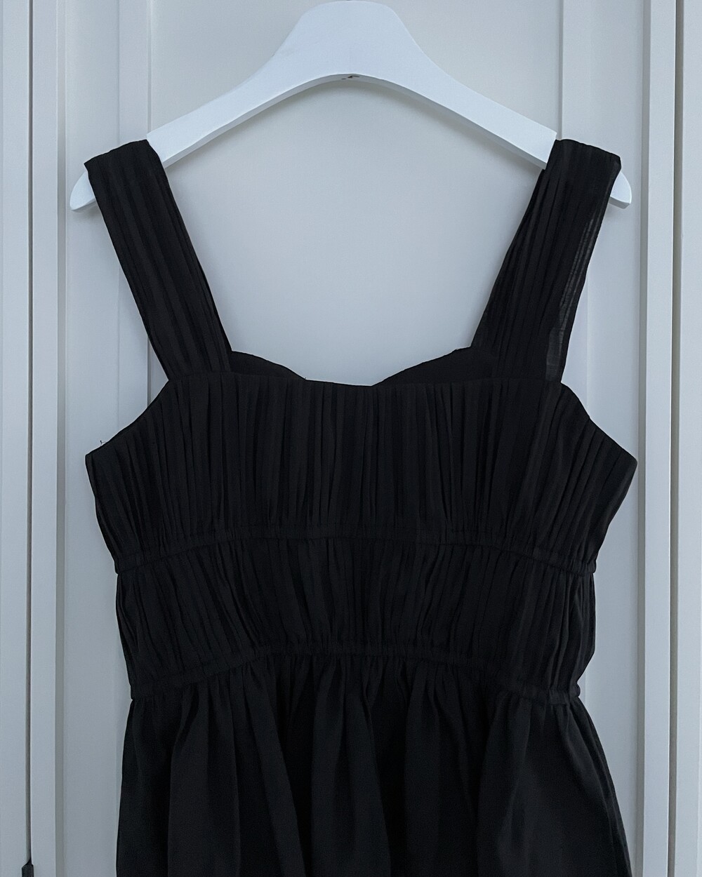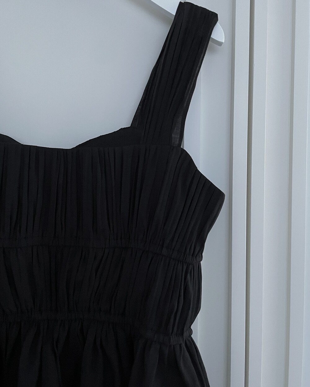 딱 목 밑에 갖다 대어도 부담 없을만한 주름 간격을 디자인하여 어깨끈부터 가슴과 허리 패널까지 전판 주름 작업 후 생산했습니다.
