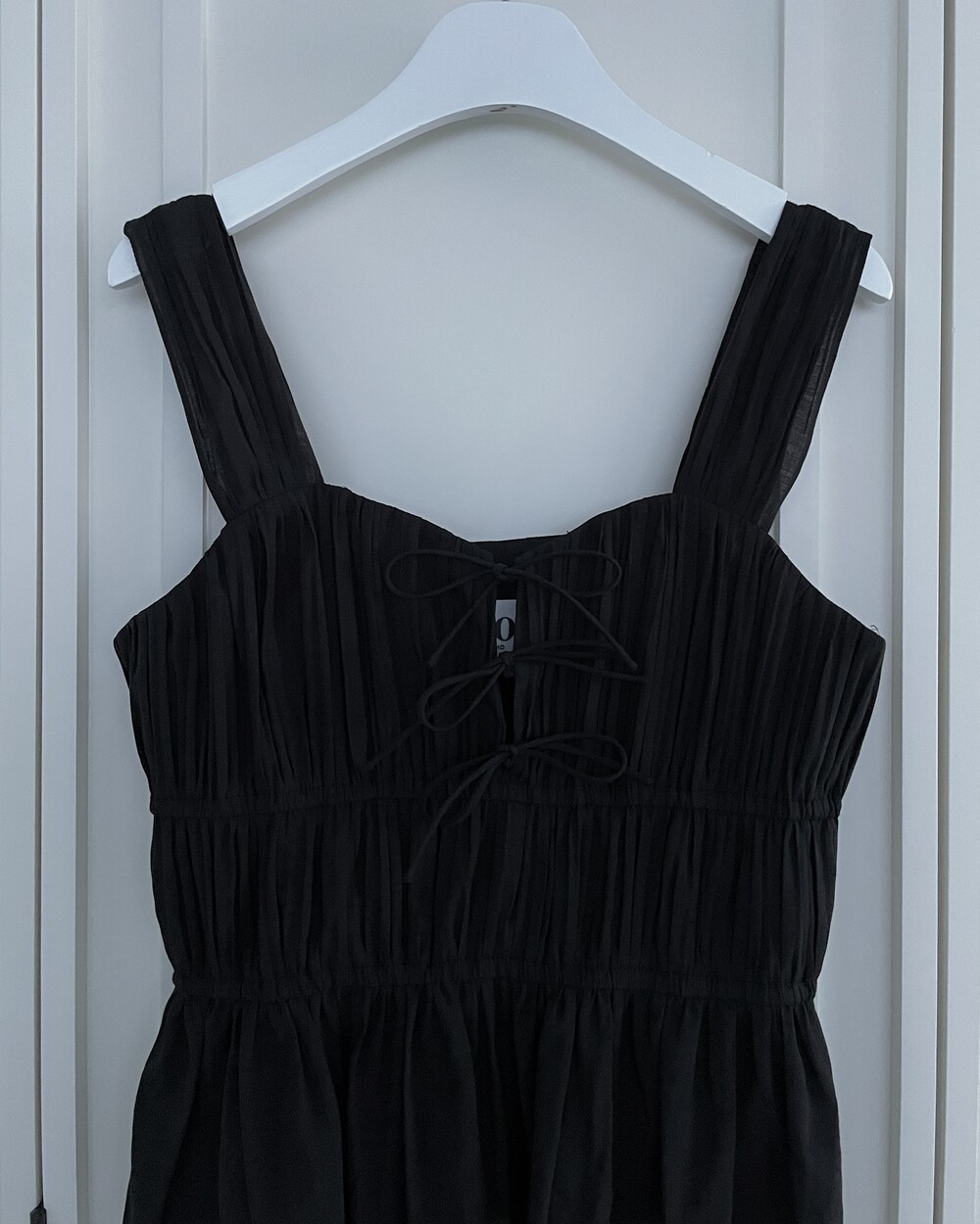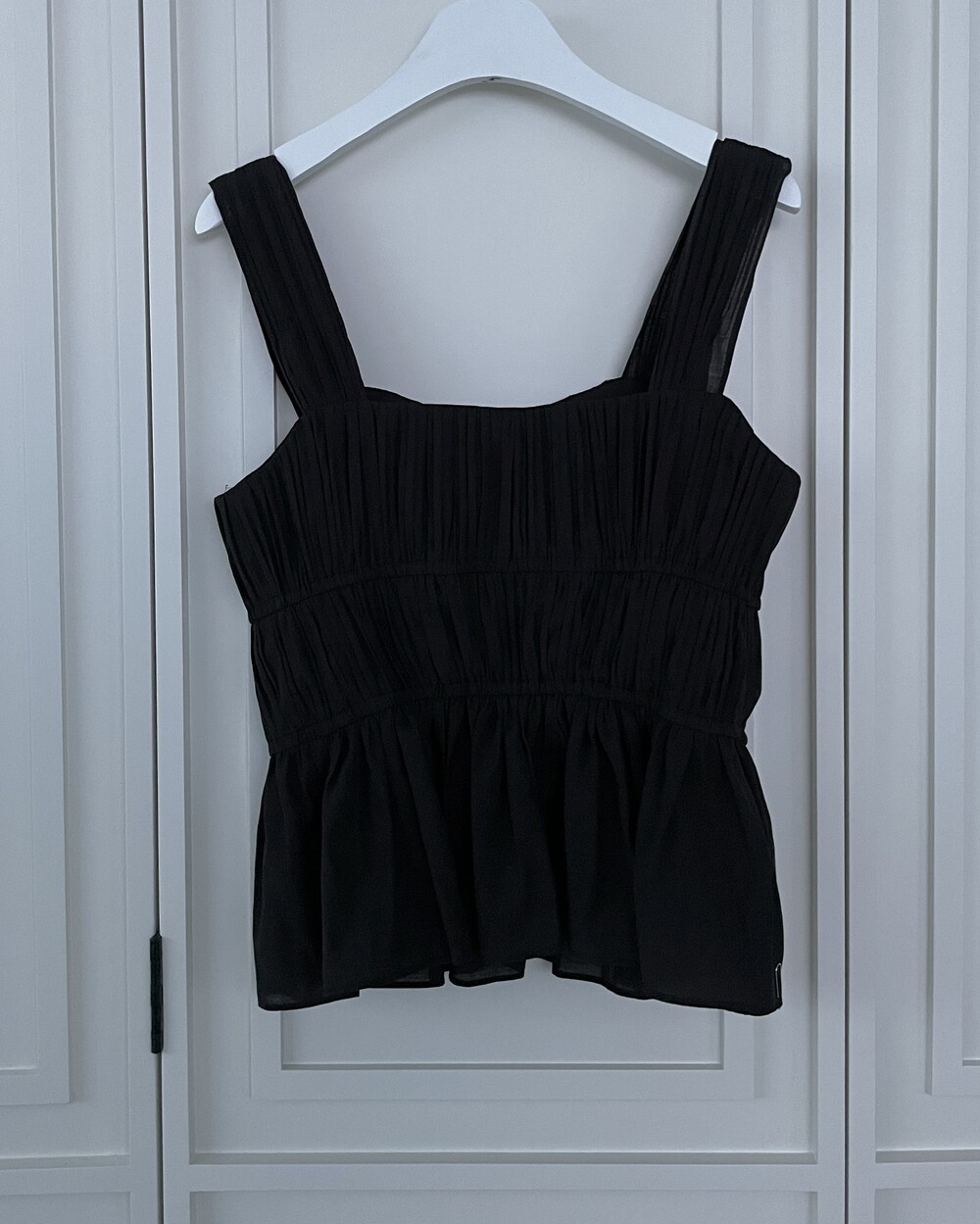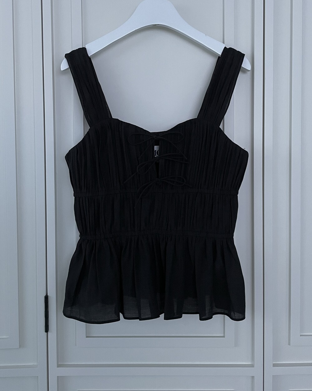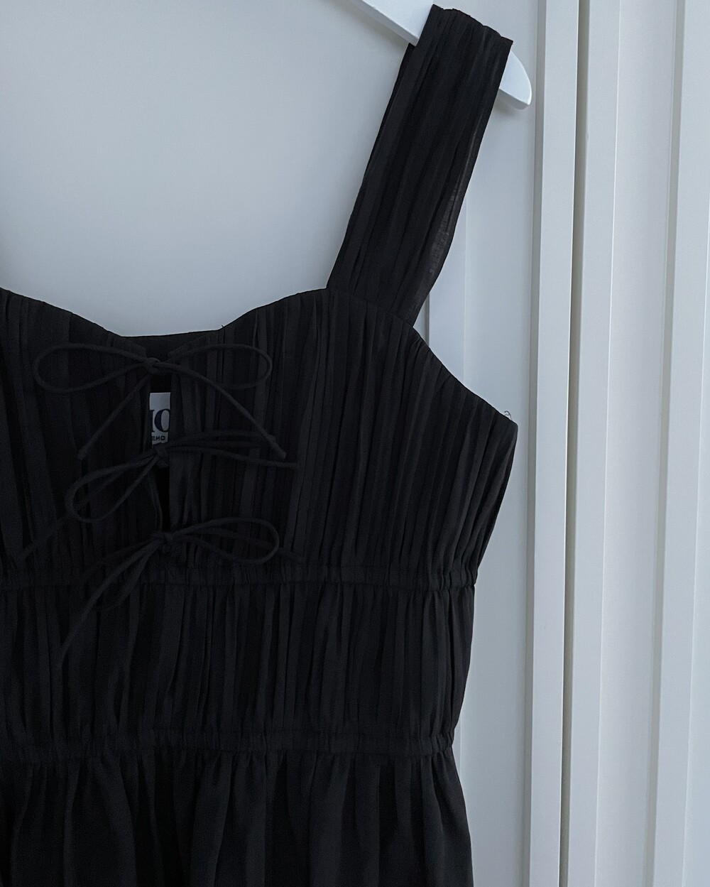 딱 목 밑에 갖다 대어도 부담 없을만한 주름 간격을 디자인하여 어깨끈부터 가슴과 허리 패널까지 전판 주름 작업 후 생산했습니다.