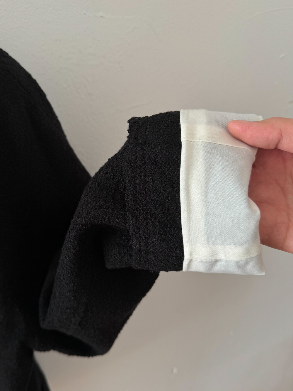 아! 안감이 면100% 레몬빛이 감도는 상아색으로 매칭되었는데 소매 꼭 롤업해서 입어보셔요. 배색이 주는 예쁨. 특히 면이 주는 담담함이 스타일 가리지 않고 폭넓게 활용되도록 루킹을 이끌어줍니다.