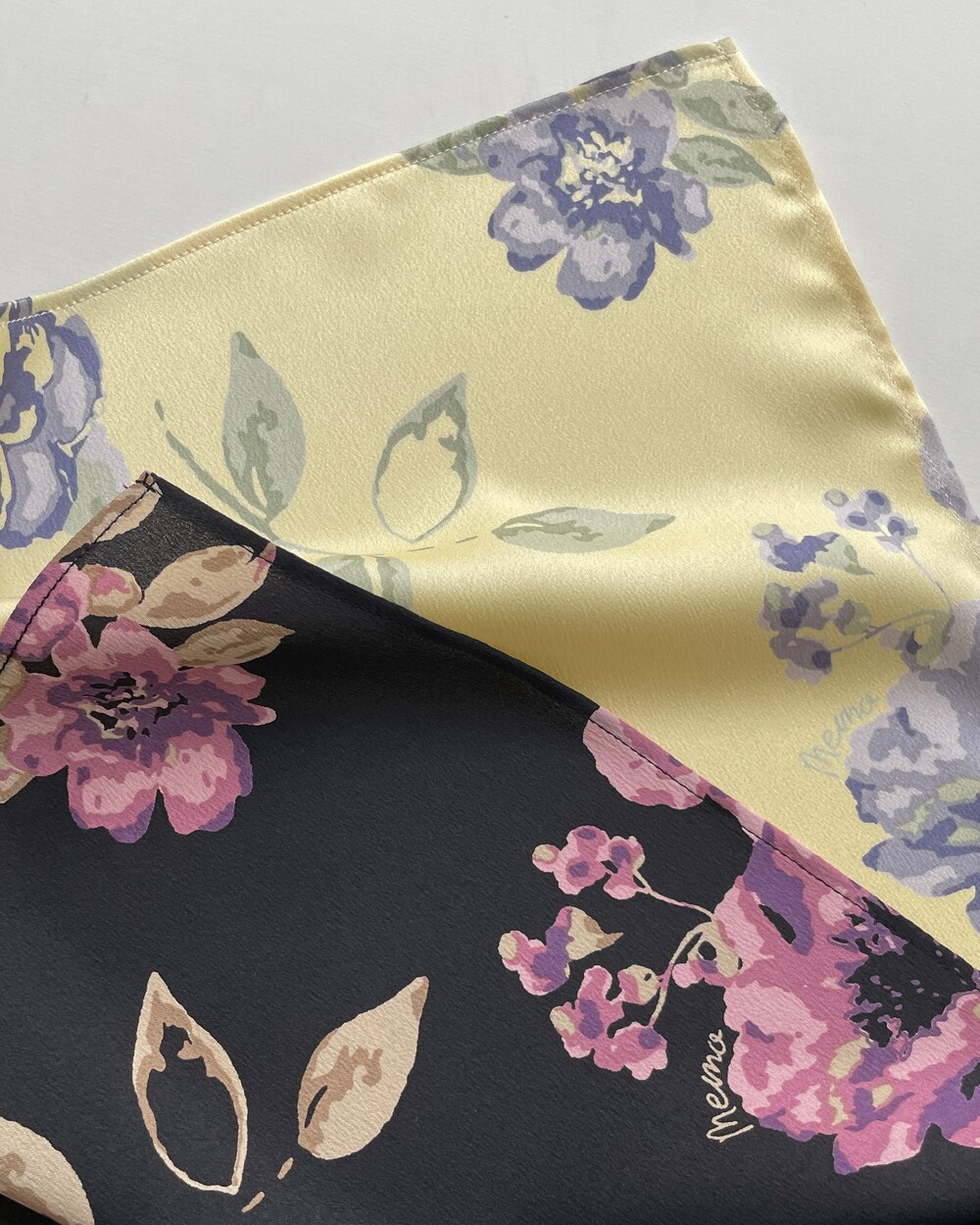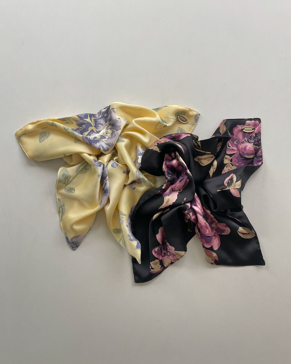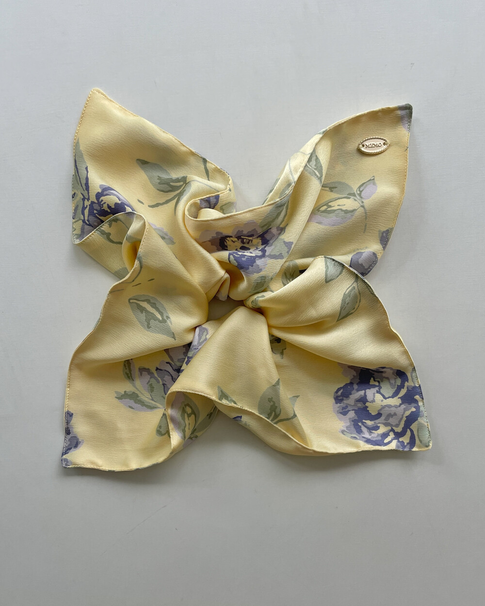 손수건 형태인데 , 한 면의 프린트가 절개되지 않도록 특수 재단하여, 마구 묶어도 꼬임이 쏠리거나 울룩 불룩해지지 않고 쉽게 예쁜 폼이 연출되더라구요.