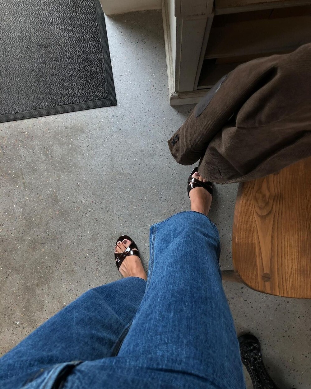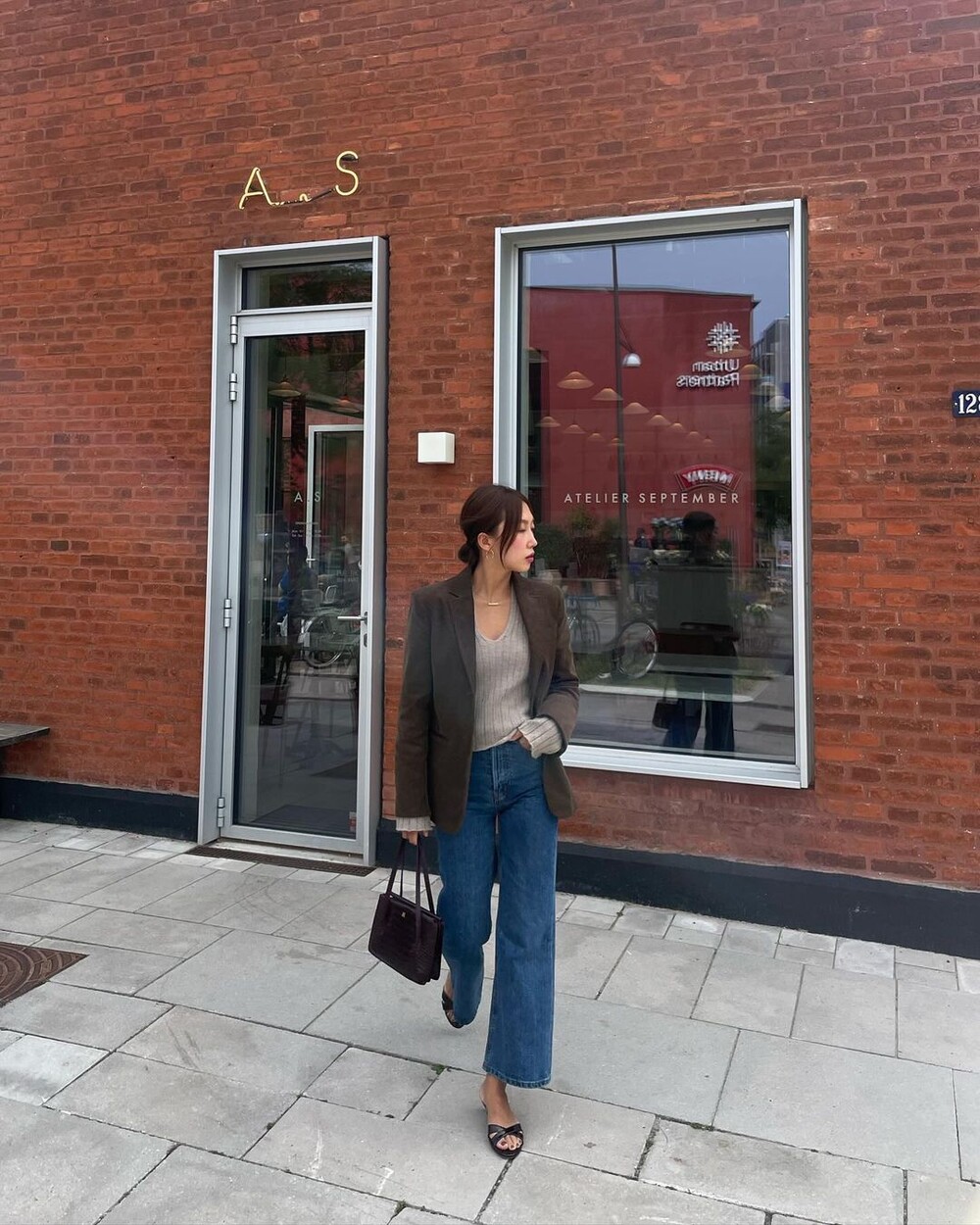 여유있는 스트레이트 진에 스니커즈만 매치해도 상당히 모던하고 예쁩니다.