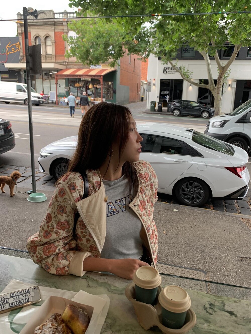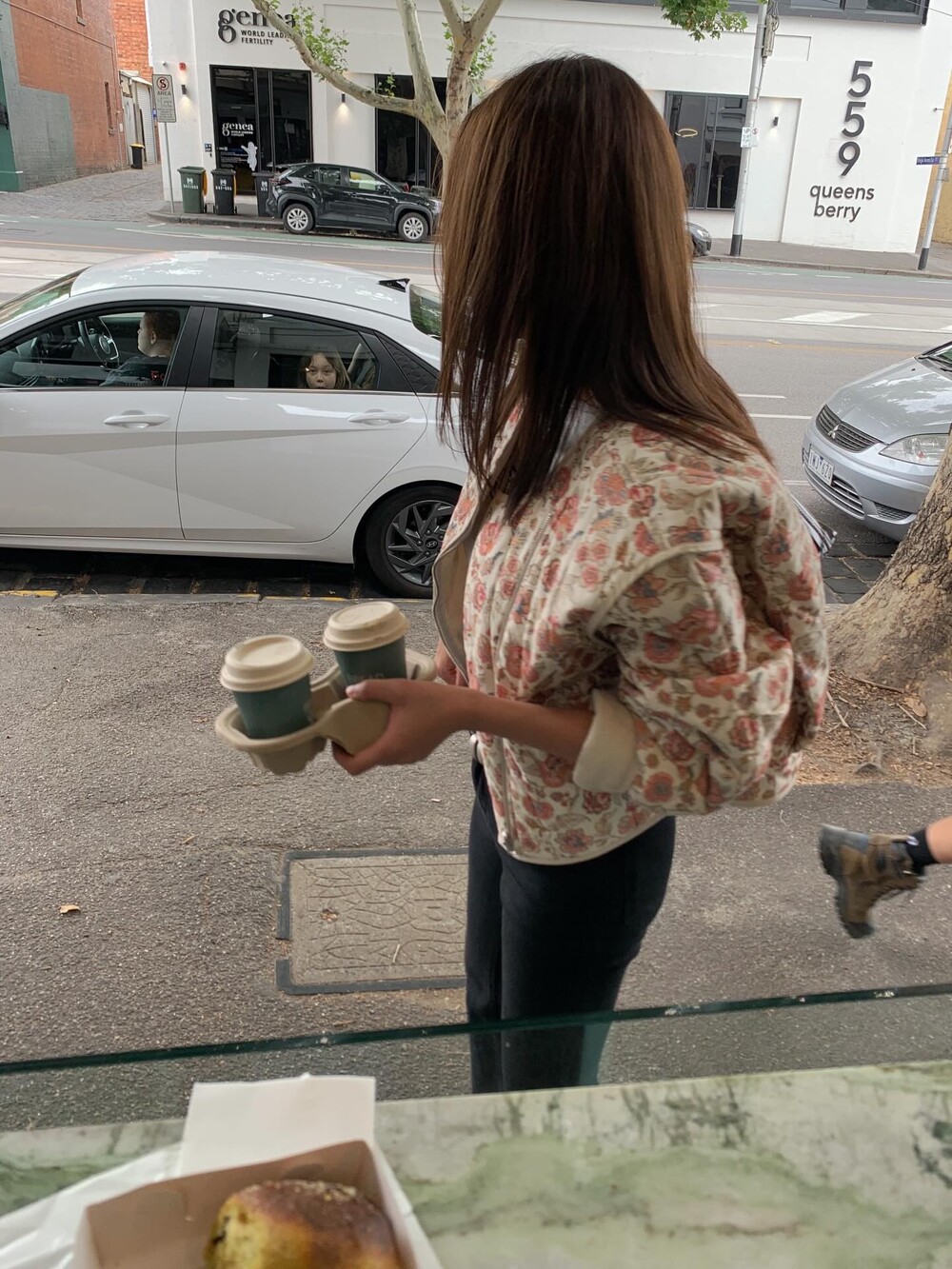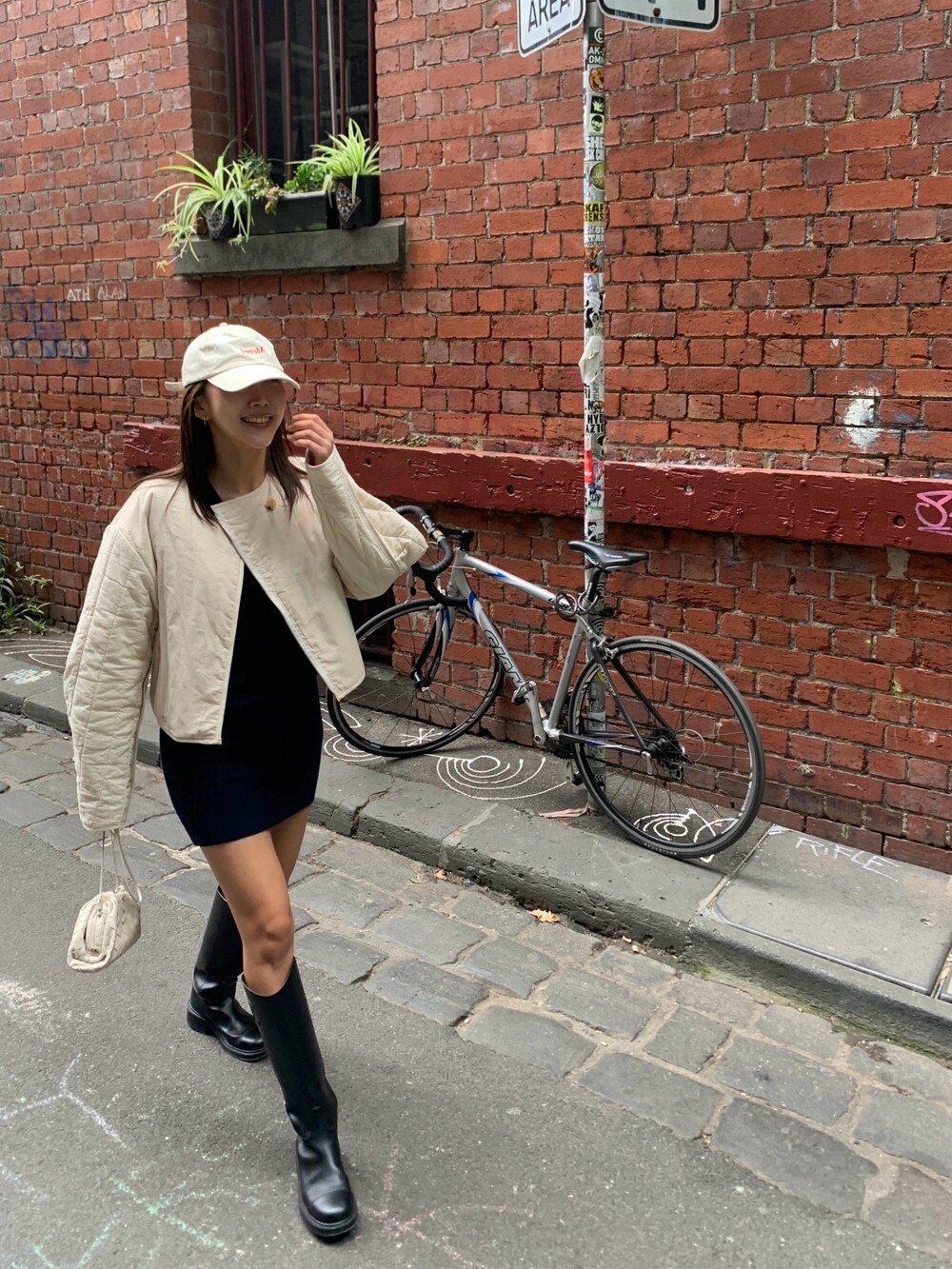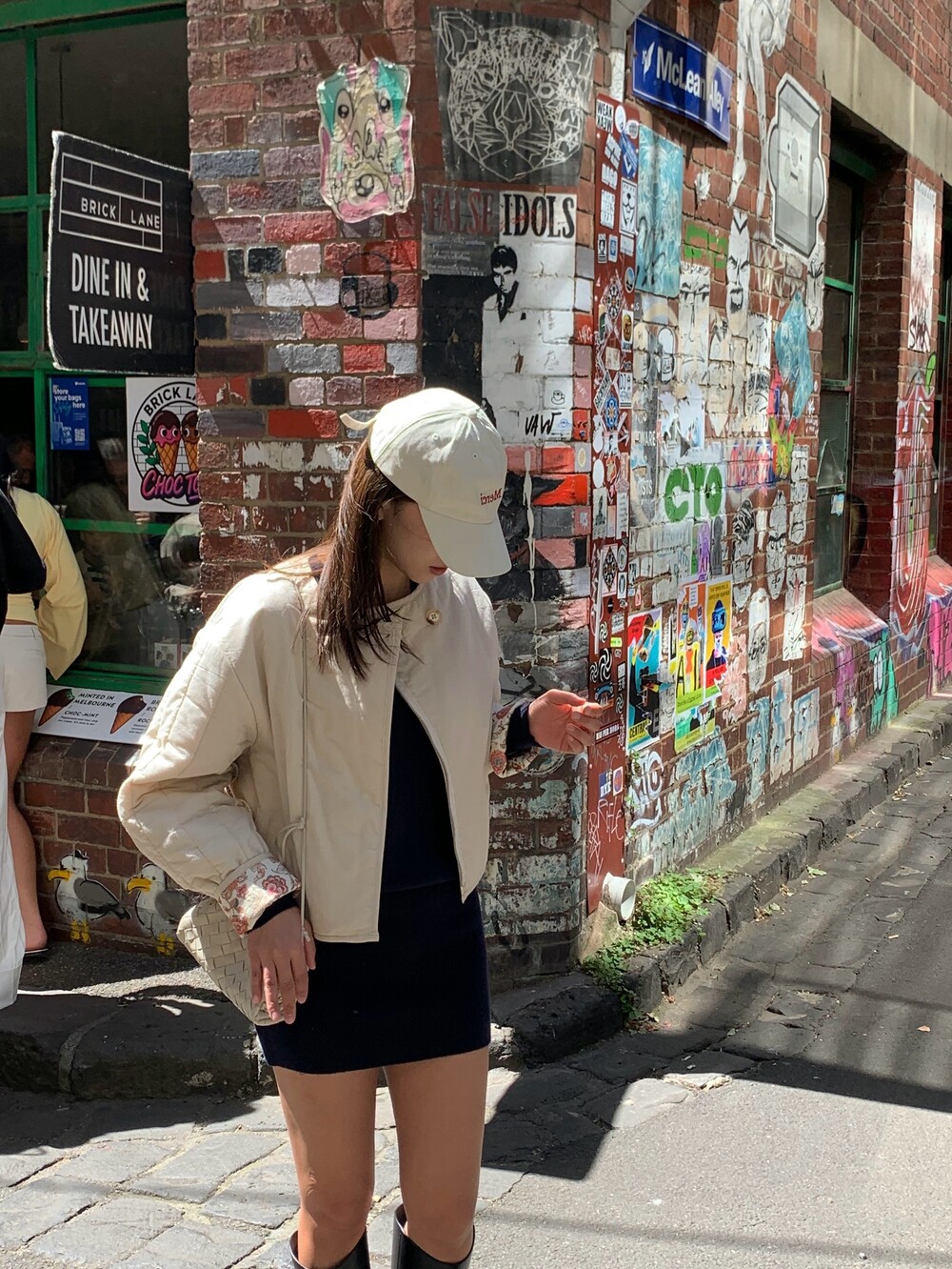 반대 솔리드 면은 라이트 베이지 컬러로 아우터 한 피스로 다양한 연출이 가능하답니다 .