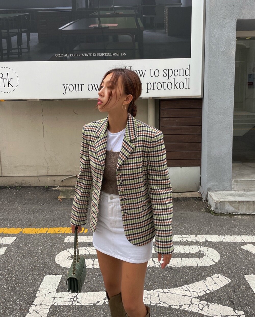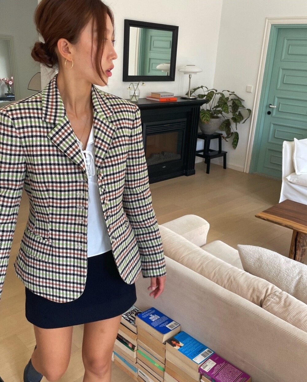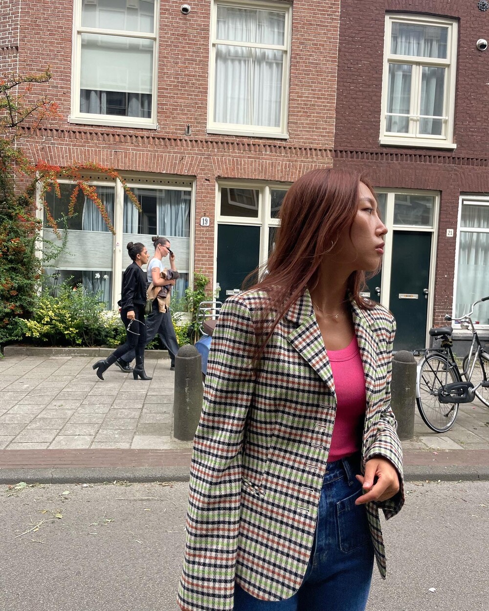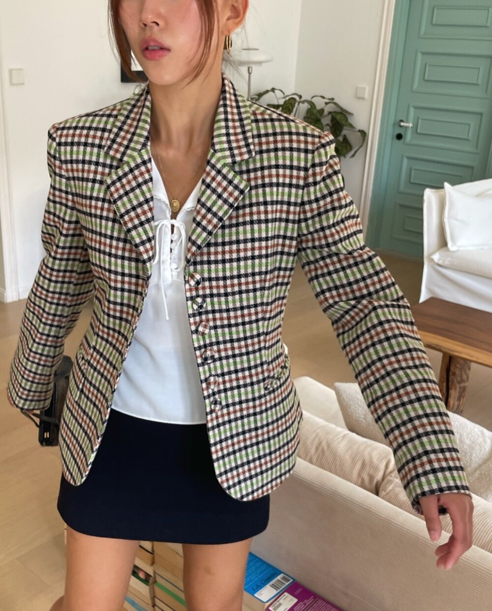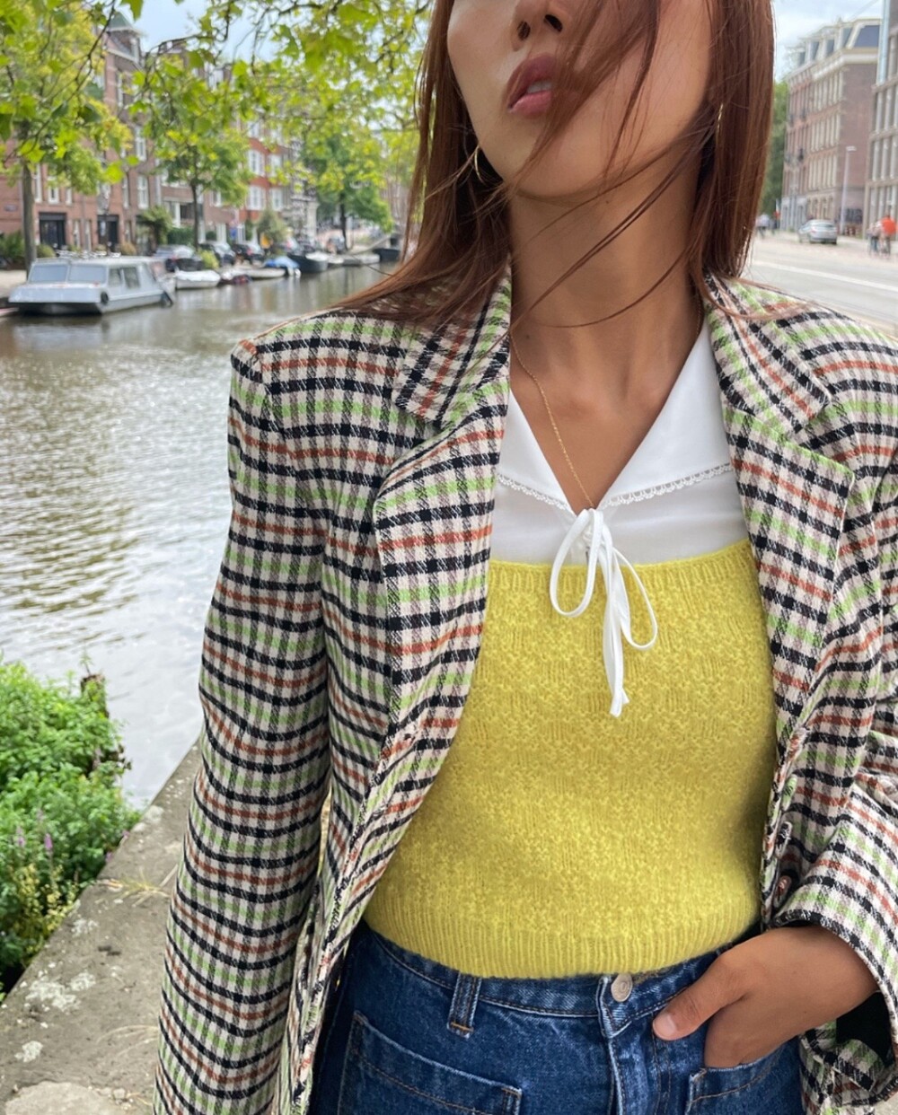 아오리사과의 청량한 라이트그린을 어찌 이렇게 대담하게 풀었는지! 존재감 강한 컬러를 카멜과 블랙, 아이보리 류로 눌러주며 무게감을 더했는데 아주 이국적이면서 귀티납니다.