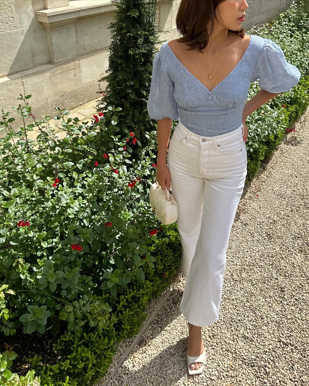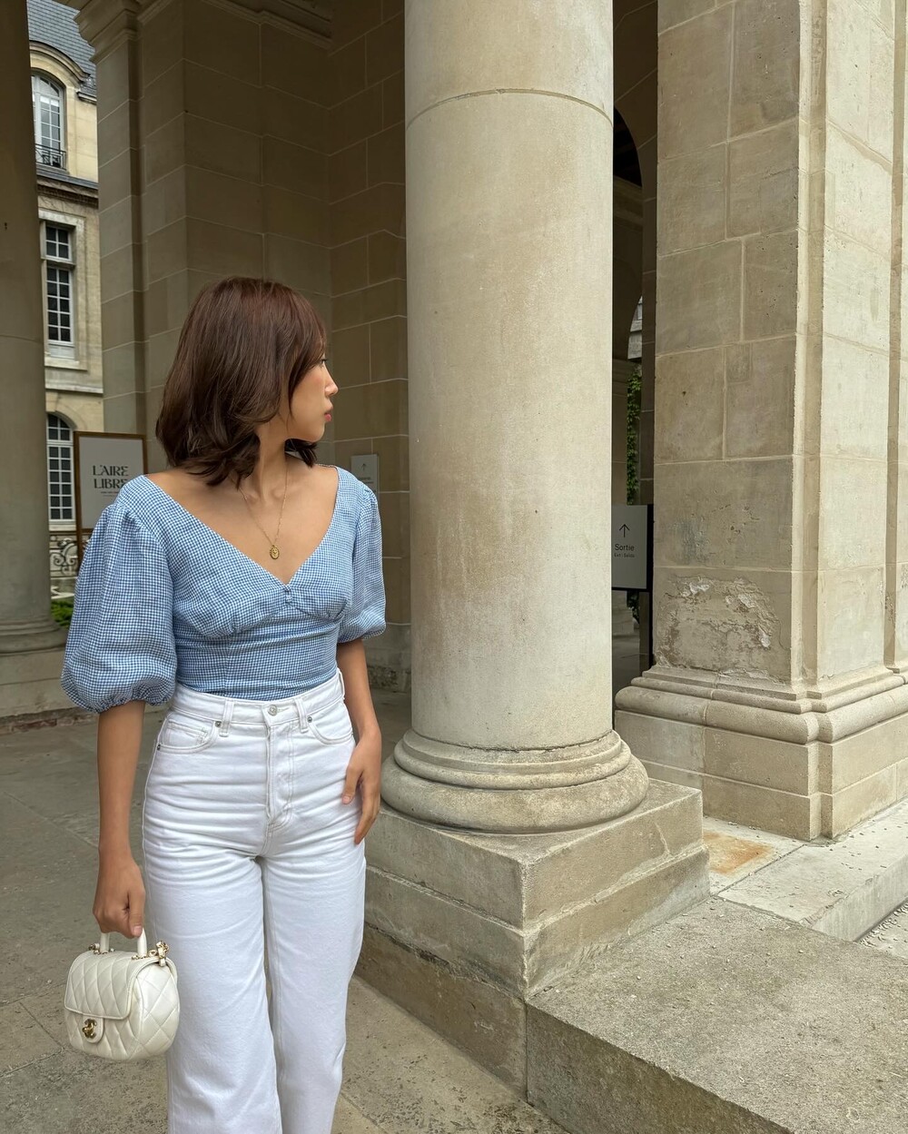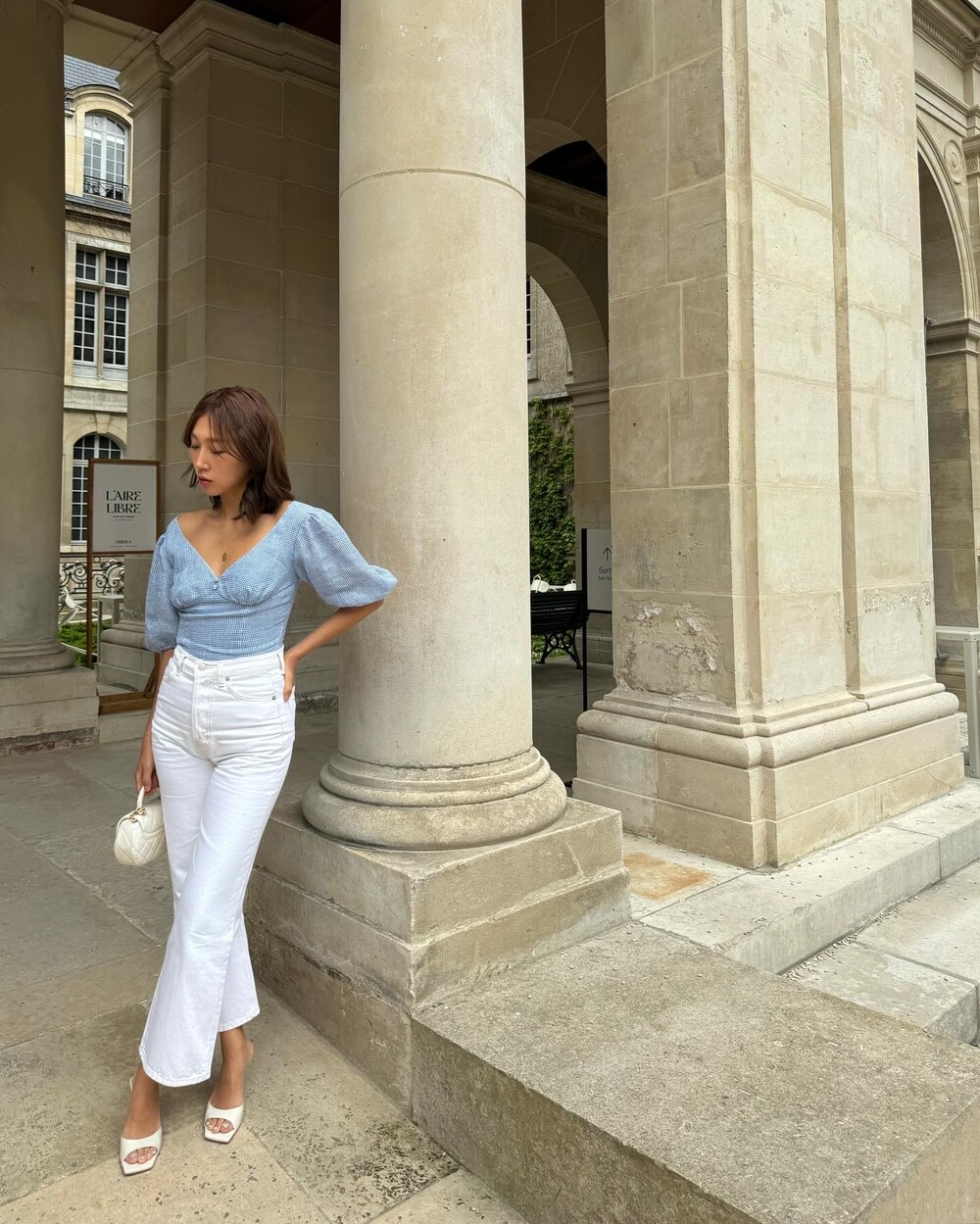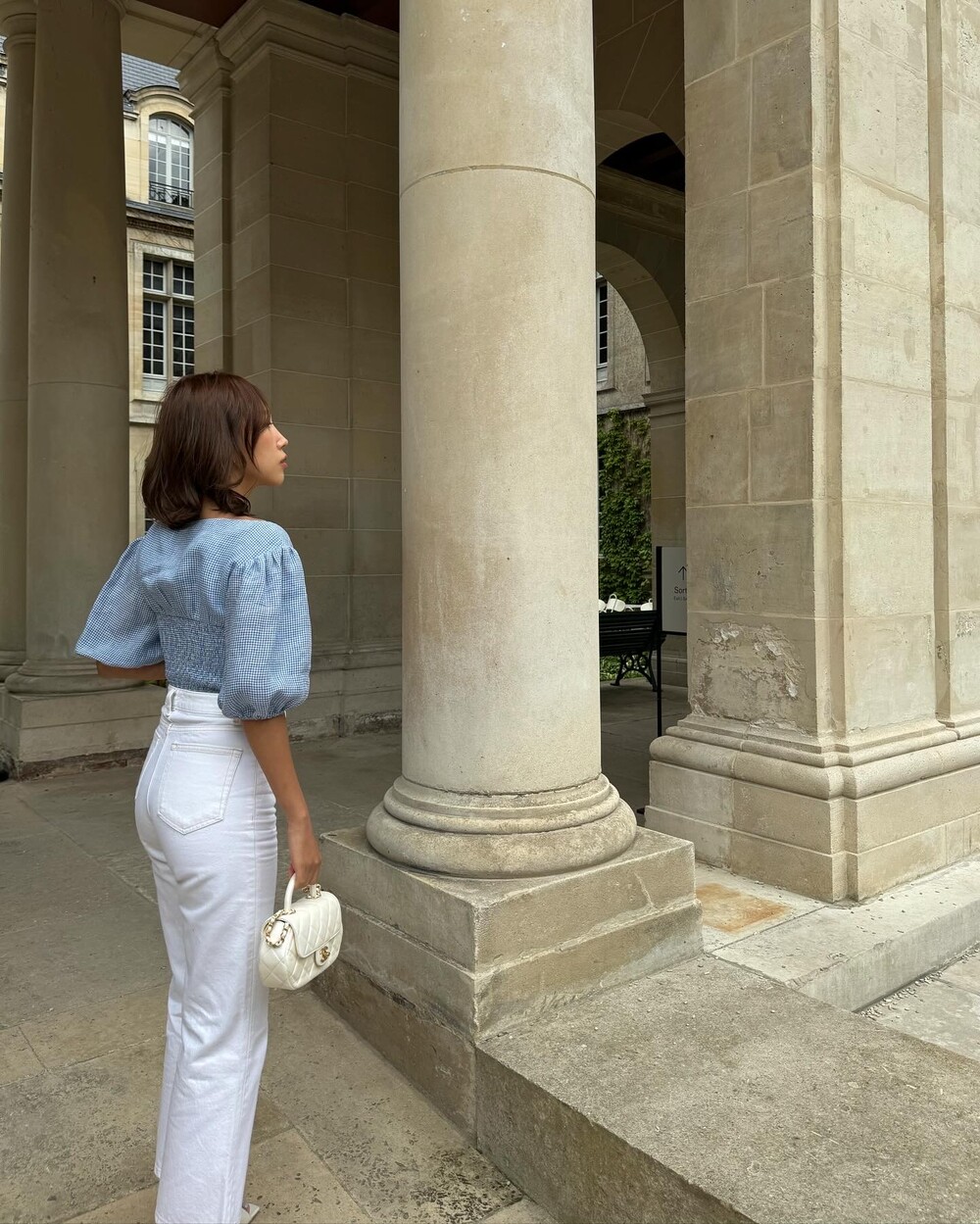 소재가 담백하게 린넨이여서 이 엘레강스한 블라우스를 충분히 캐주얼하게 활용할 수도 있구요.