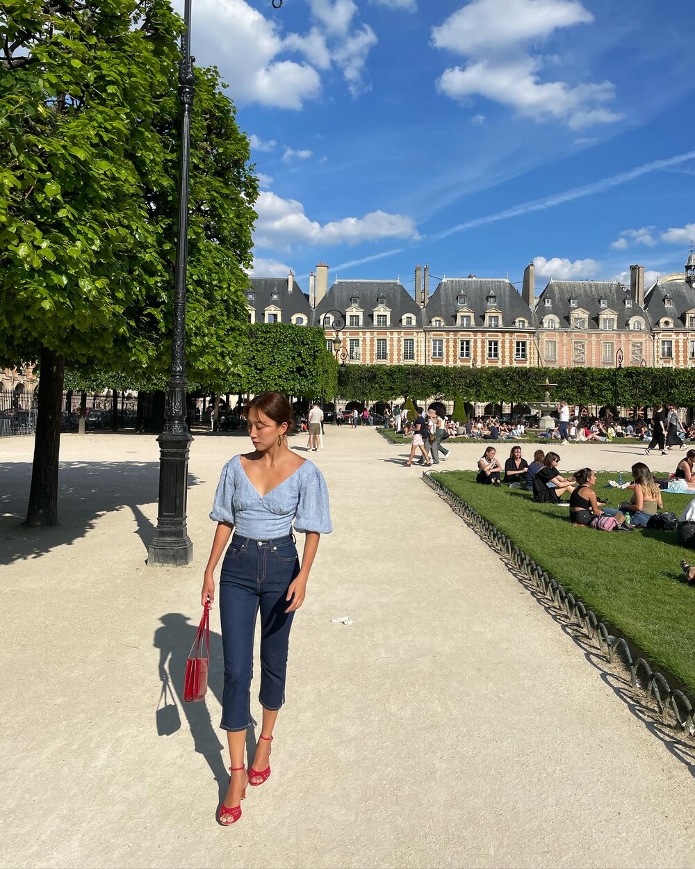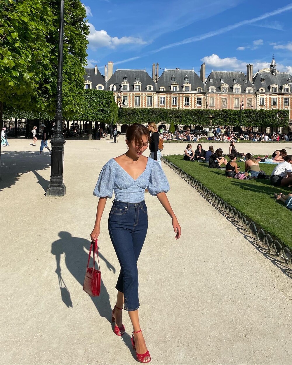 4.5부 즈음 되는 넉넉한 기장의 풍성한 퍼프소매와 와이드 하트넥, 그리고 조핏한 바디실루엣의 균형잡힌 하모니는 90‘s의 페미닌- 클래식의 진수를 느끼기에 충분합니다.