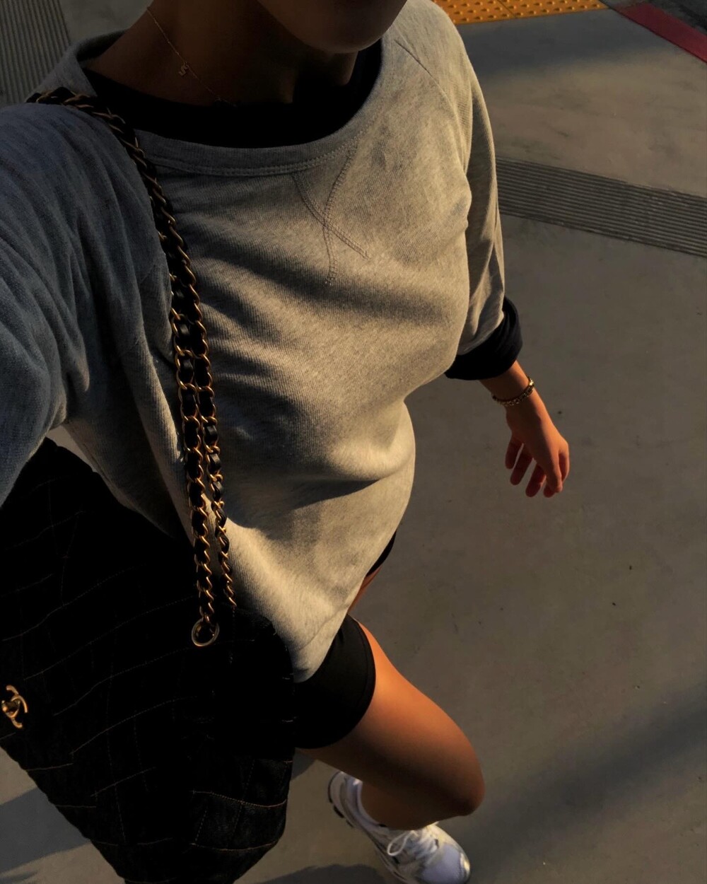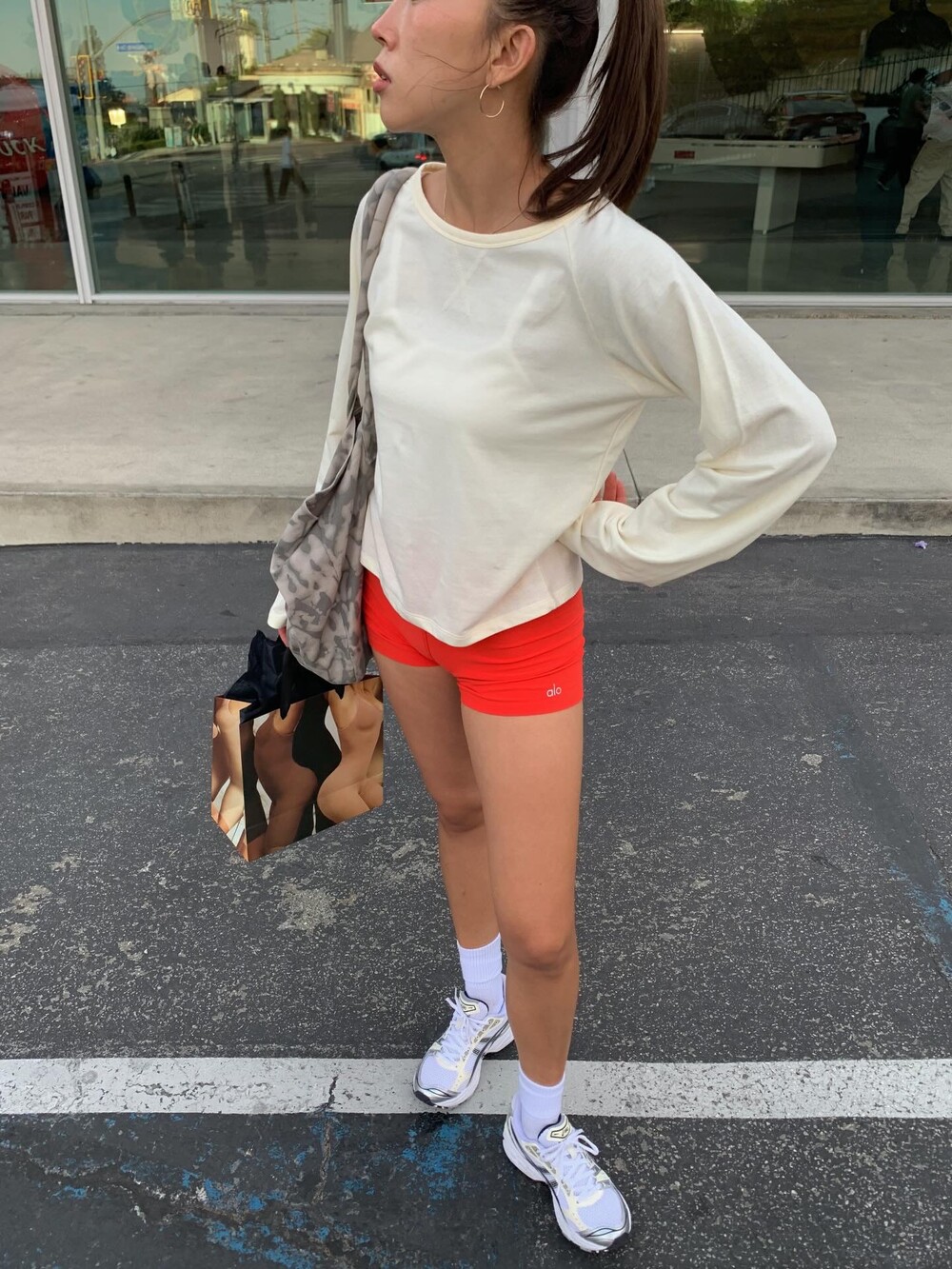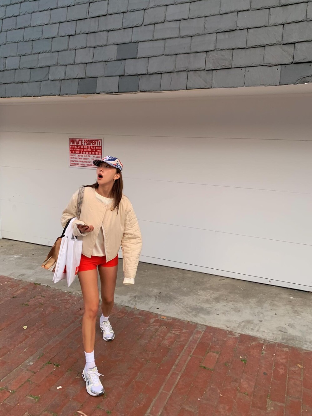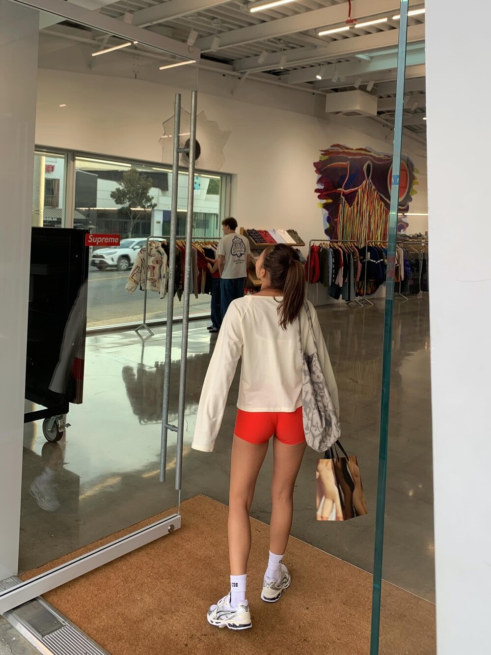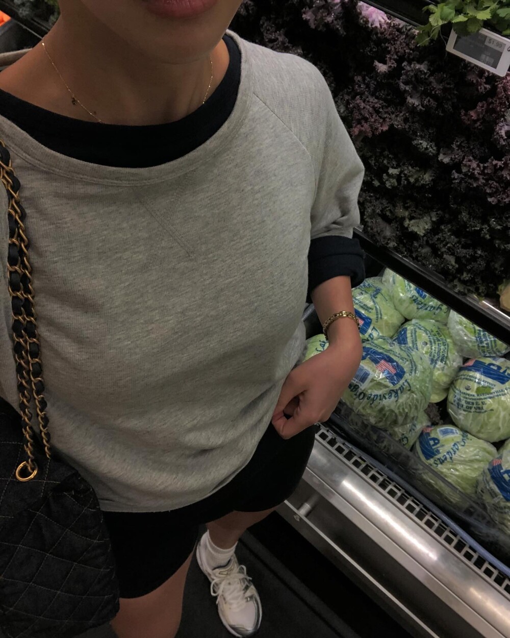위에서 말씀드렸 듯 이 넥라인 하나로 스포츠 웨어에 매치해도 은근한 페미닌 무드가 연출되기 때문에