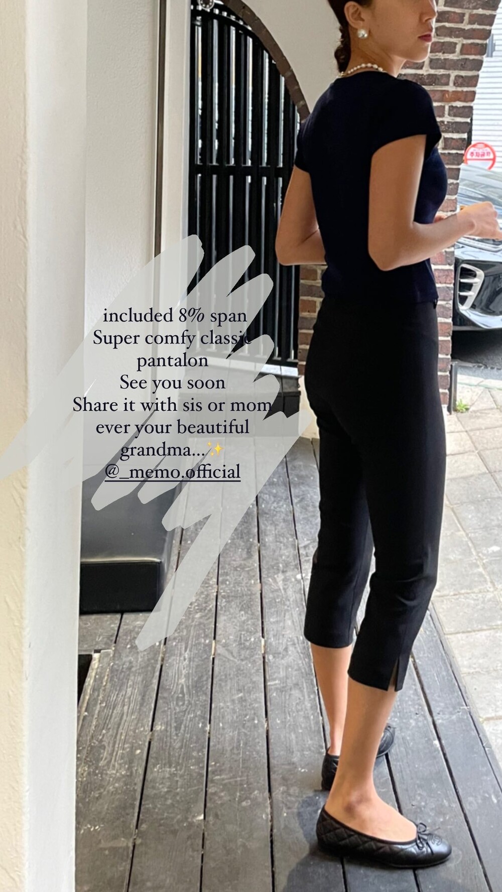 영화 속 오드리햅번처럼 타이트한 슬랙스를 입고도 우아하게 자전거를 탈 수 있음 해서 스판 혼용률이 아주 낭낭한 소재로 초이스했습니다. 형태변형 방지를 위한 후가공 작업도 추가했으니 지나친 늘어남이나 수축은 걱정하지 않으셔도 될 듯해요.