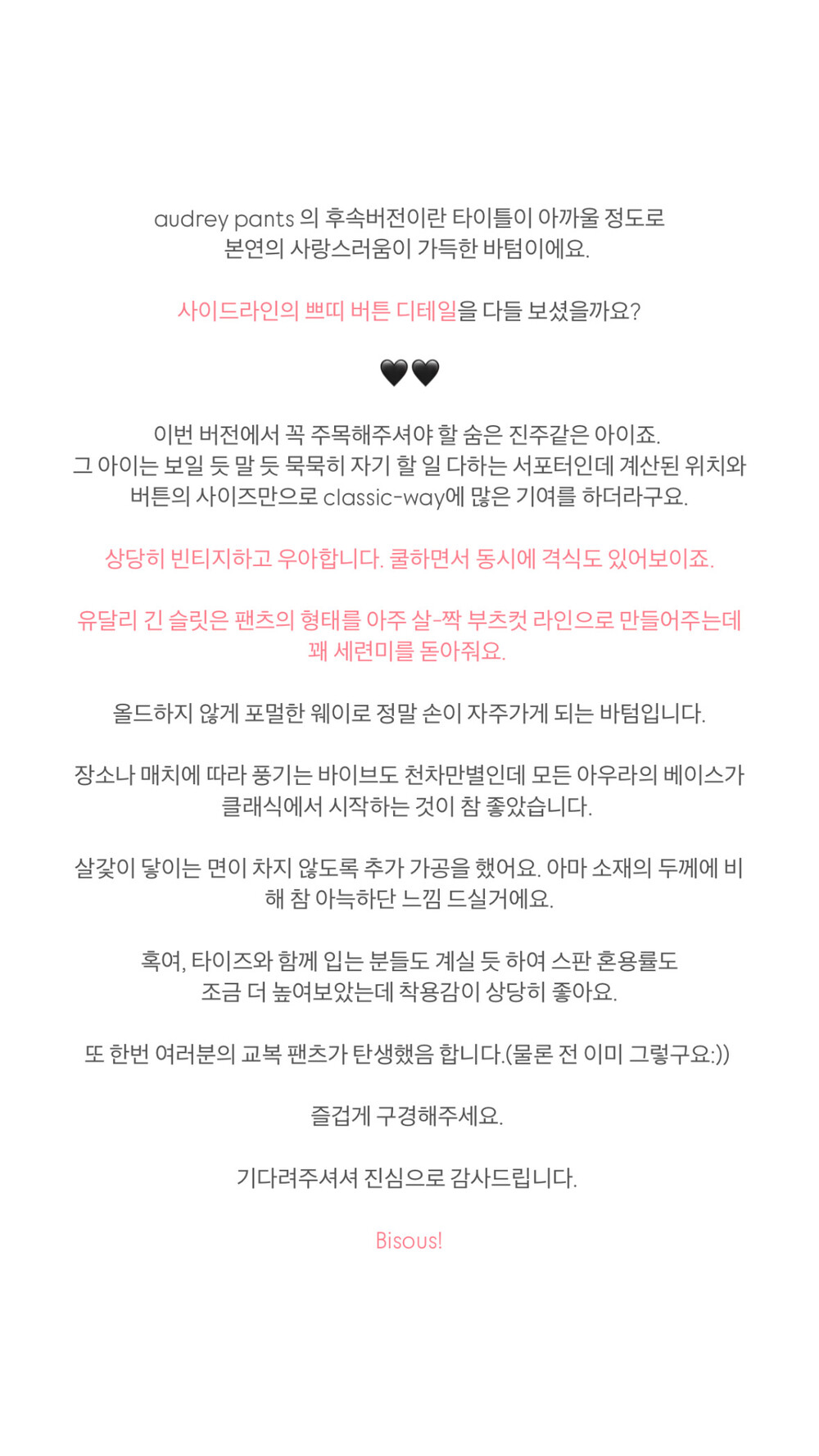 *audrey pants에 비해 스판 혼용률이 더 높은 소재입니다. 같은 사이즈라 해도 더 릴렉스한 착용감이 느껴지실 수 있습니다.