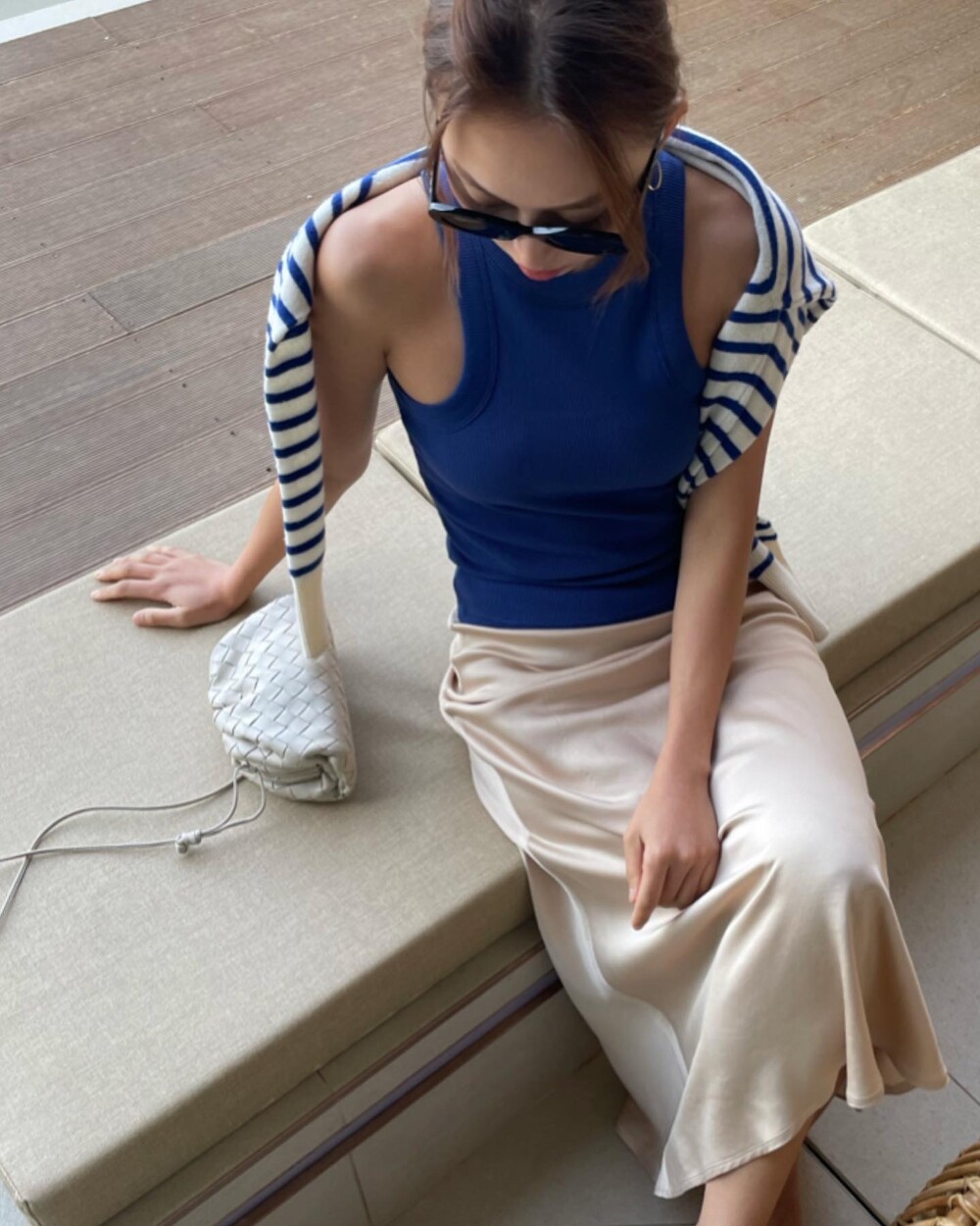 져지탑과 매치하면 심플한 캐쥬얼 룩이 되구요, 그 위에 간단한 재킷만 걸쳐도 드레시한 이브닝 룩을 완성하죠.