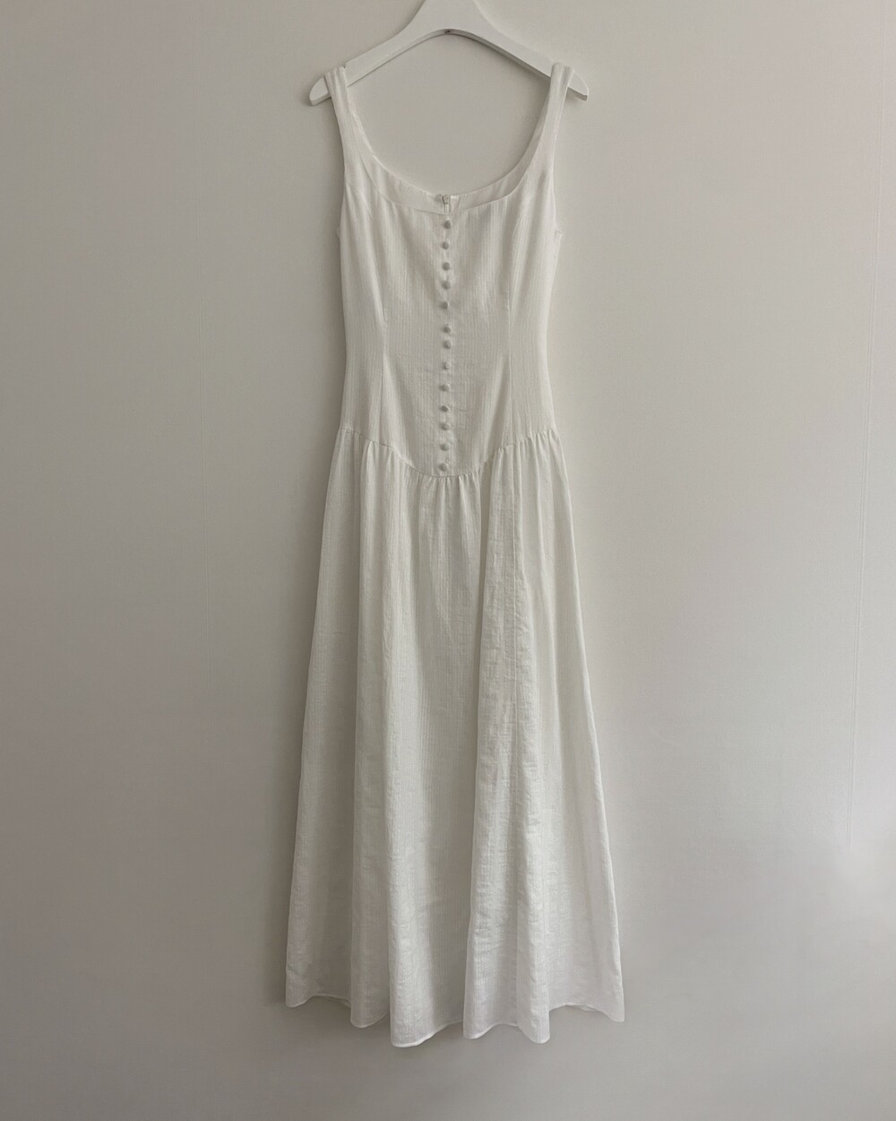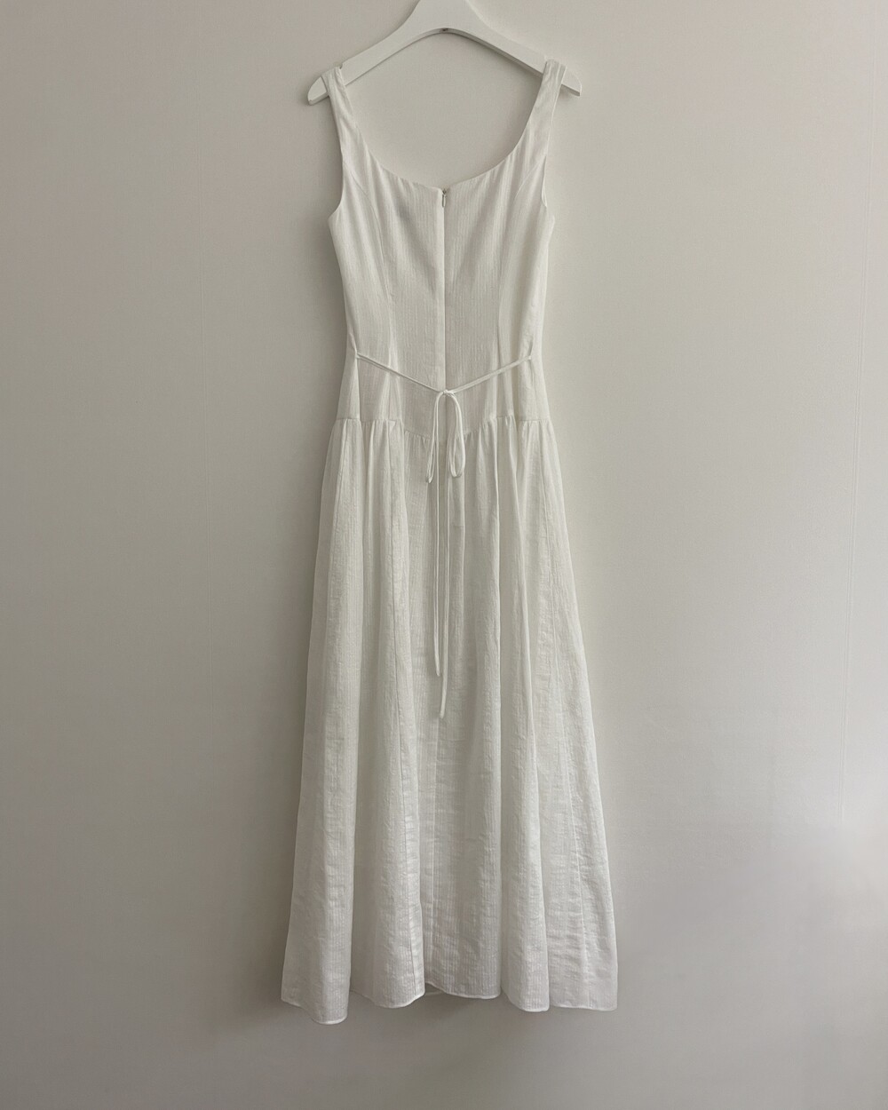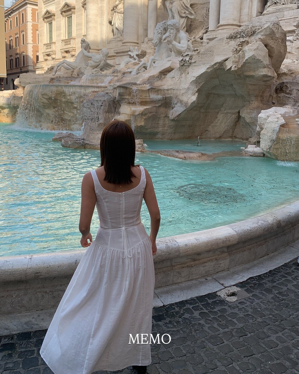 라운드 쉐입으로 잘 다듬어진 스쿱넥은 또 어떻구요! 잘 보시면 끈 두께마저 다르게 전개됩니다. (일자 아님 유의!) 끈이 어깨로 올라갈 수 록 면적이 넓어지는데, 승모를 조금 더 덮어 어꺠라인이 수평으로 보여지게 하고, 윗 가슴엔 적절한 볼륨감이 느껴지는 글래머러스한 시각적 효과가 있어 더 많이 날씬해보이기도 하지요.