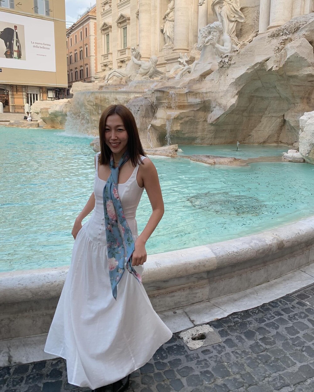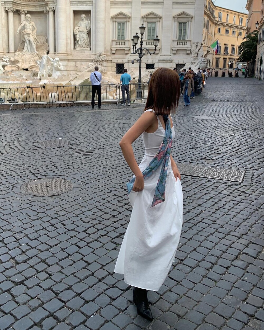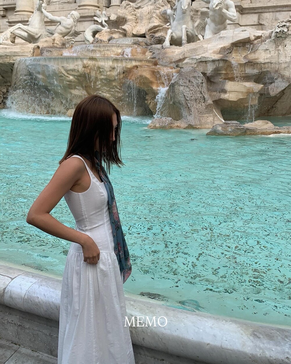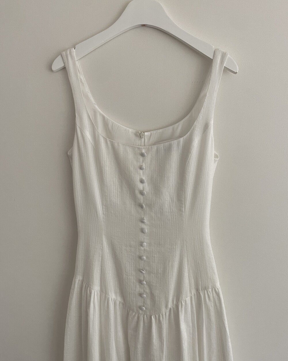 라운드 쉐입으로 잘 다듬어진 스쿱넥은 또 어떻구요! 잘 보시면 끈 두께마저 다르게 전개됩니다. (일자 아님 유의!) 끈이 어깨로 올라갈 수 록 면적이 넓어지는데, 승모를 조금 더 덮어 어꺠라인이 수평으로 보여지게 하고, 윗 가슴엔 적절한 볼륨감이 느껴지는 글래머러스한 시각적 효과가 있어 더 많이 날씬해보이기도 하지요.