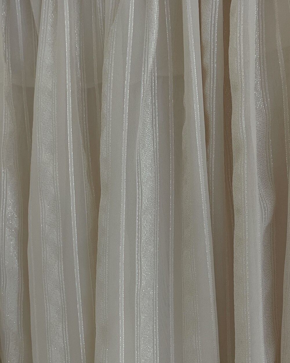 -상품의 면적을 넓게 설정하여 움직임에 따라 소재의 반짝임이 돋보이도록 하고 이 사랑스러운 색감과 가벼움을 몸 소 느낄 수 있도록 가봉할 것.