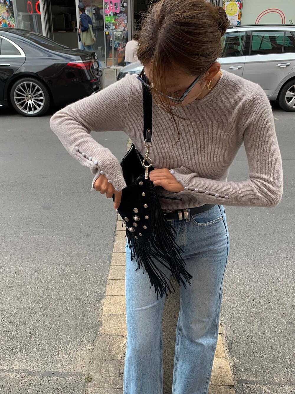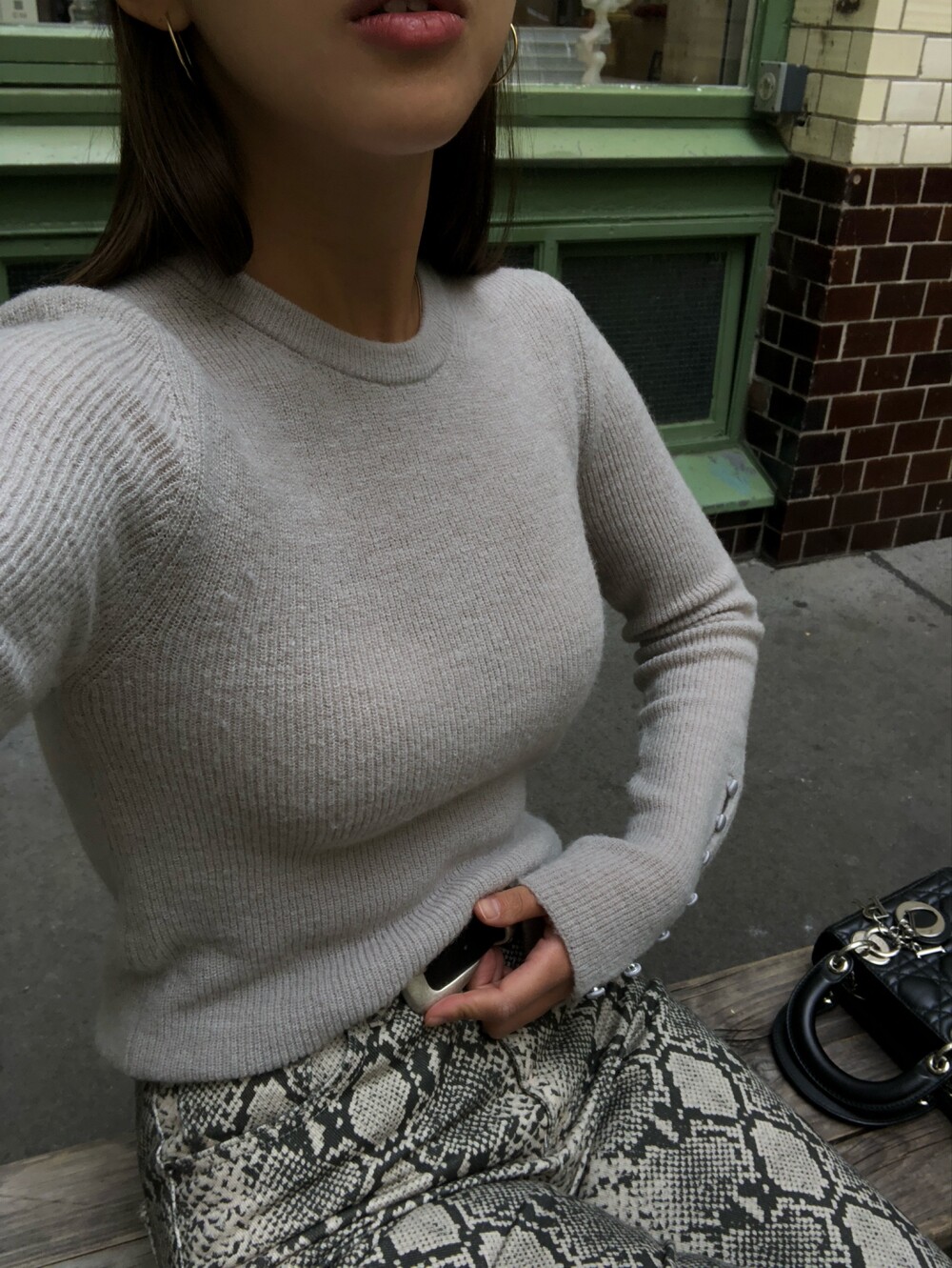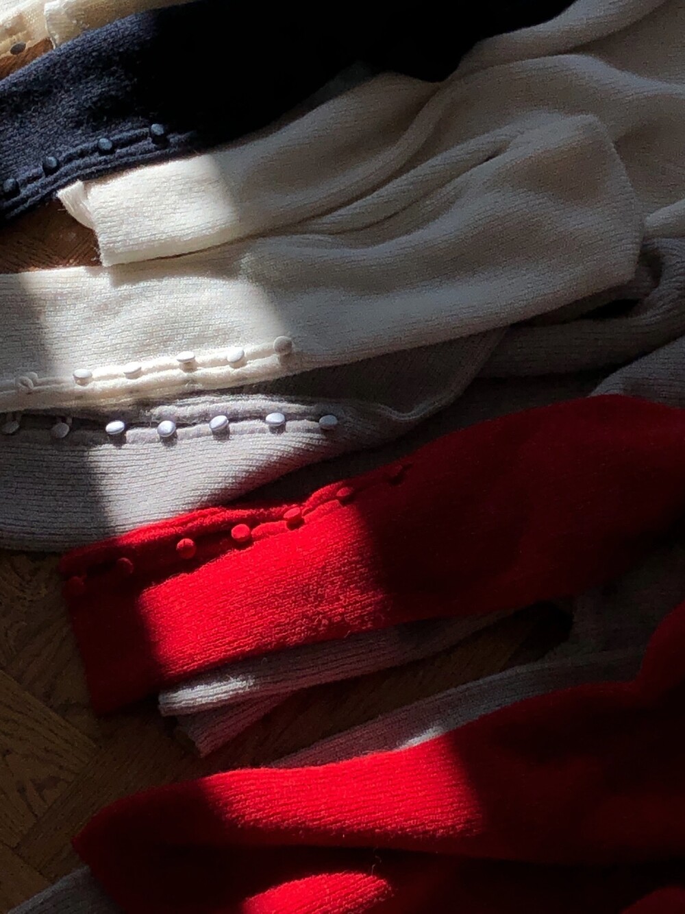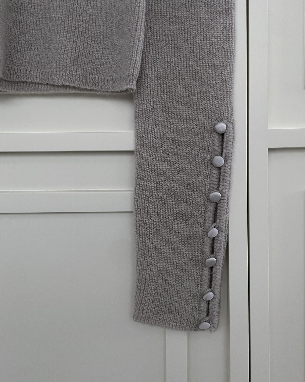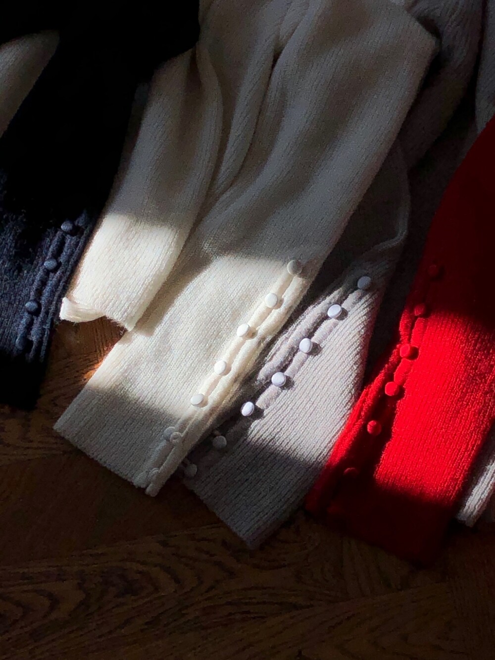 버튼을 싸는 소재가 니뜨원사와 다른 사틴계열이라, 같은 컬러의 이 작은 버튼 디테일이 묻히질 않아요.
