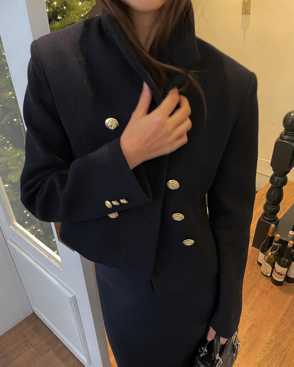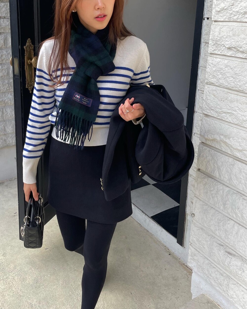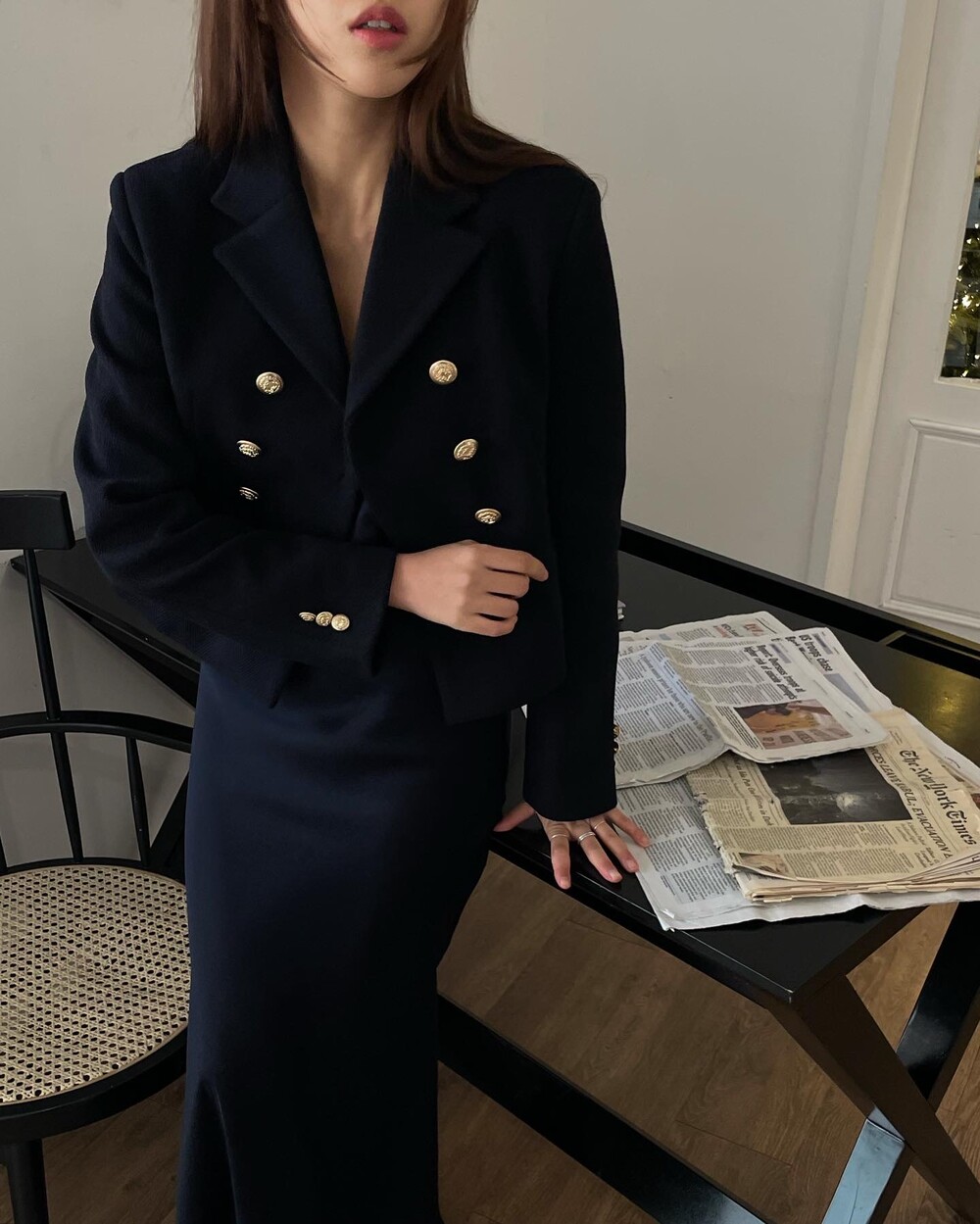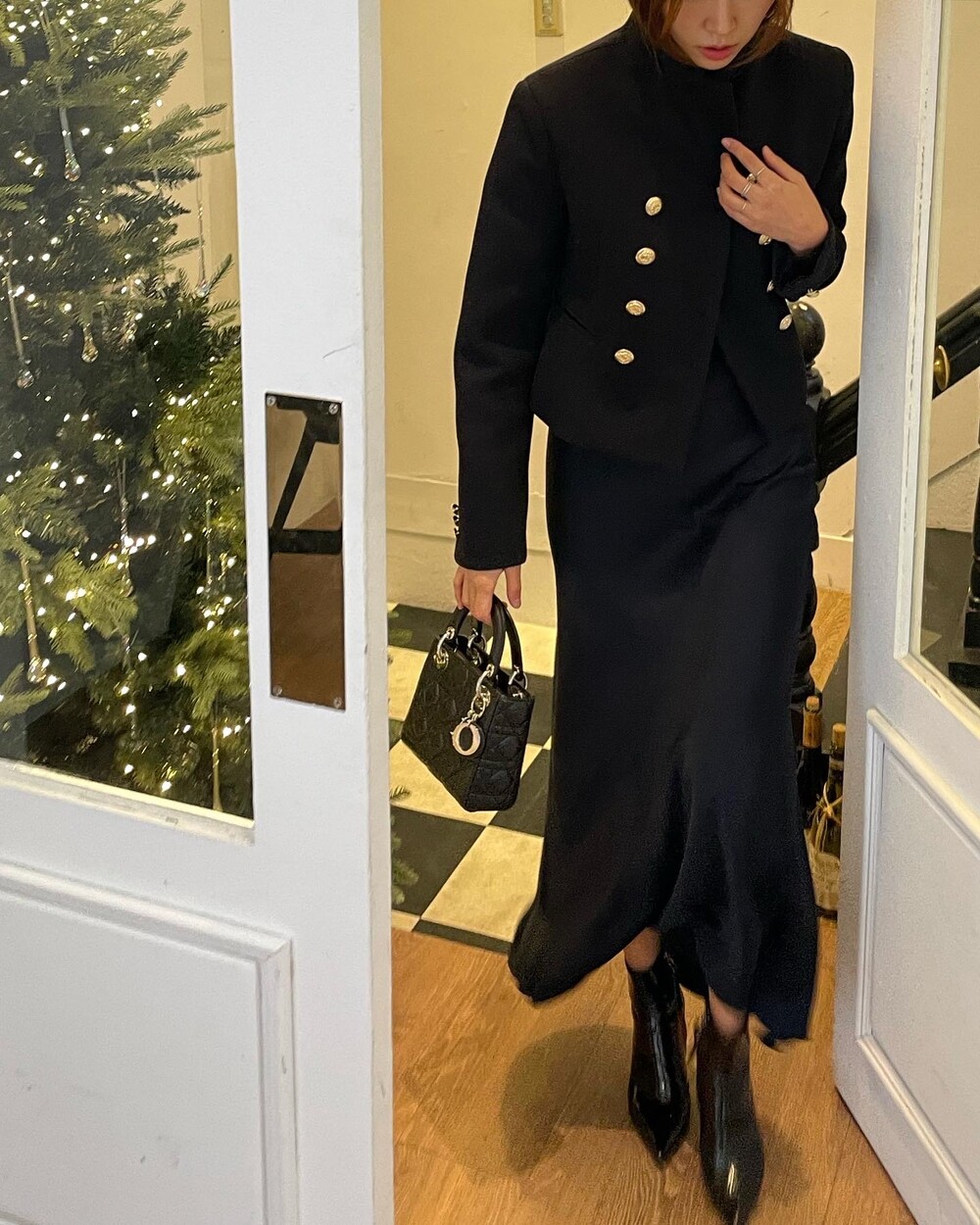 해당 상품 섹션에서 소개해드리겠지만, A라인과 H라인 그 중간즈음 실루엣을 가지는 매력적인 미니스커트와의 앙상블은 그야말로 탄성을 자아냅니다. 딥한 네이비컬러에 환상적으로 잘 어우러지는 섬세한 헤링본 텍스쳐는 아주 독창적인데 은은하고 흔치않아 더욱 매력적입니다. 캐시미어까지 블랜드 되어있으니 더욱 솔깃하시겠죠?☺️간결한 클래식 룩입니다. 즐겁게 봐주세요.