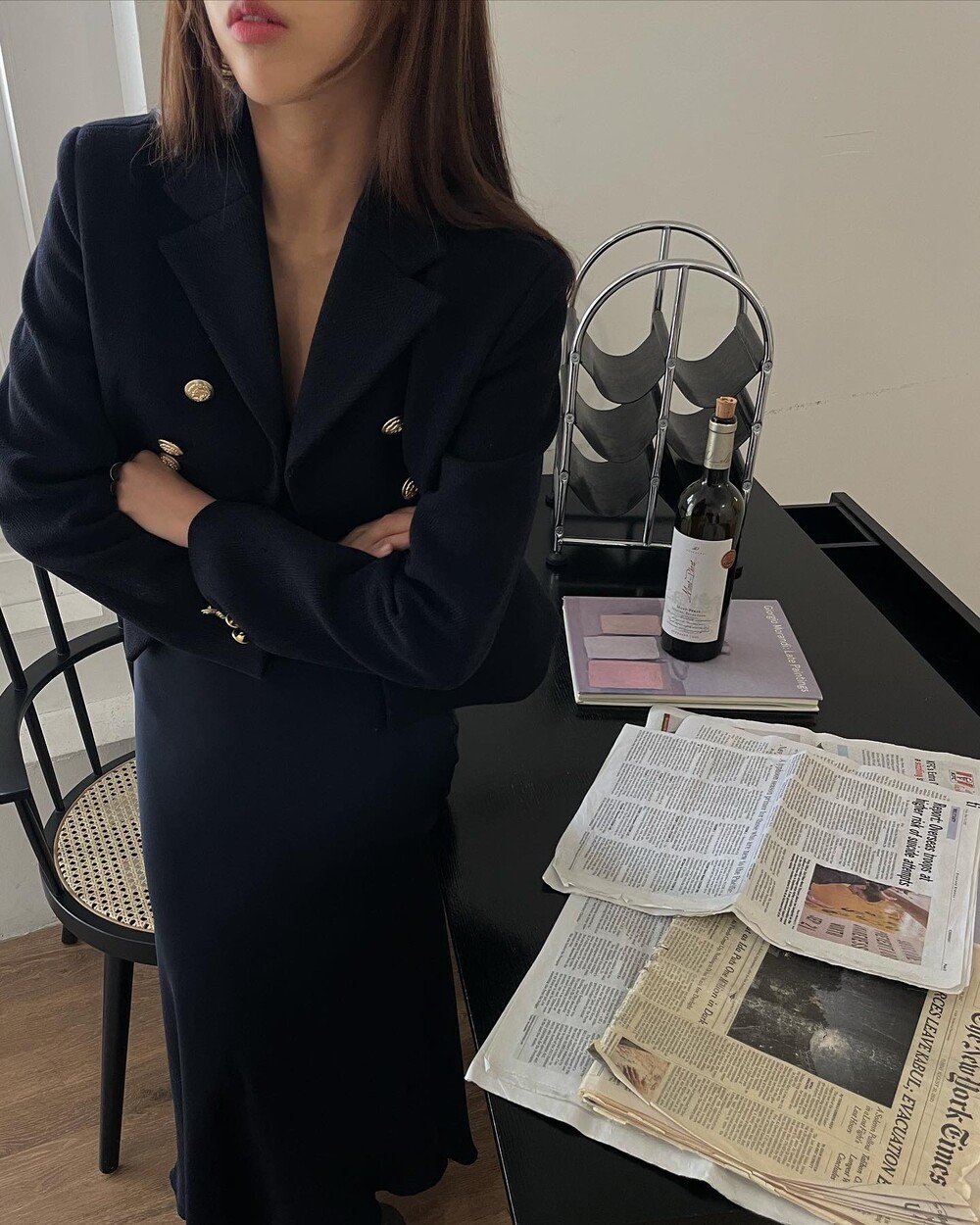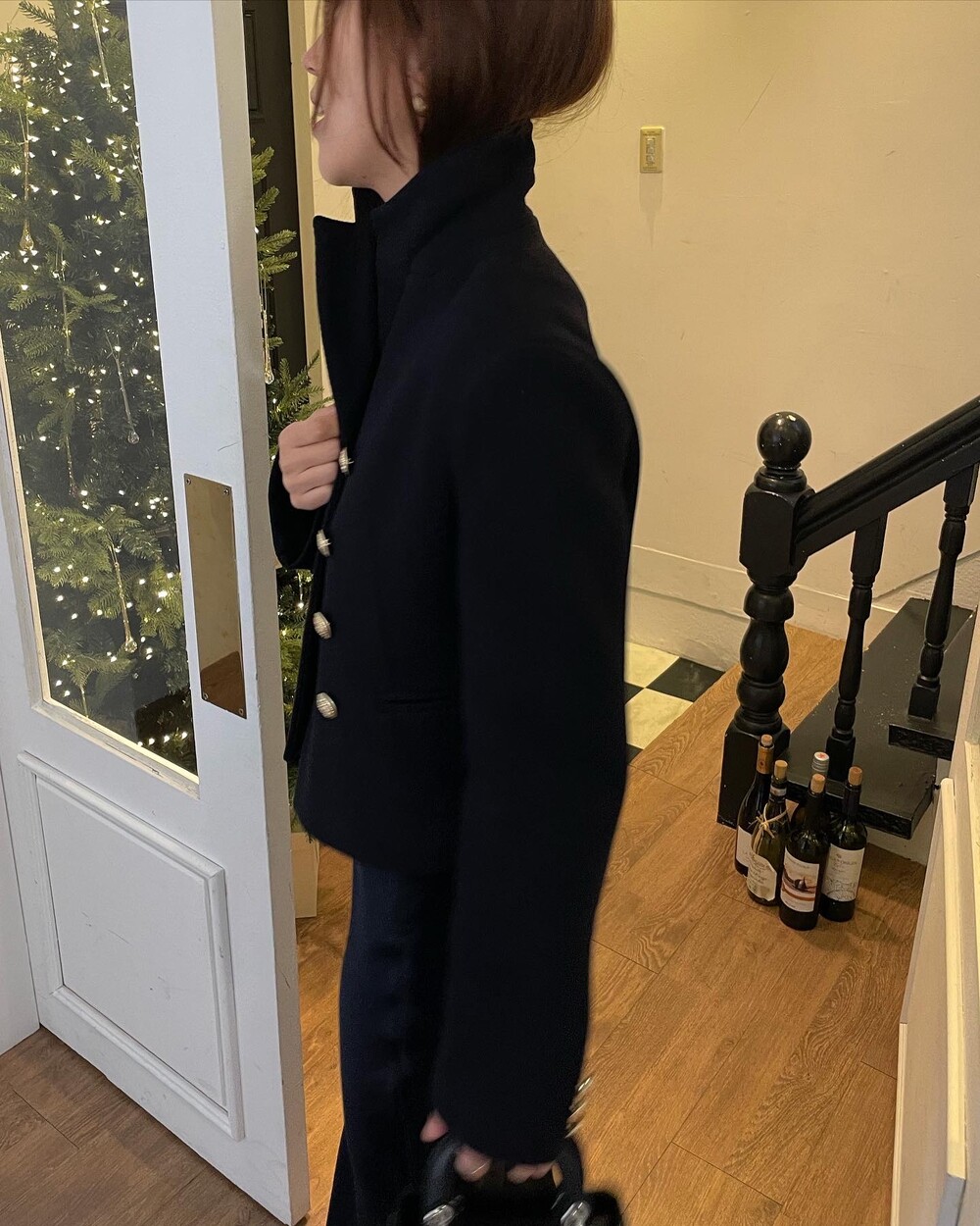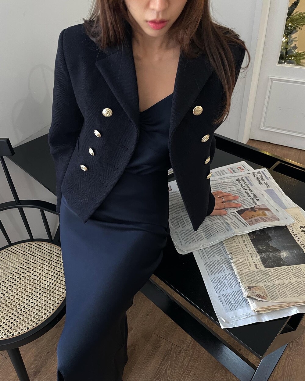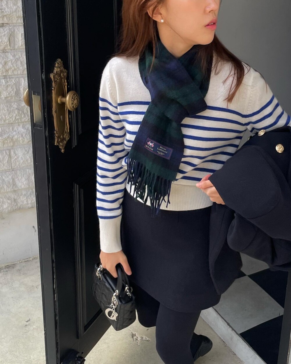 해당 상품 섹션에서 소개해드리겠지만, A라인과 H라인 그 중간즈음 실루엣을 가지는 매력적인 미니스커트와의 앙상블은 그야말로 탄성을 자아냅니다. 딥한 네이비컬러에 환상적으로 잘 어우러지는 섬세한 헤링본 텍스쳐는 아주 독창적인데 은은하고 흔치않아 더욱 매력적입니다. 캐시미어까지 블랜드 되어있으니 더욱 솔깃하시겠죠?☺️간결한 클래식 룩입니다. 즐겁게 봐주세요.