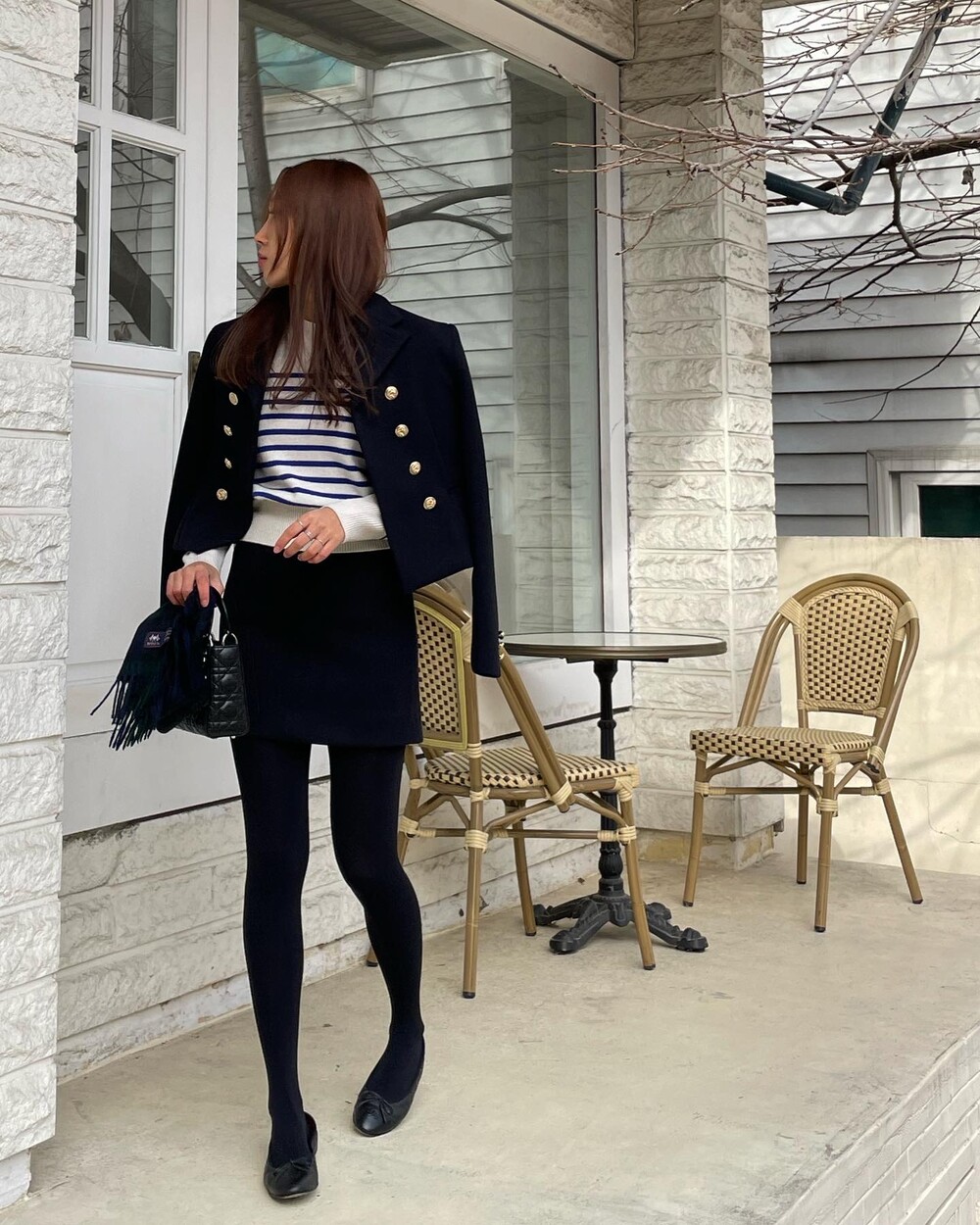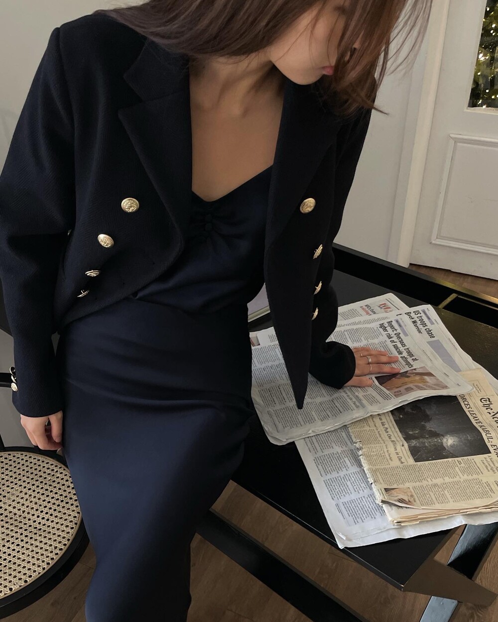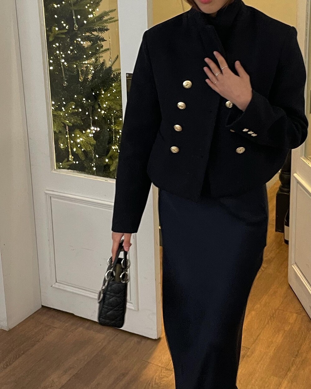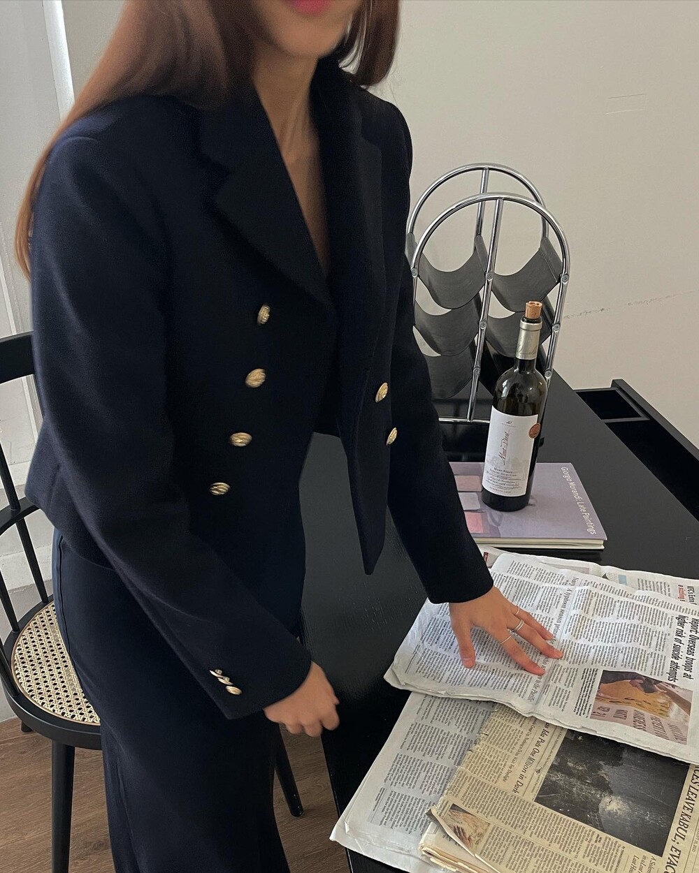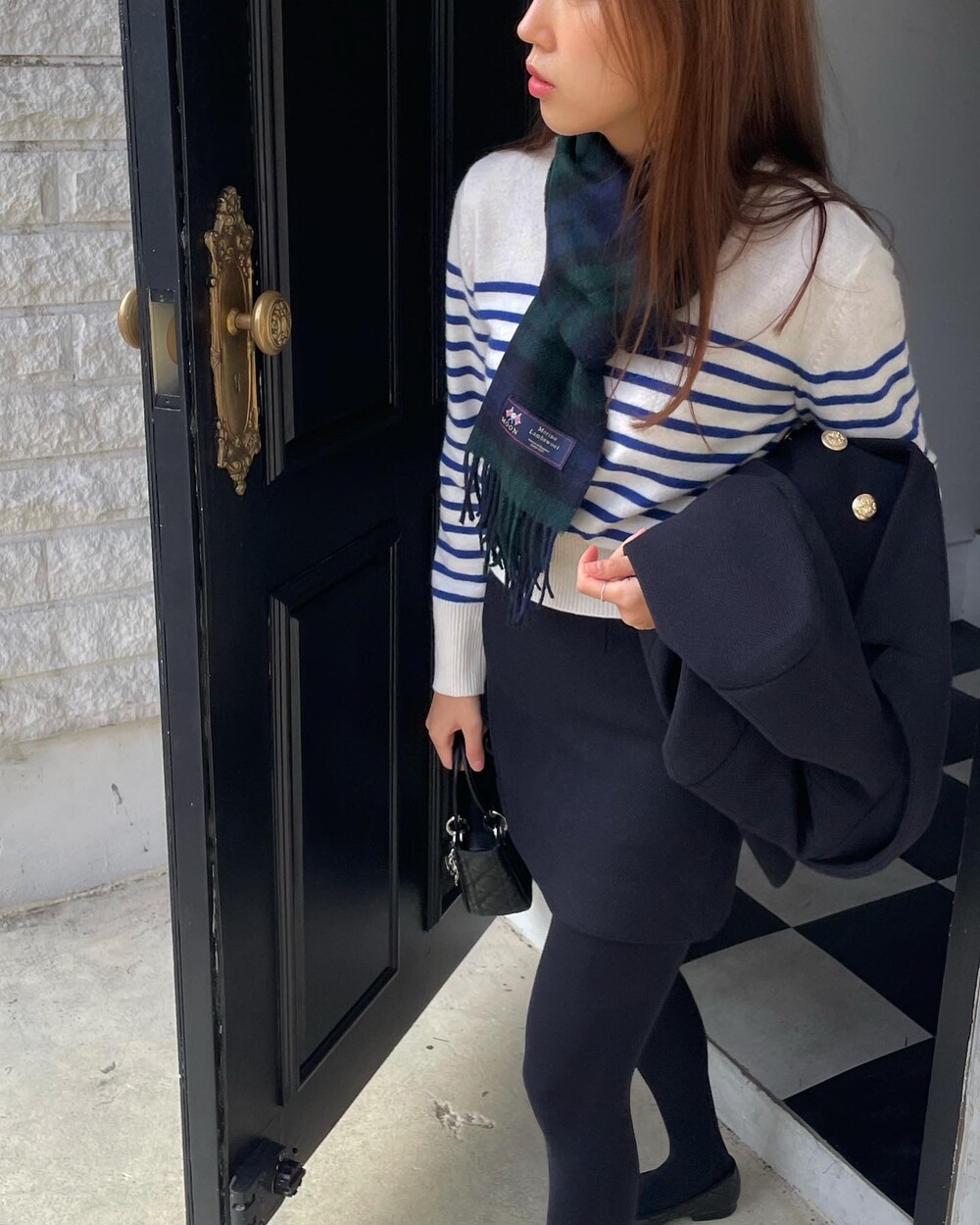 해당 상품 섹션에서 소개해드리겠지만, A라인과 H라인 그 중간즈음 실루엣을 가지는 매력적인 미니스커트와의 앙상블은 그야말로 탄성을 자아냅니다. 딥한 네이비컬러에 환상적으로 잘 어우러지는 섬세한 헤링본 텍스쳐는 아주 독창적인데 은은하고 흔치않아 더욱 매력적입니다. 캐시미어까지 블랜드 되어있으니 더욱 솔깃하시겠죠?☺️간결한 클래식 룩입니다. 즐겁게 봐주세요.