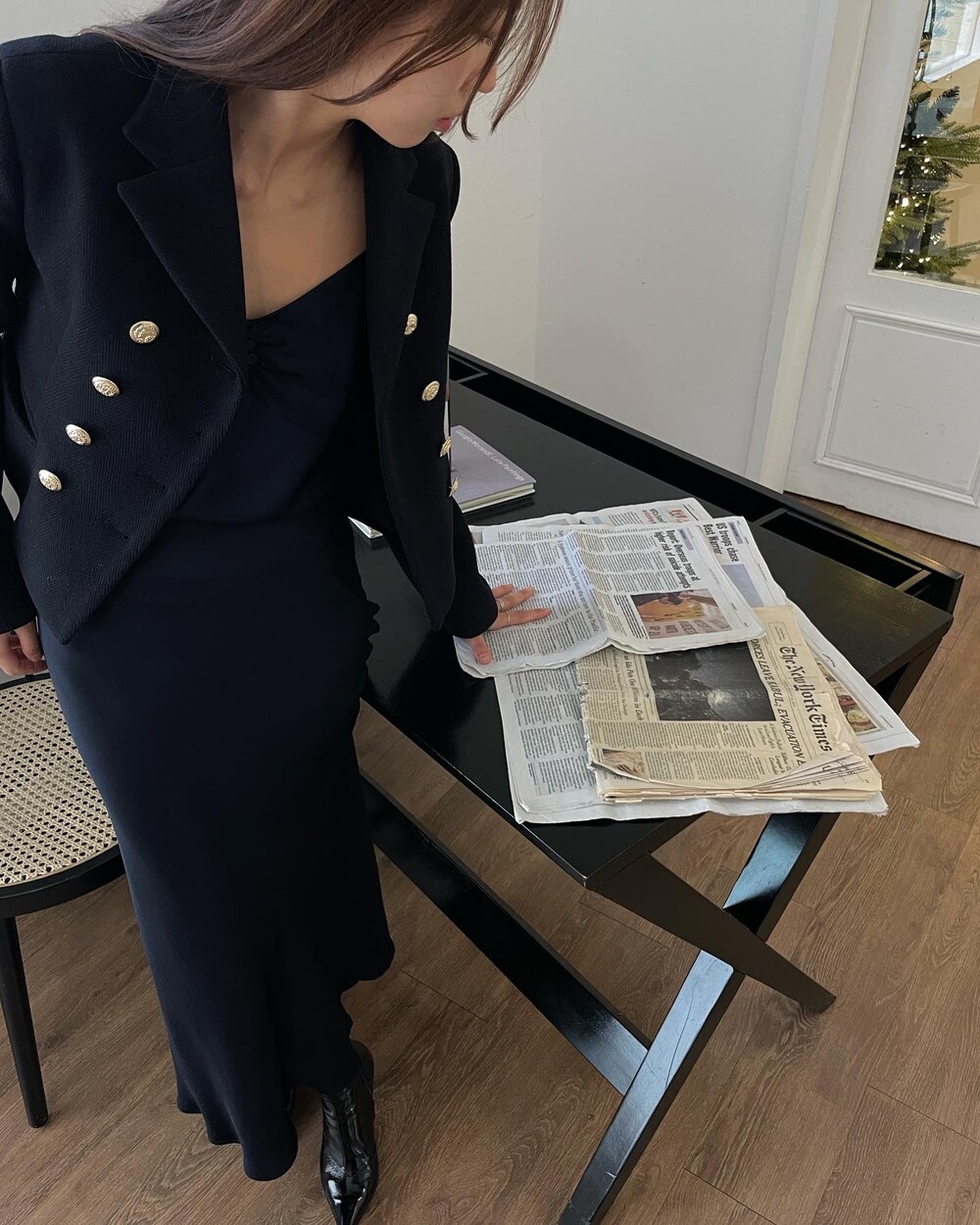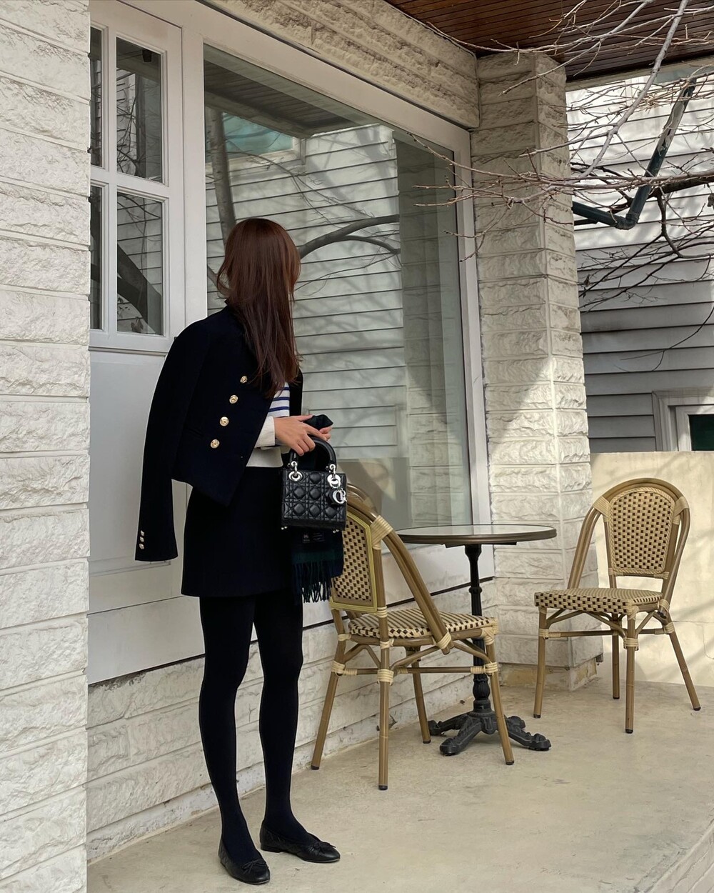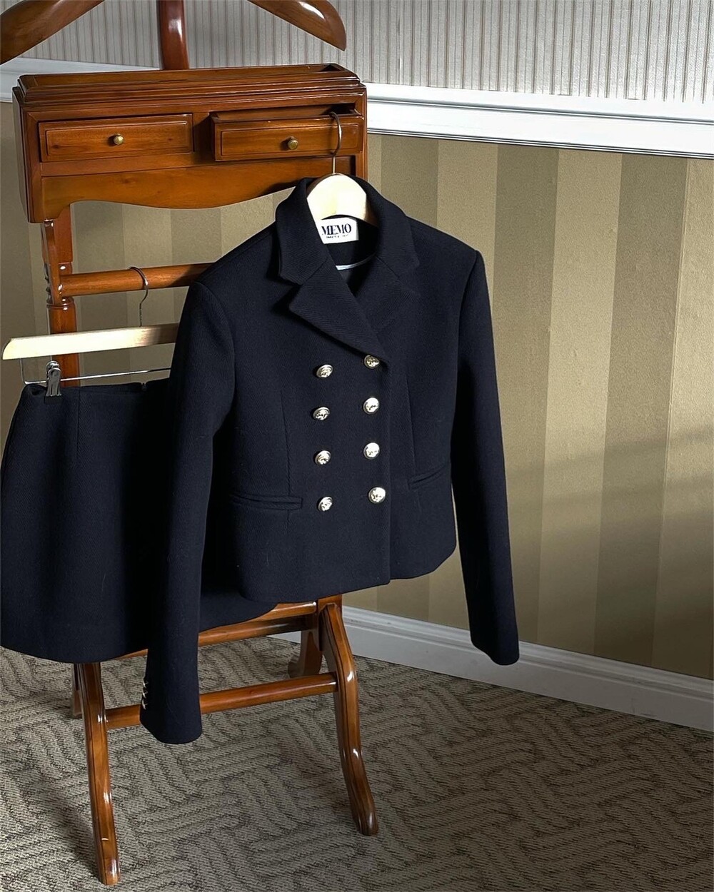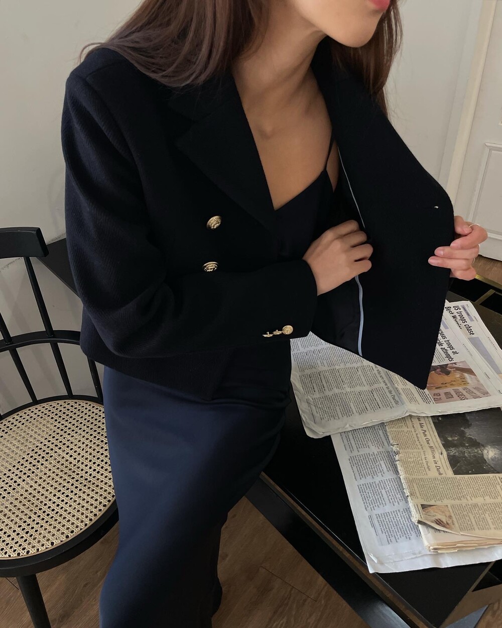 해당 상품 섹션에서 소개해드리겠지만, A라인과 H라인 그 중간즈음 실루엣을 가지는 매력적인 미니스커트와의 앙상블은 그야말로 탄성을 자아냅니다. 딥한 네이비컬러에 환상적으로 잘 어우러지는 섬세한 헤링본 텍스쳐는 아주 독창적인데 은은하고 흔치않아 더욱 매력적입니다. 캐시미어까지 블랜드 되어있으니 더욱 솔깃하시겠죠?☺️간결한 클래식 룩입니다. 즐겁게 봐주세요.