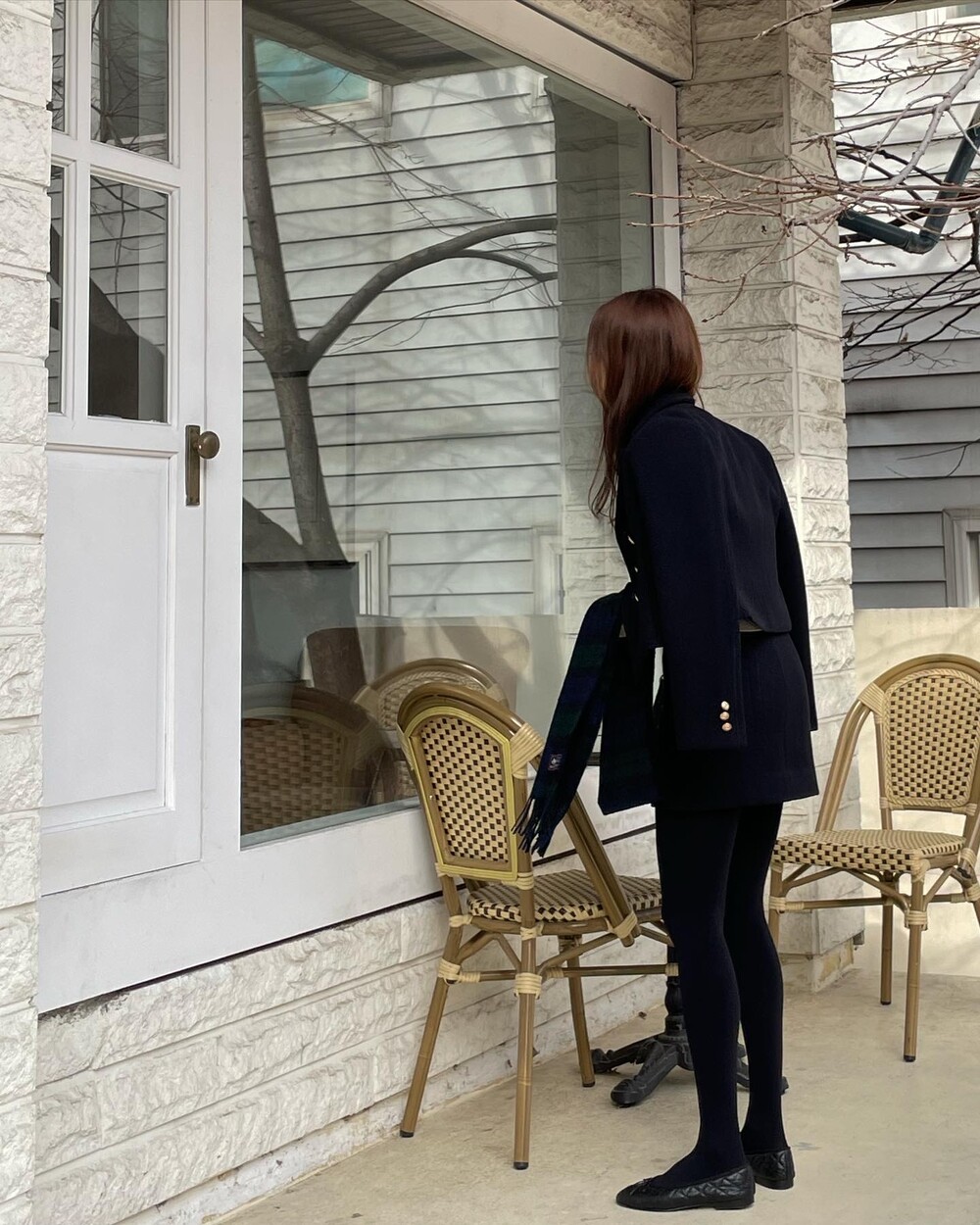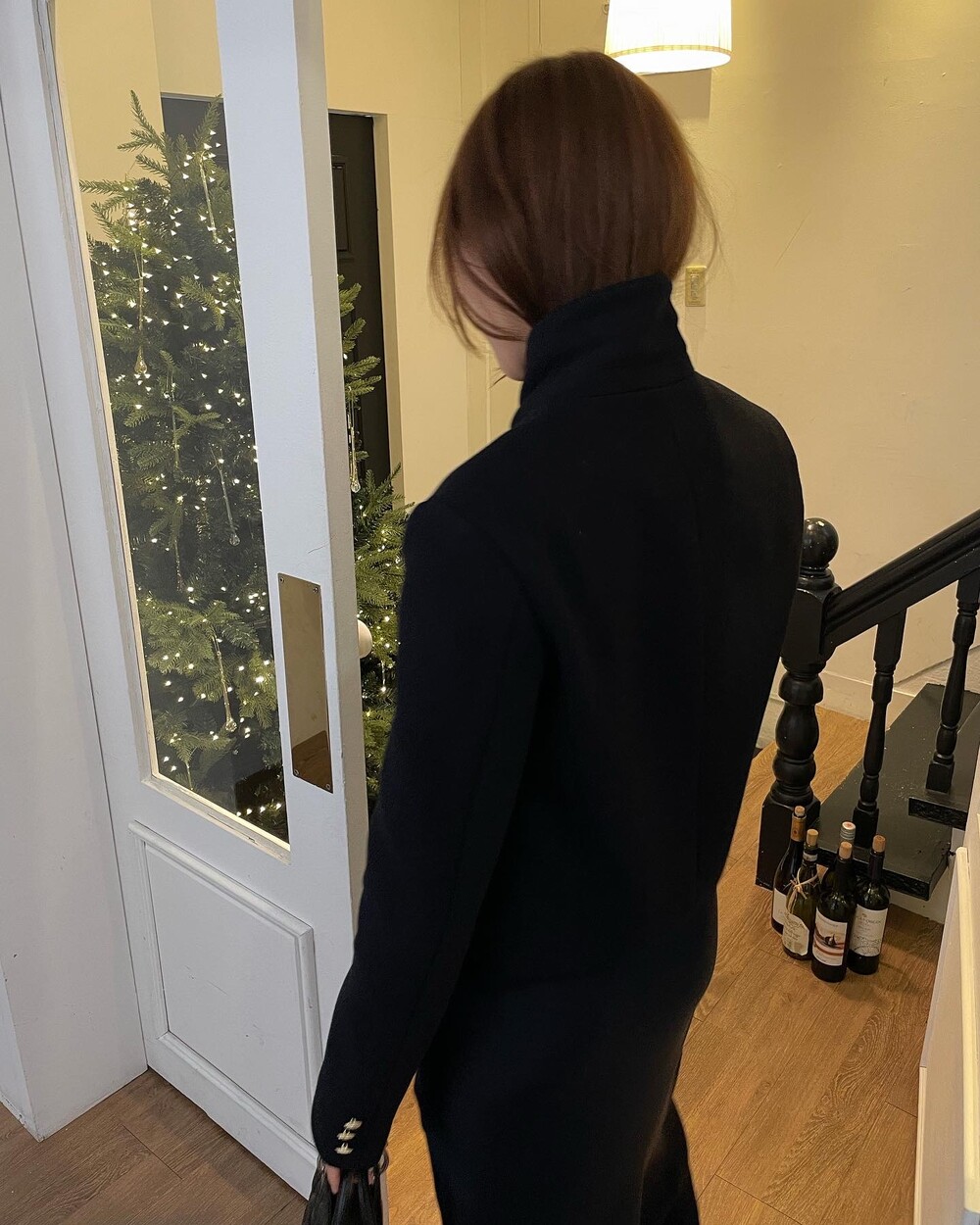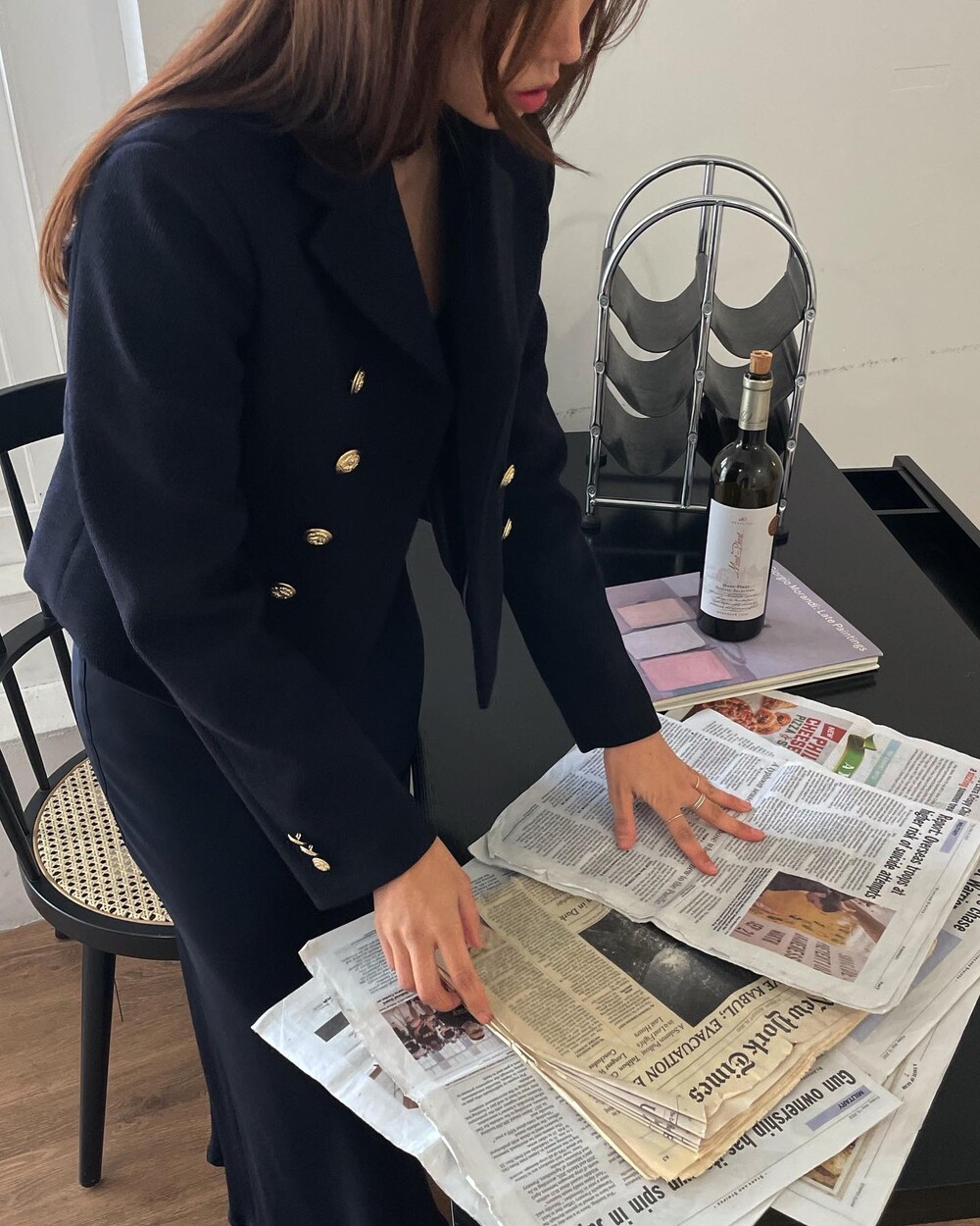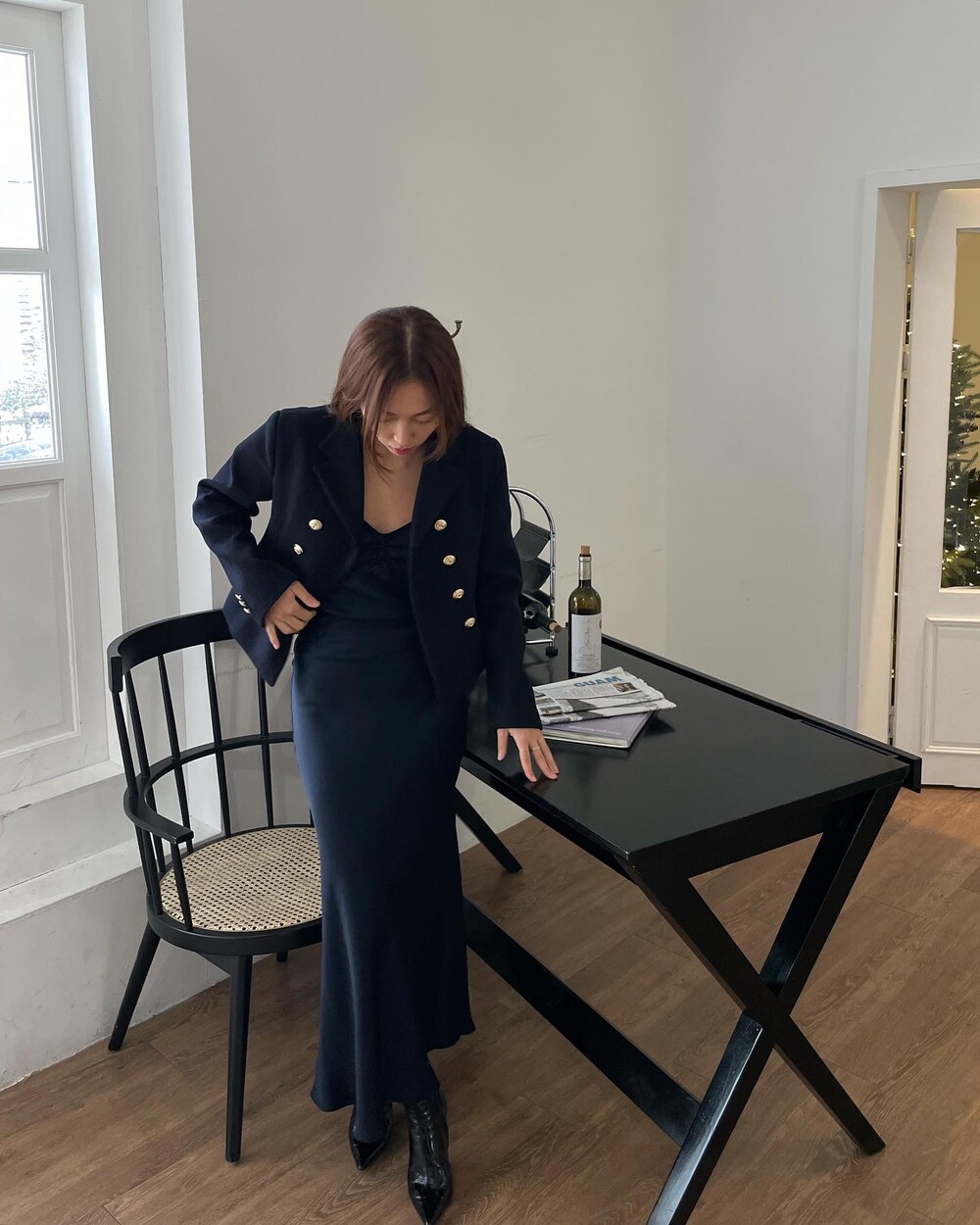 해당 상품 섹션에서 소개해드리겠지만, A라인과 H라인 그 중간즈음 실루엣을 가지는 매력적인 미니스커트와의 앙상블은 그야말로 탄성을 자아냅니다. 딥한 네이비컬러에 환상적으로 잘 어우러지는 섬세한 헤링본 텍스쳐는 아주 독창적인데 은은하고 흔치않아 더욱 매력적입니다. 캐시미어까지 블랜드 되어있으니 더욱 솔깃하시겠죠?☺️간결한 클래식 룩입니다. 즐겁게 봐주세요.