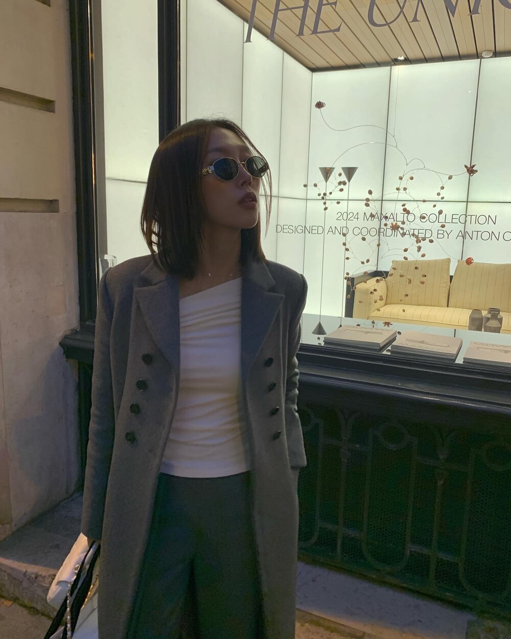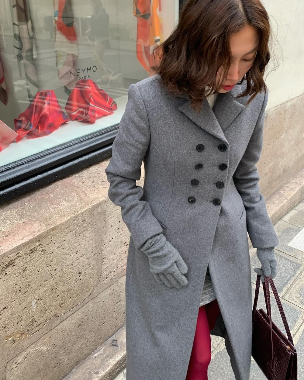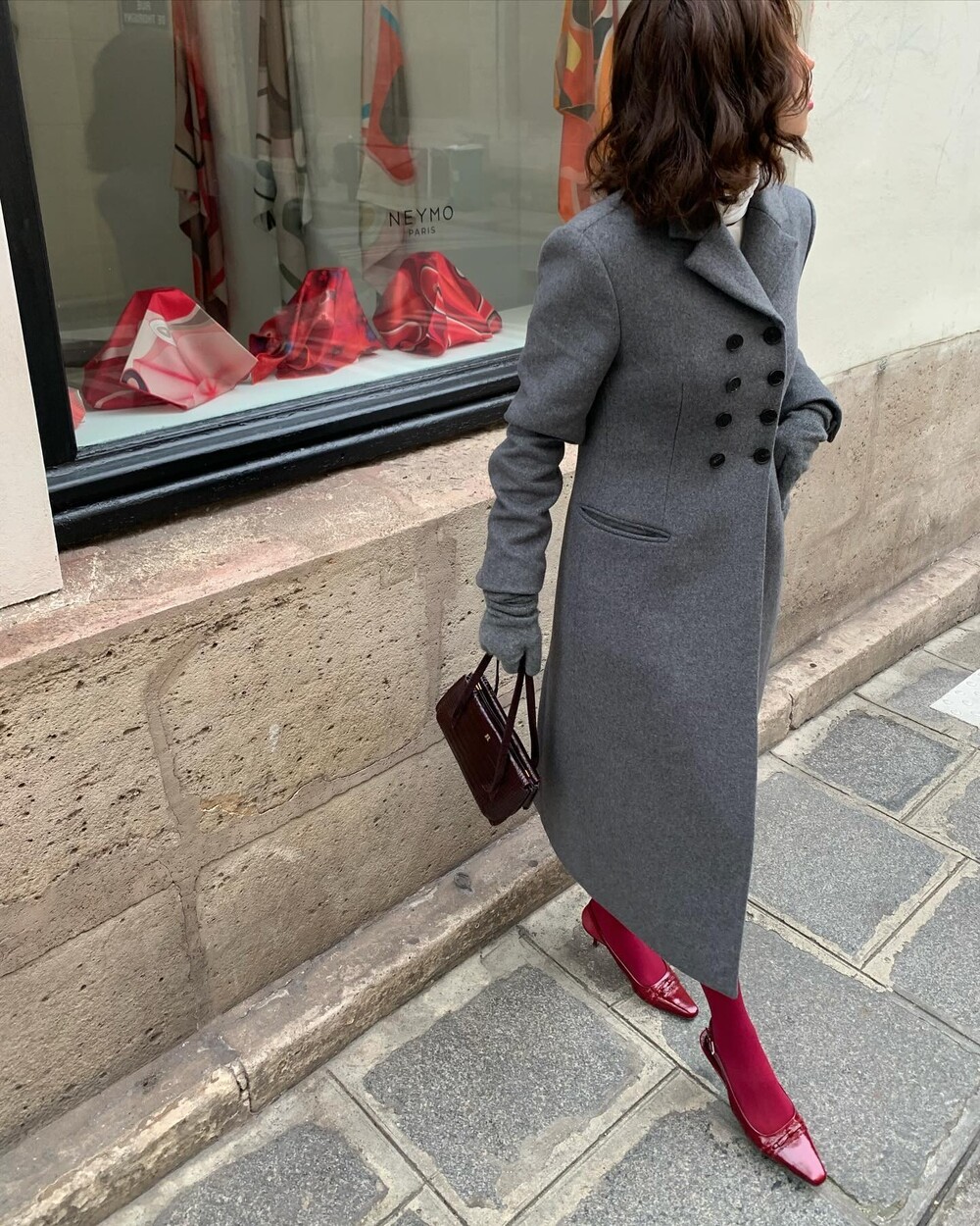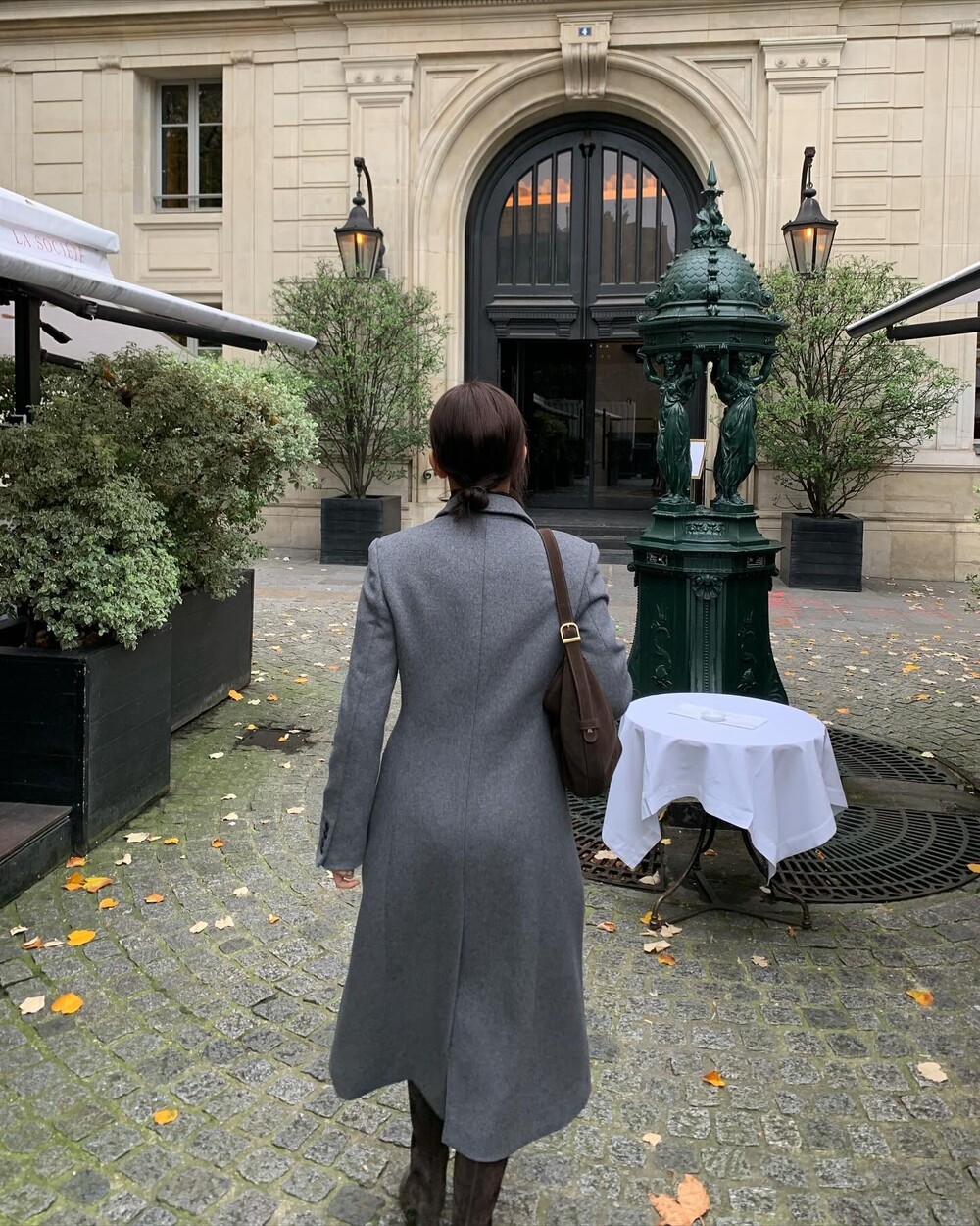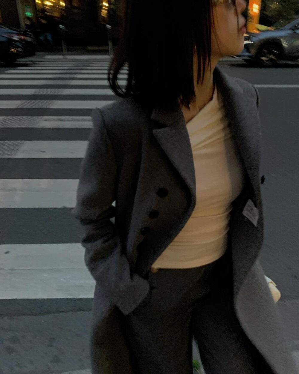걸으면 슬릿 사이로 다리가 슬쩍보이는데 그 태가 자극적일만큼 센슈얼하고, 바람들지 않게 설정 된 짧은 라펠을 걷어올려 입으면 마치 제복을 입은 듯 더욱 냉소적이고 절제되어보이는 느낌.(연출하기에 따라 무드는 다르지만요!)