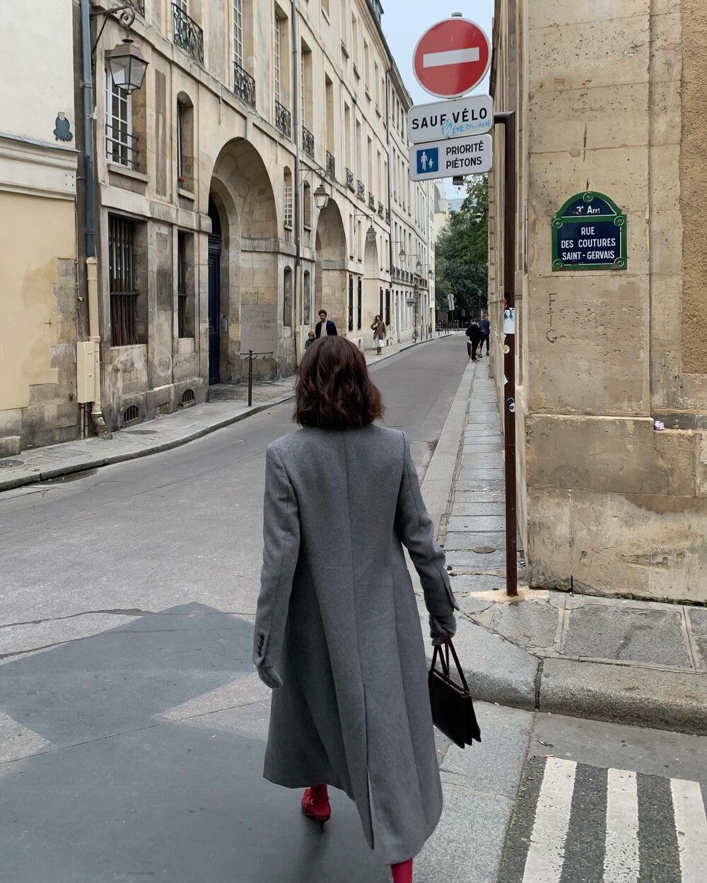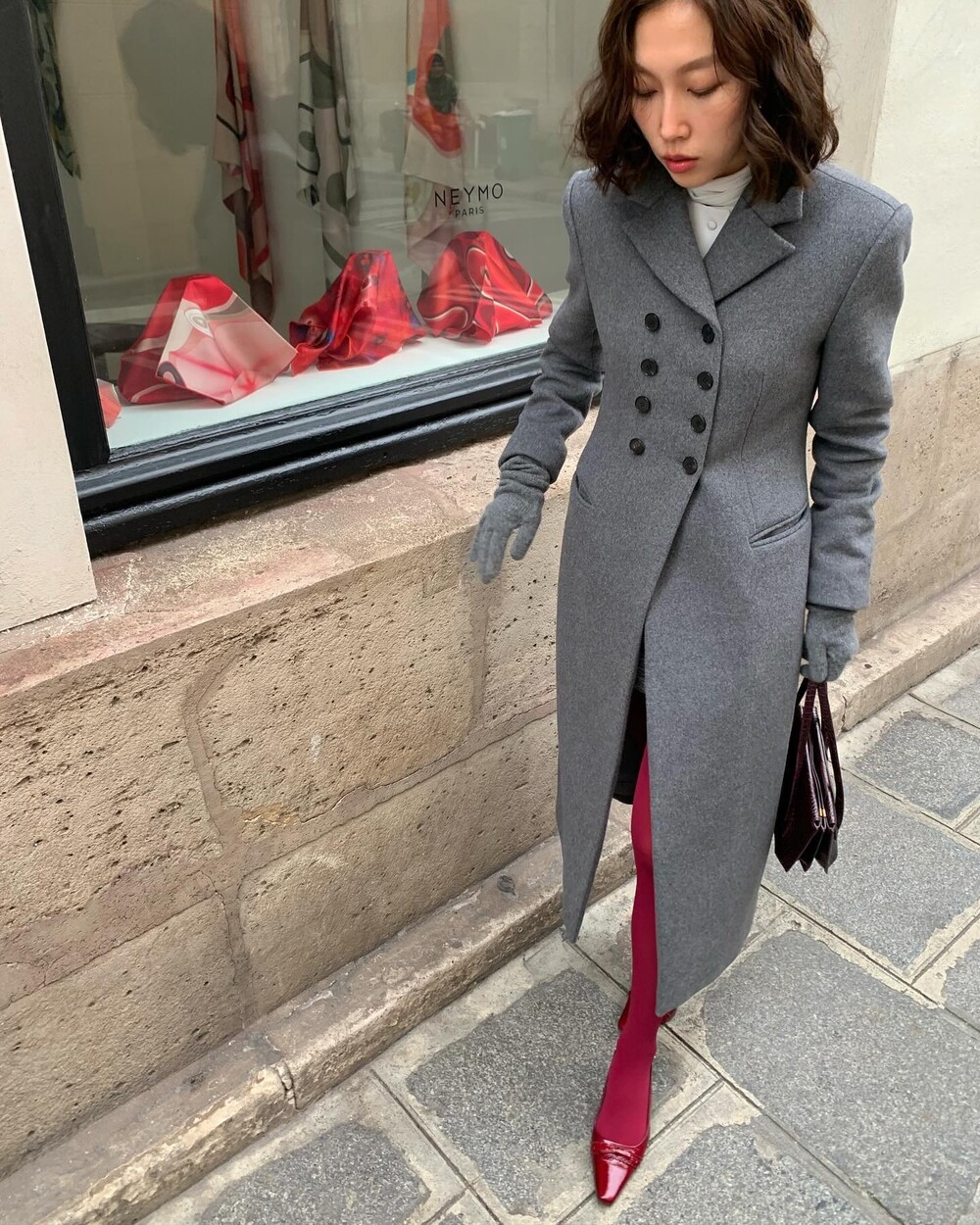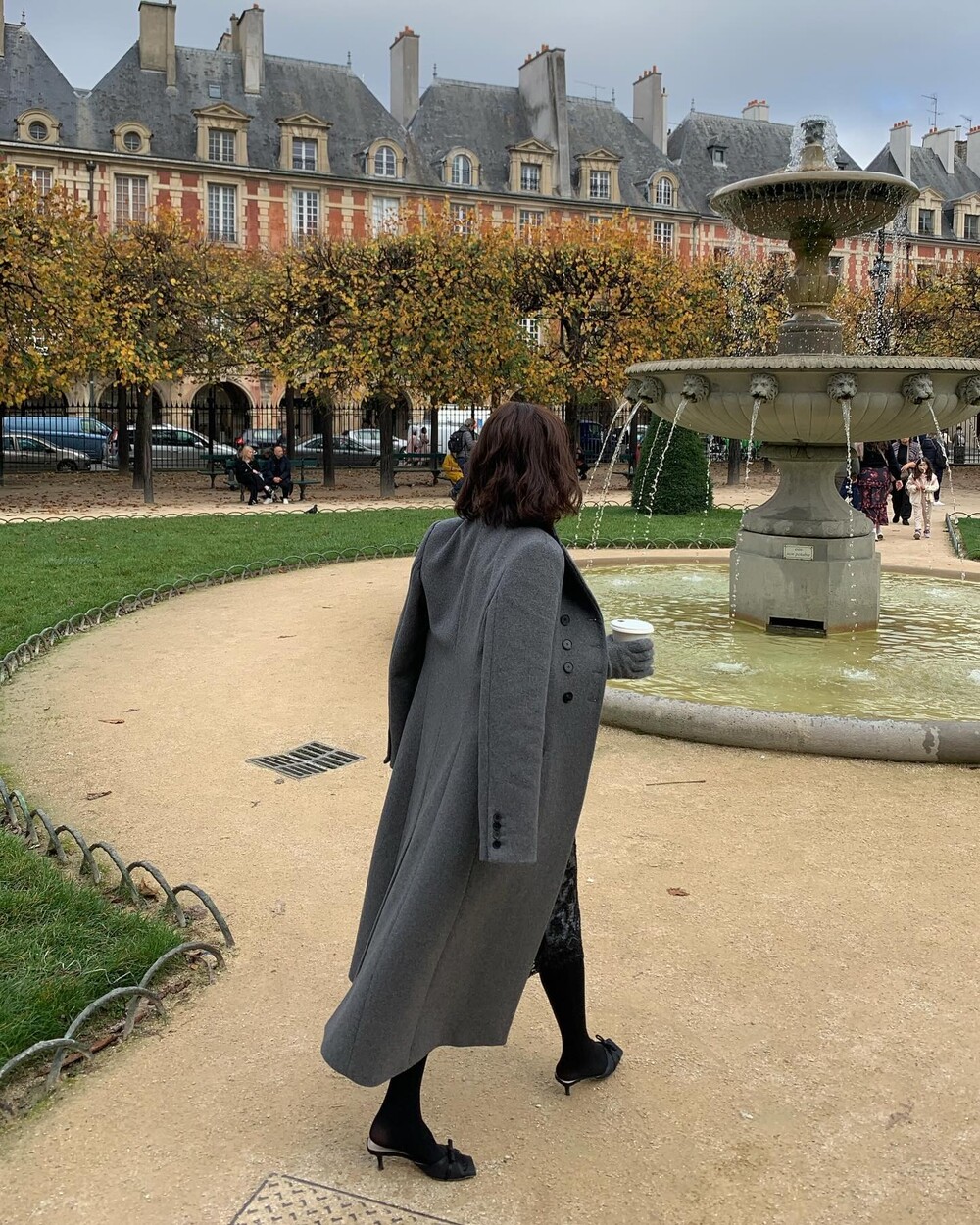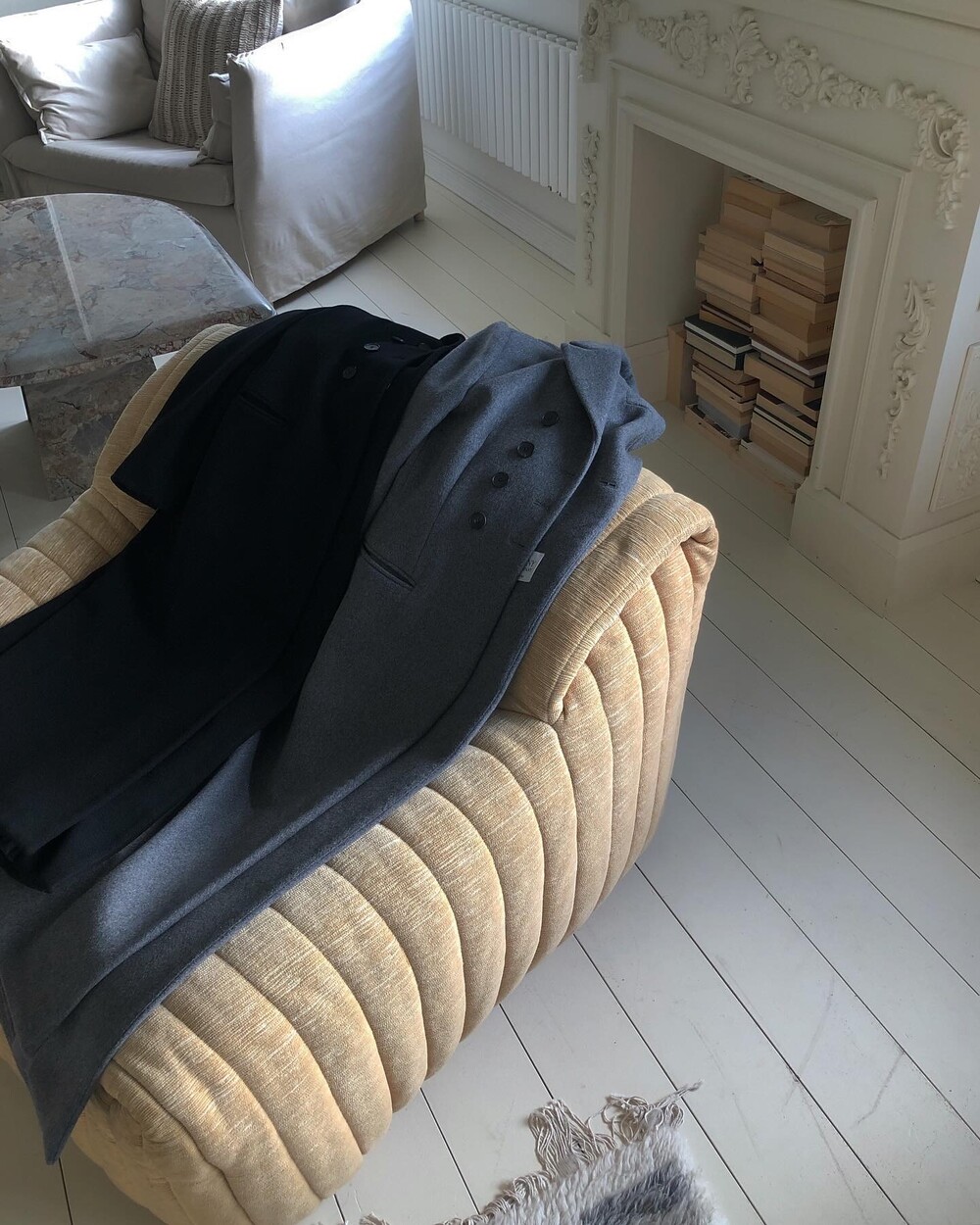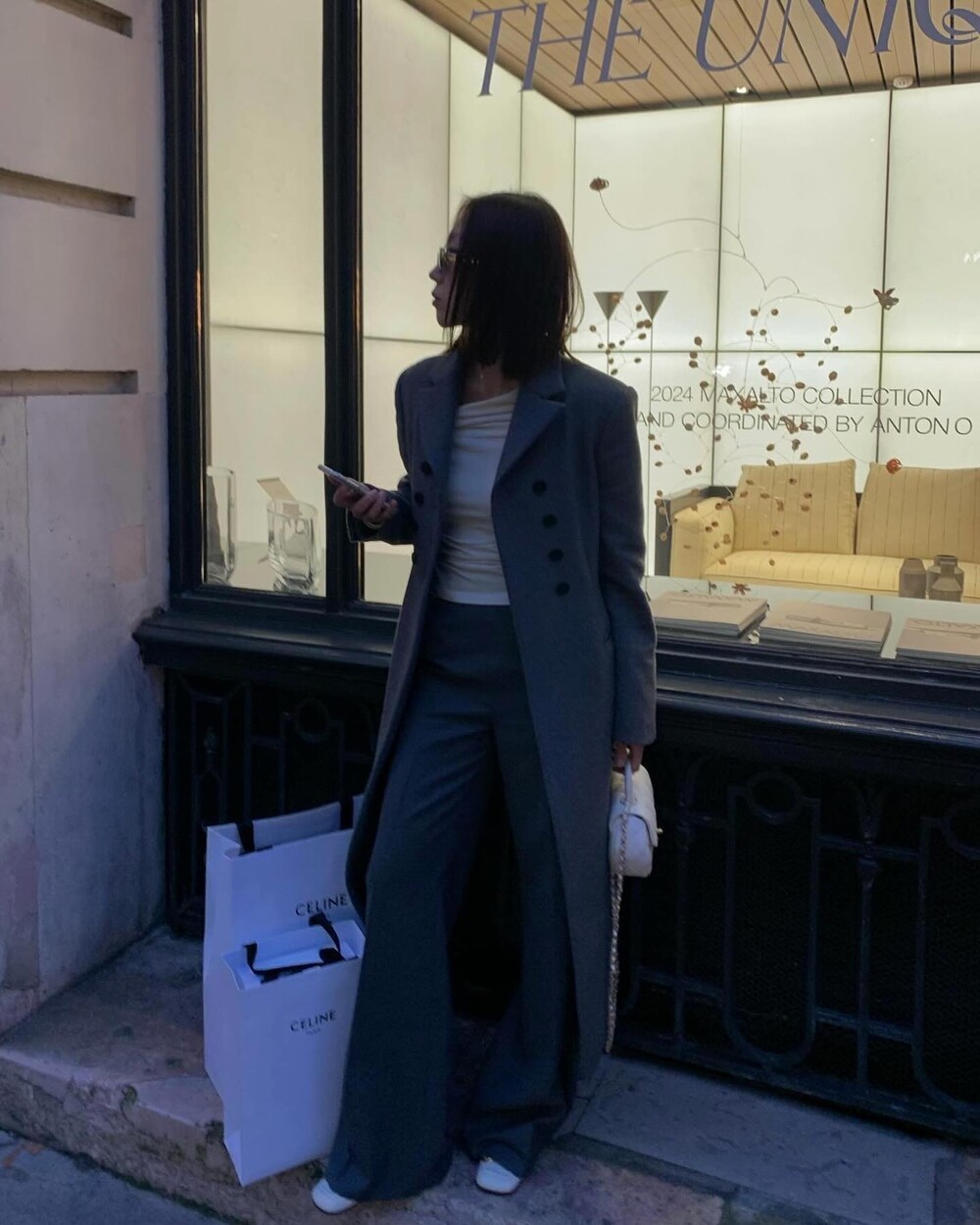 걸으면 슬릿 사이로 다리가 슬쩍보이는데 그 태가 자극적일만큼 센슈얼하고, 바람들지 않게 설정 된 짧은 라펠을 걷어올려 입으면 마치 제복을 입은 듯 더욱 냉소적이고 절제되어보이는 느낌.(연출하기에 따라 무드는 다르지만요!)