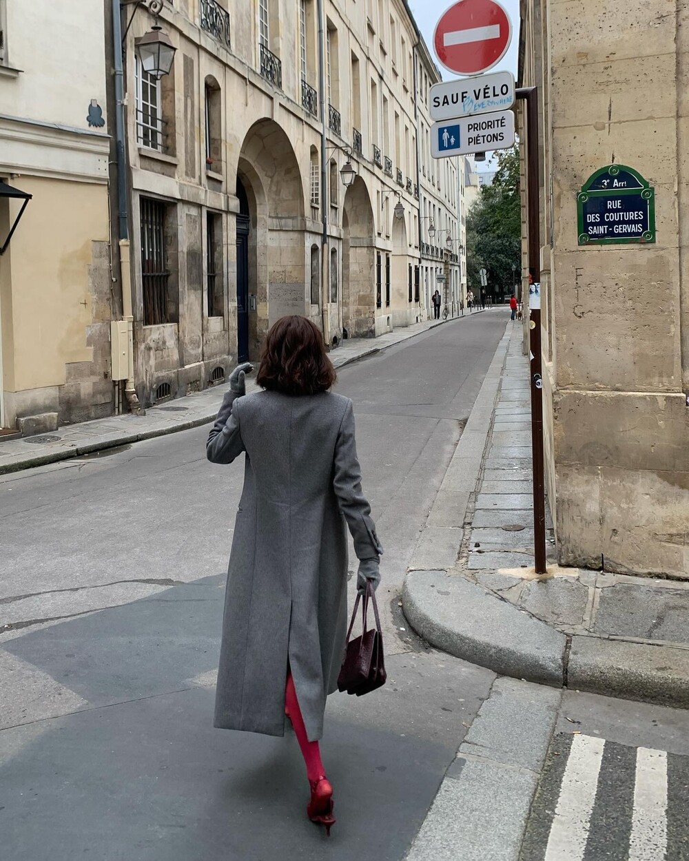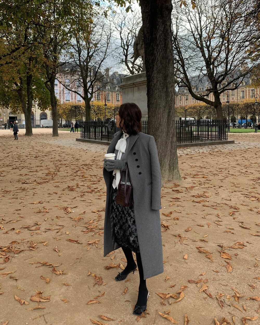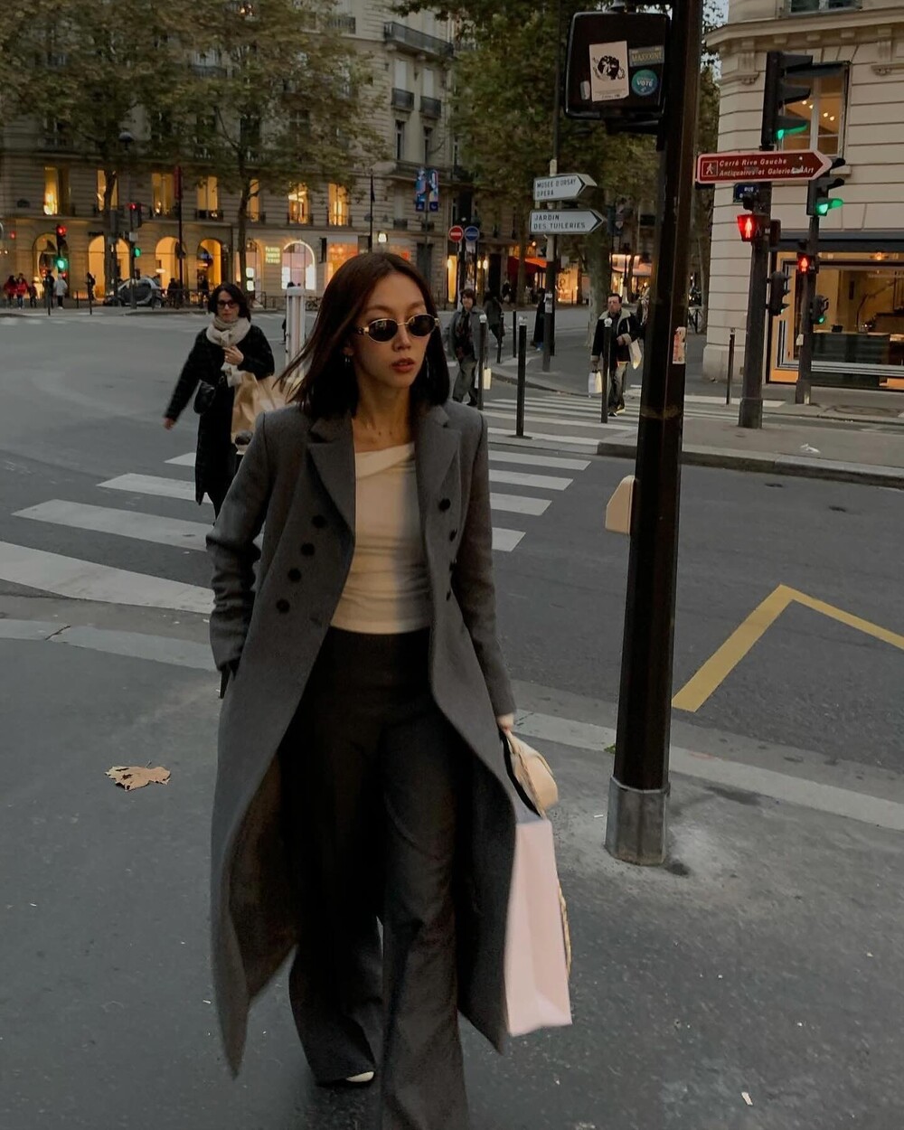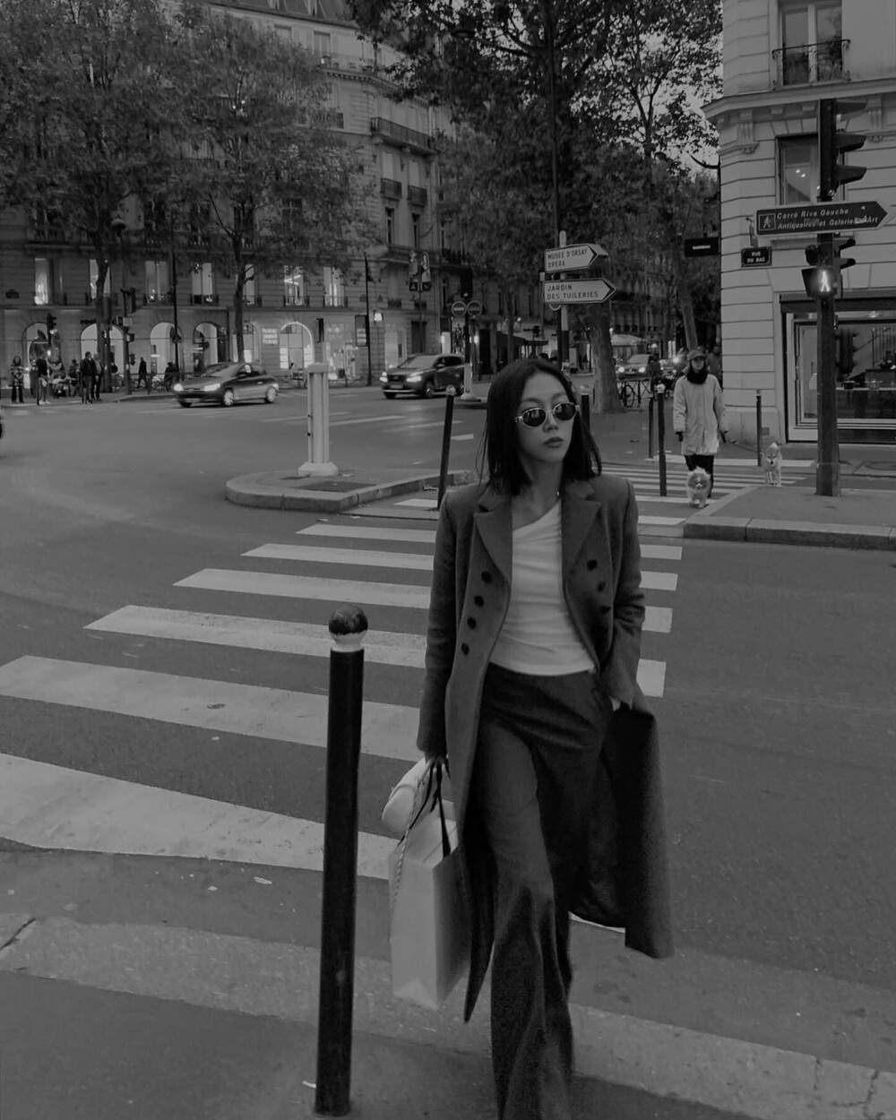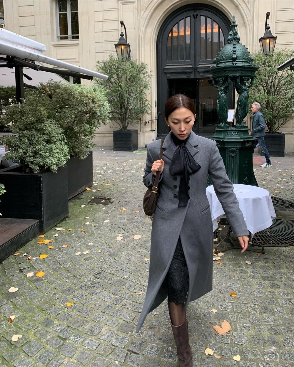 걸으면 슬릿 사이로 다리가 슬쩍보이는데 그 태가 자극적일만큼 센슈얼하고, 바람들지 않게 설정 된 짧은 라펠을 걷어올려 입으면 마치 제복을 입은 듯 더욱 냉소적이고 절제되어보이는 느낌.(연출하기에 따라 무드는 다르지만요!)