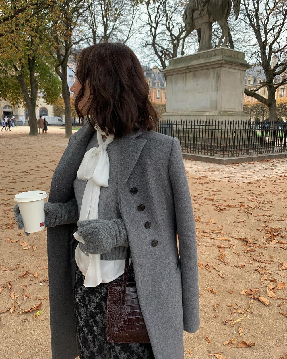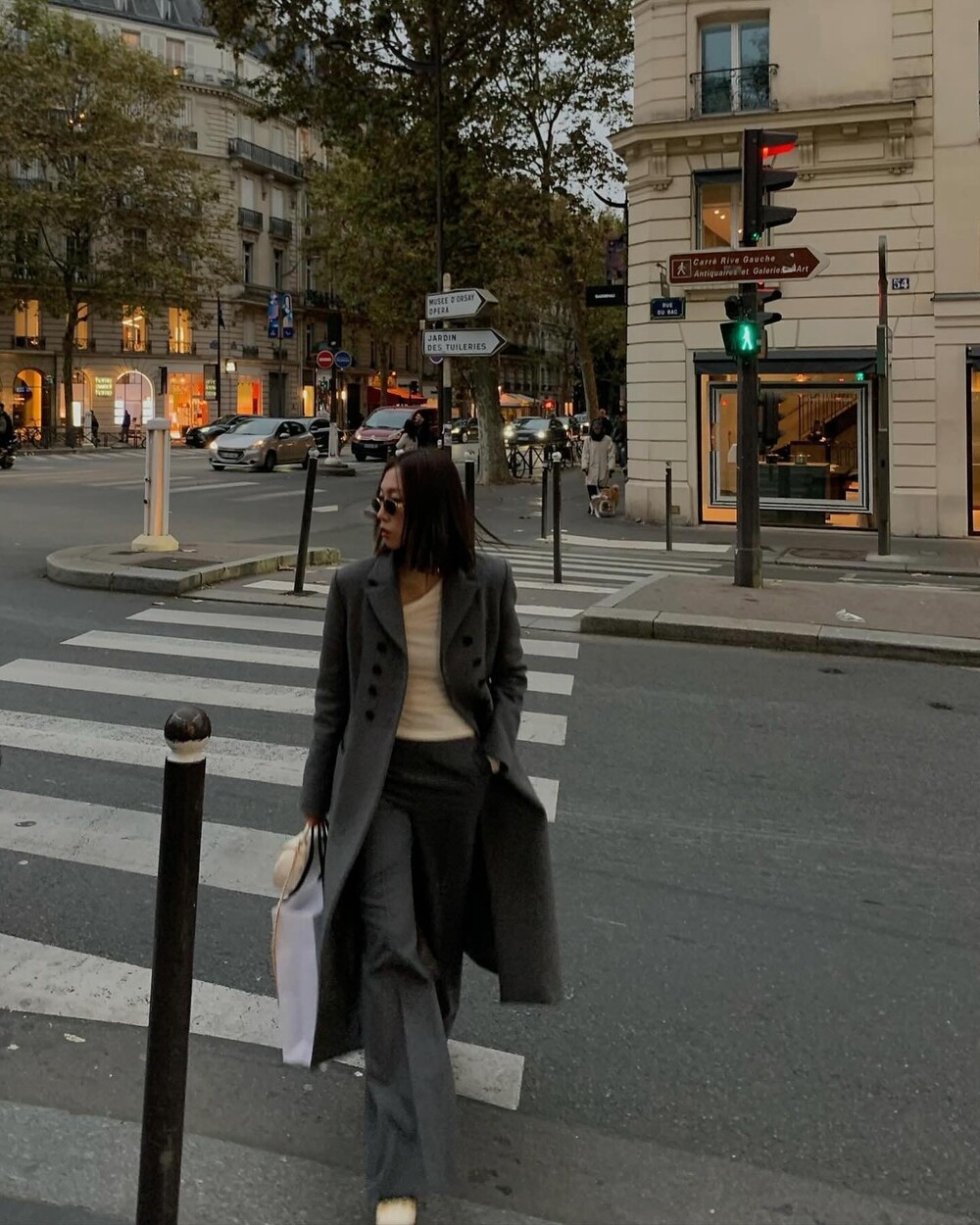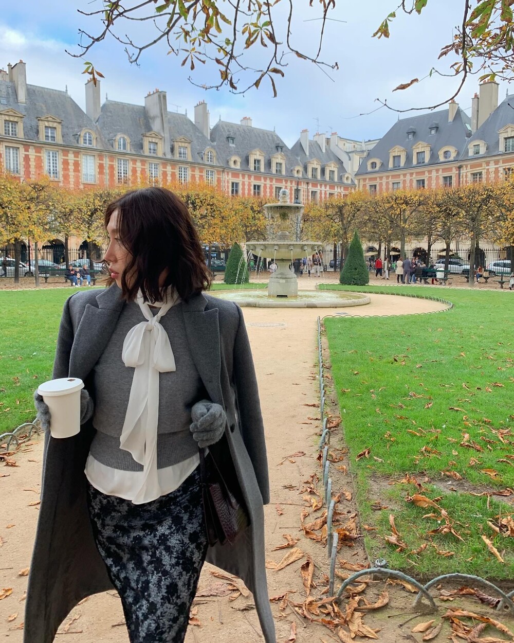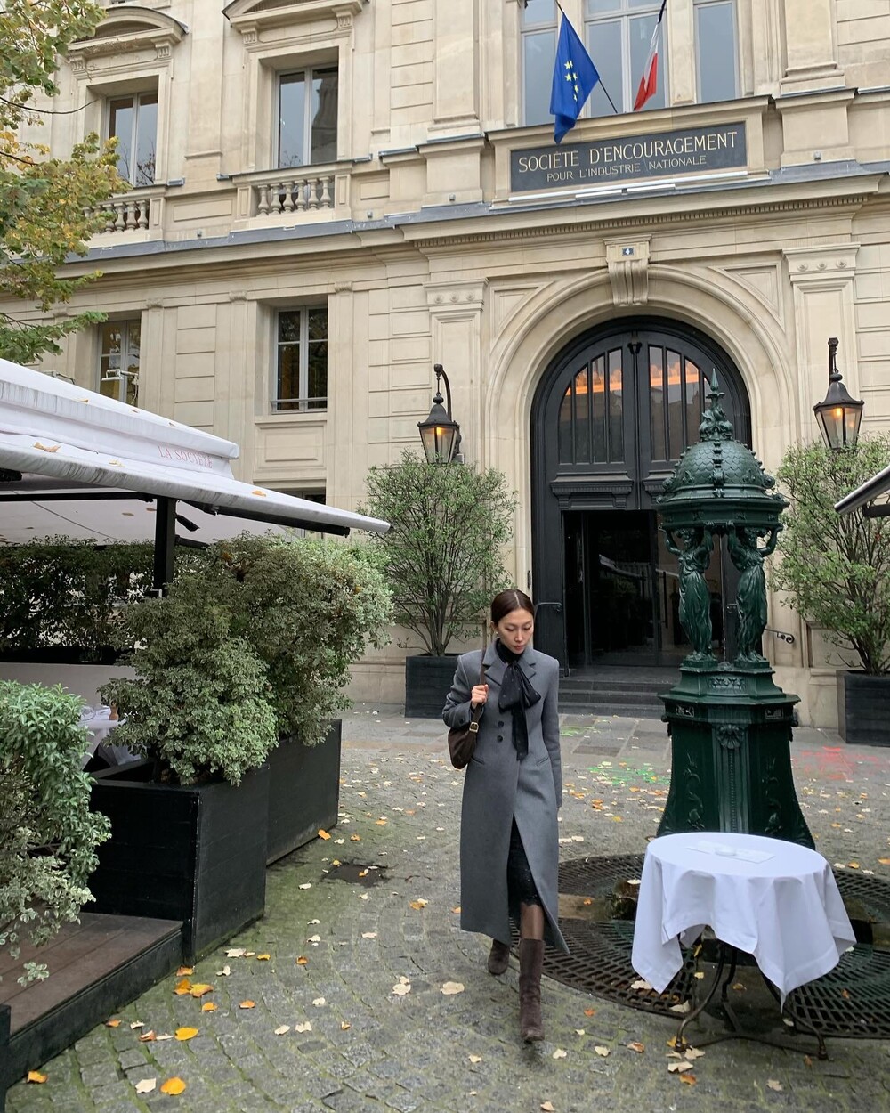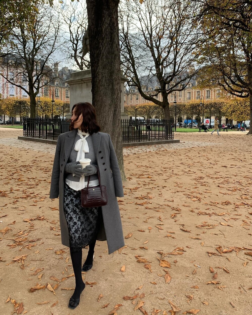 걸으면 슬릿 사이로 다리가 슬쩍보이는데 그 태가 자극적일만큼 센슈얼하고, 바람들지 않게 설정 된 짧은 라펠을 걷어올려 입으면 마치 제복을 입은 듯 더욱 냉소적이고 절제되어보이는 느낌.(연출하기에 따라 무드는 다르지만요!)