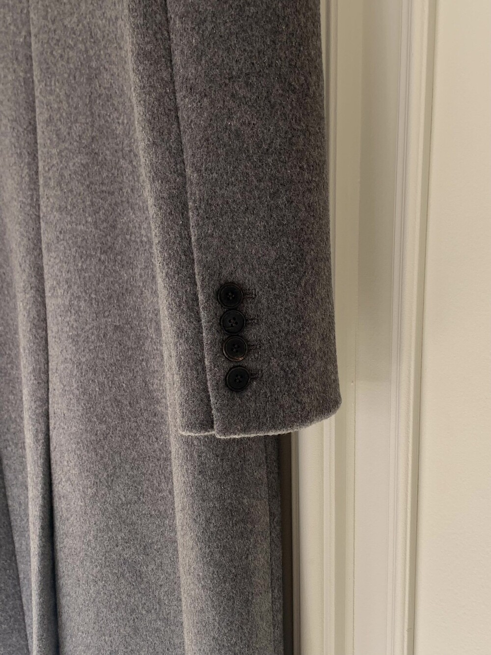 -𝙂𝙧𝙖𝙮 역시 Wool 90% 초-세련 스모그 그레이예요. 짙은 브라운 소뿔버튼과 합이 무척 좋습니다. Noir에 비해 매트한 질감이며, 조금 더 밀도가 높아 무게감은 있지만 그 만큼 실루엣이 견고하며 도시의 건축물을 연상하는 절제미가 돋보이는 소재입니다.