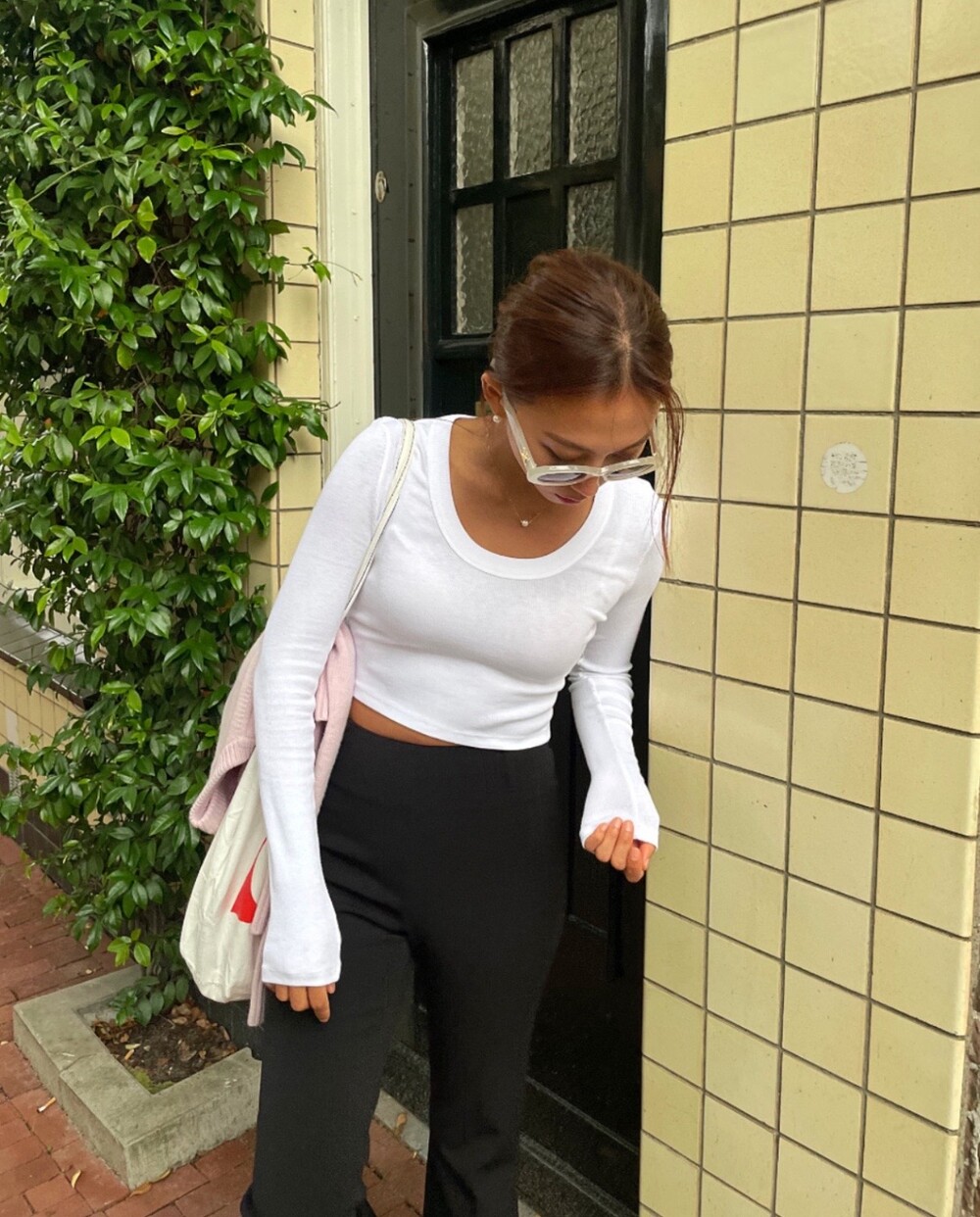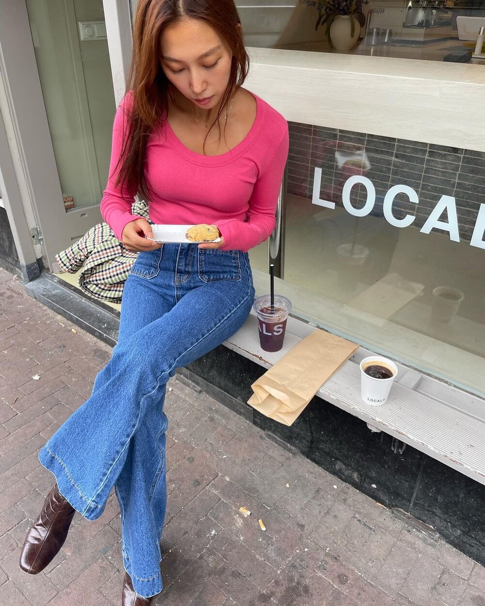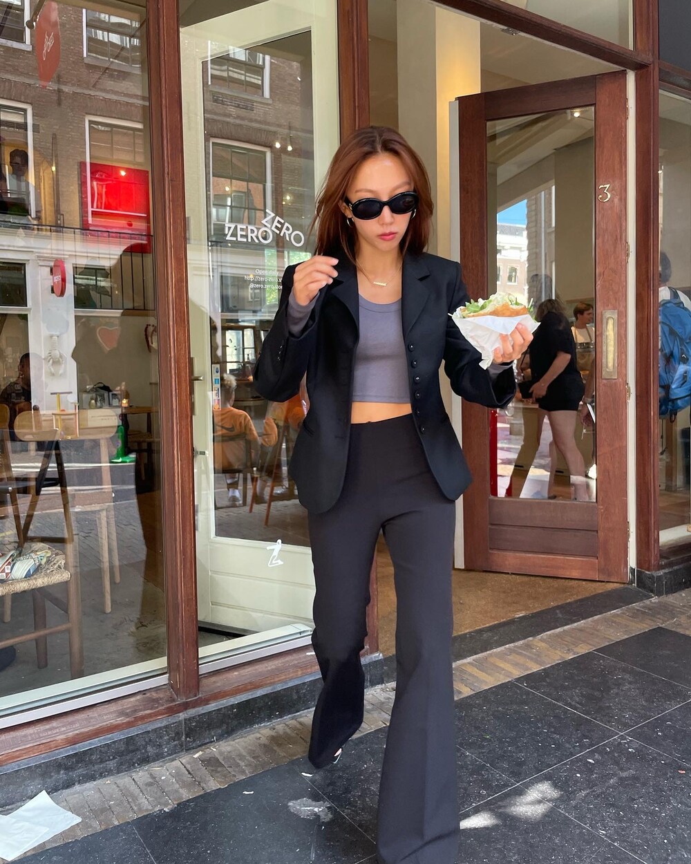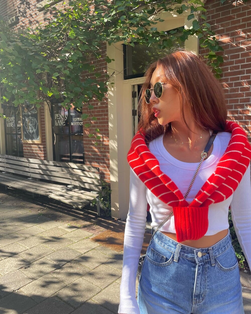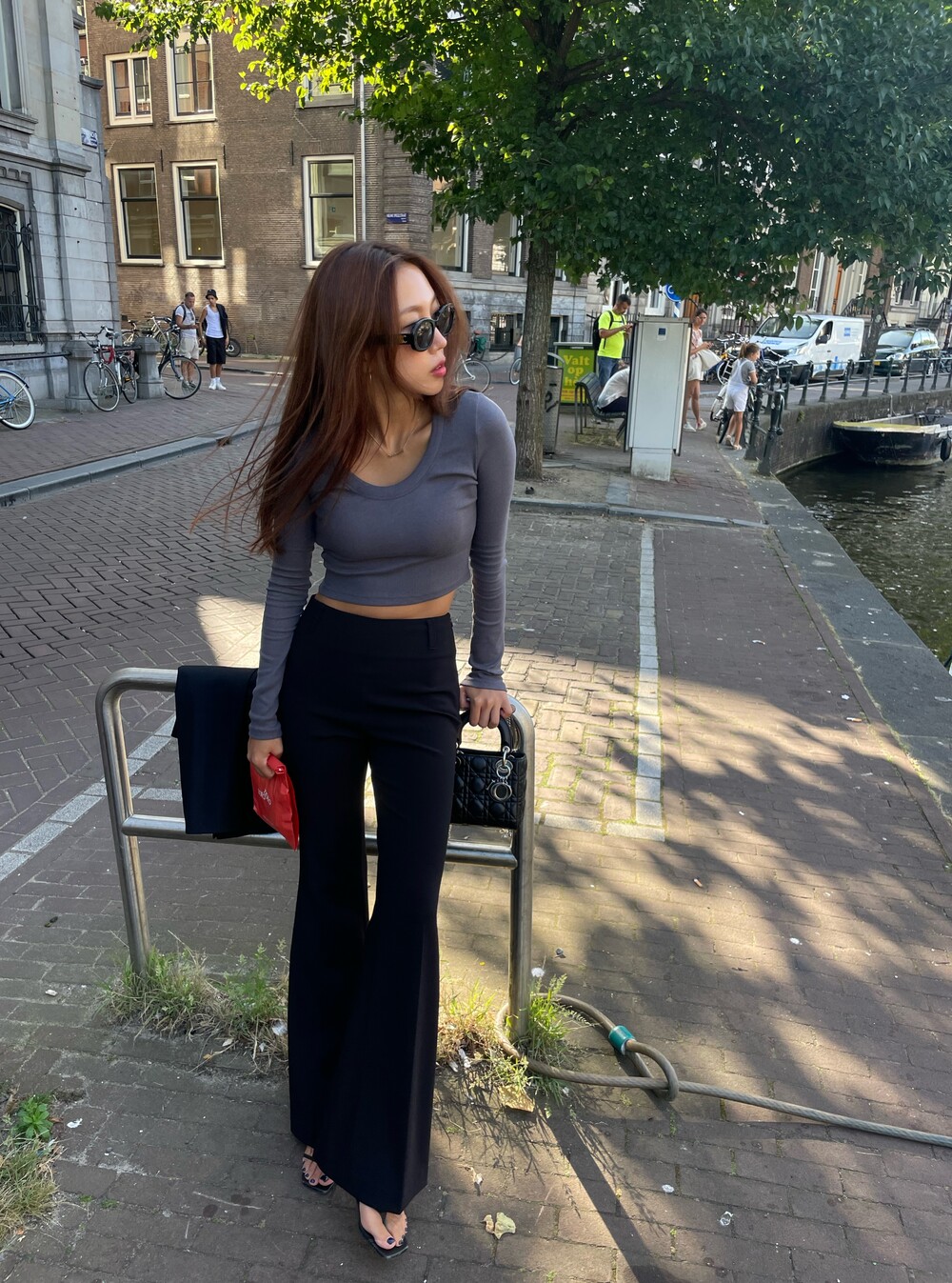 맥시한 소매 기장으로 팔 라인은 슬림해보이구요, 쏘옥 굴려진 허리라인은 들뜸 없이 바디를 감싸주어 감량 효과까지 꽤 좋습니다.