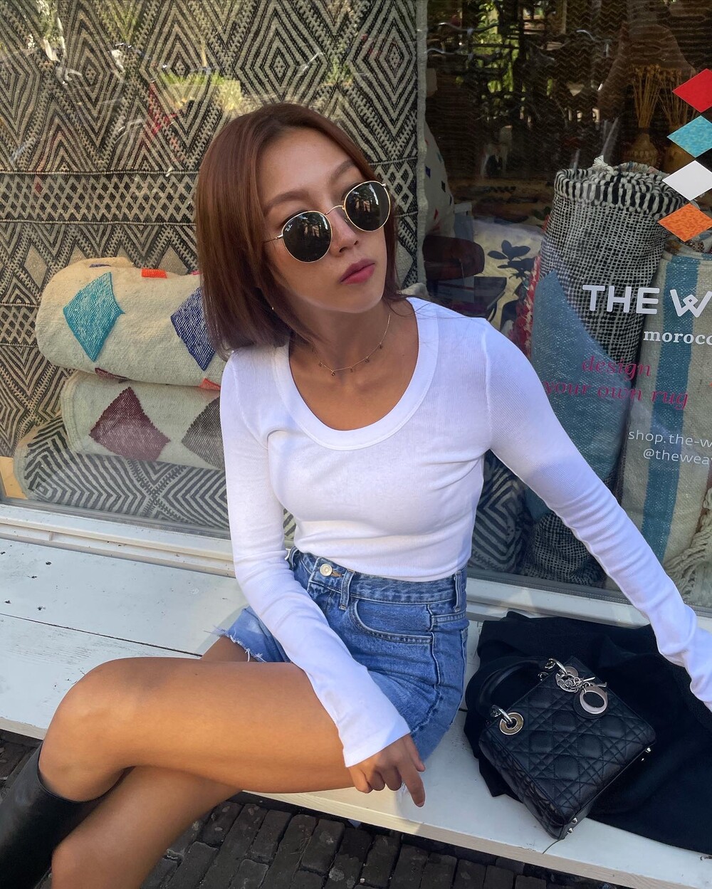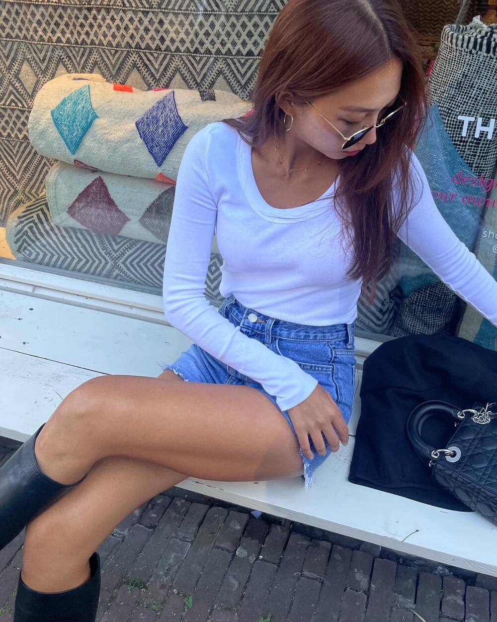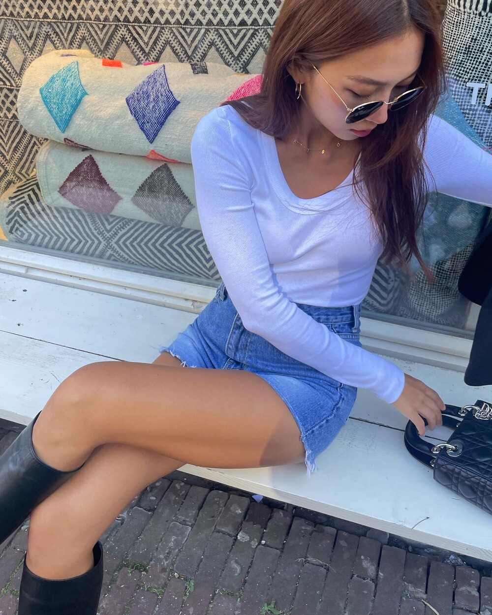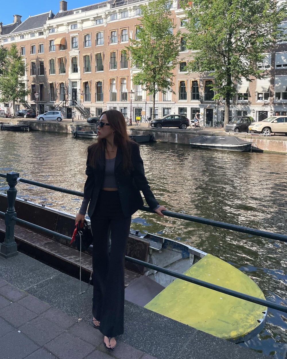 맥시한 소매 기장으로 팔 라인은 슬림해보이구요, 쏘옥 굴려진 허리라인은 들뜸 없이 바디를 감싸주어 감량 효과까지 꽤 좋습니다.