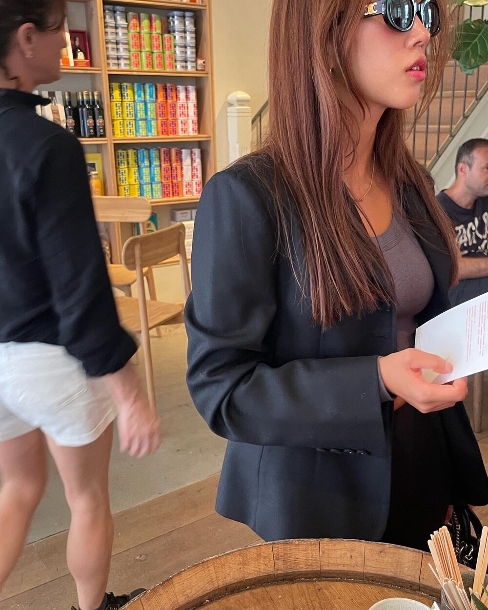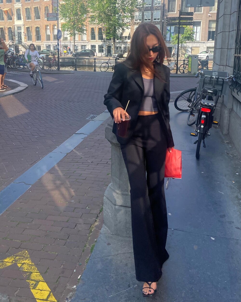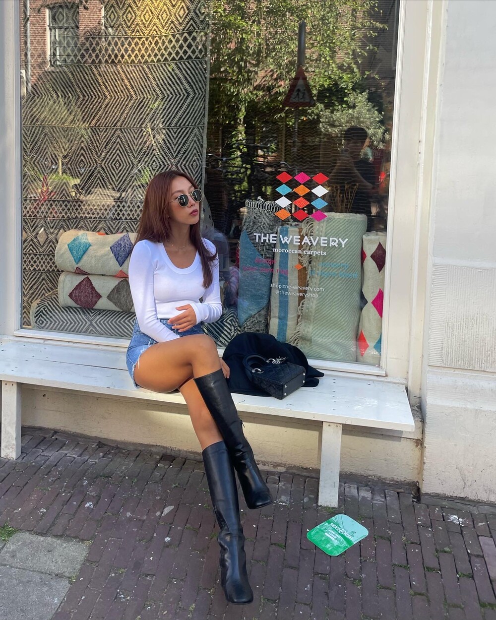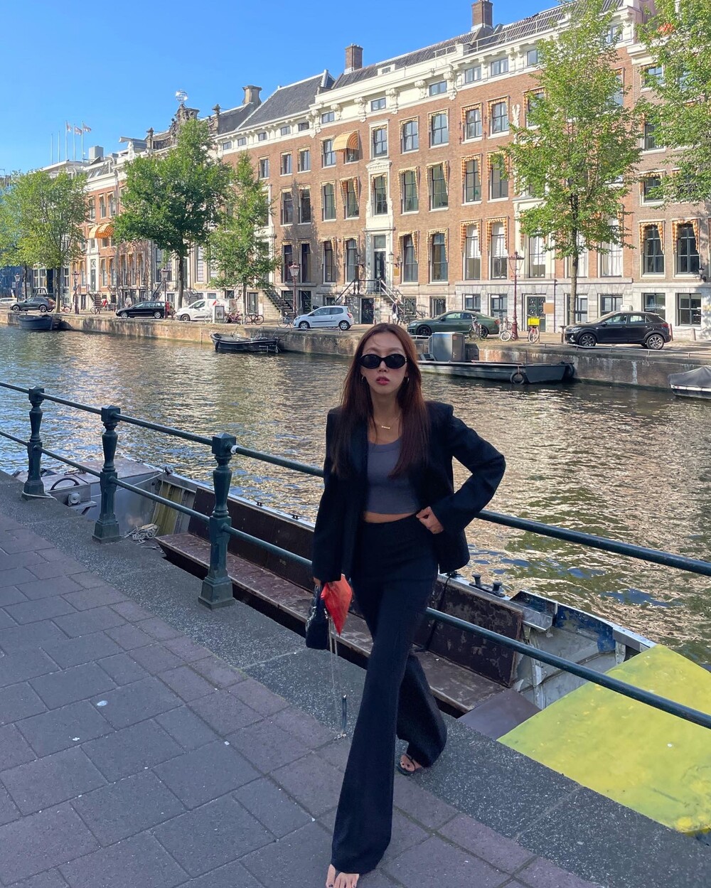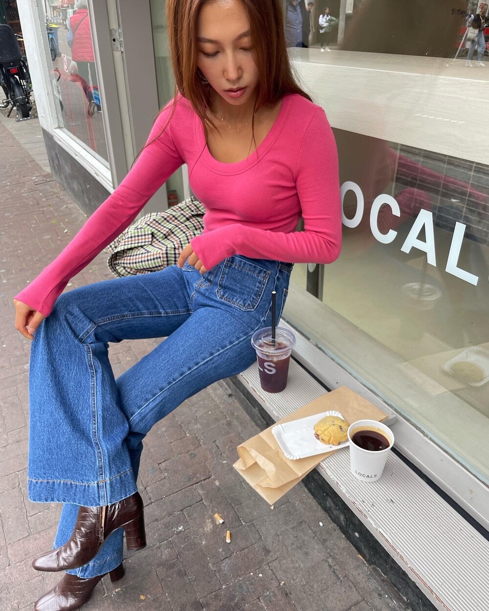 맥시한 소매 기장으로 팔 라인은 슬림해보이구요, 쏘옥 굴려진 허리라인은 들뜸 없이 바디를 감싸주어 감량 효과까지 꽤 좋습니다.