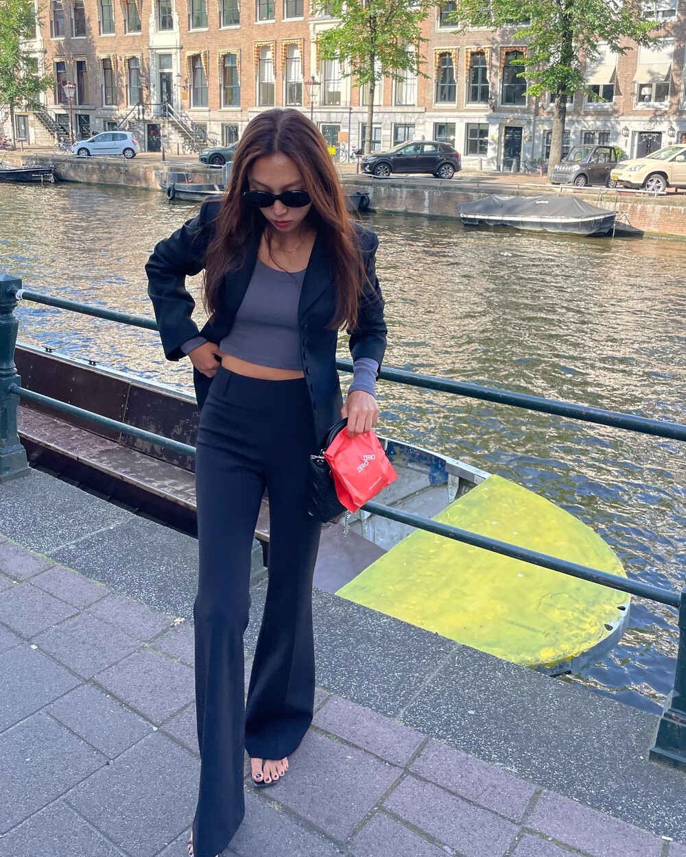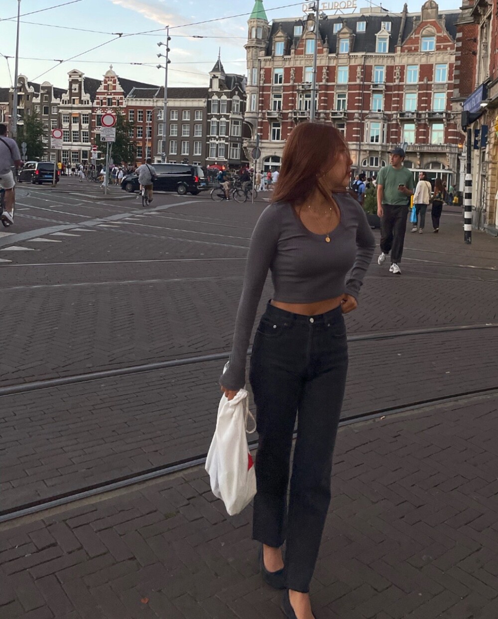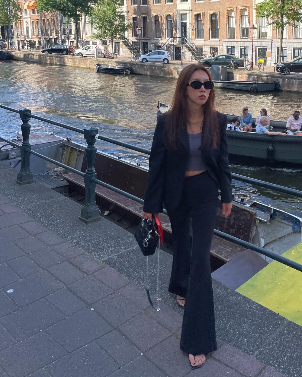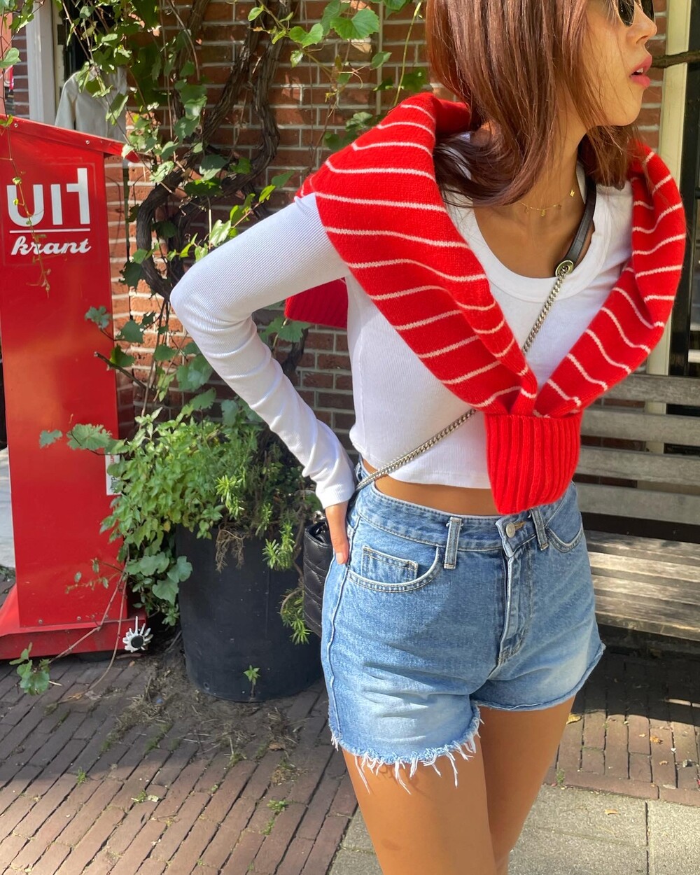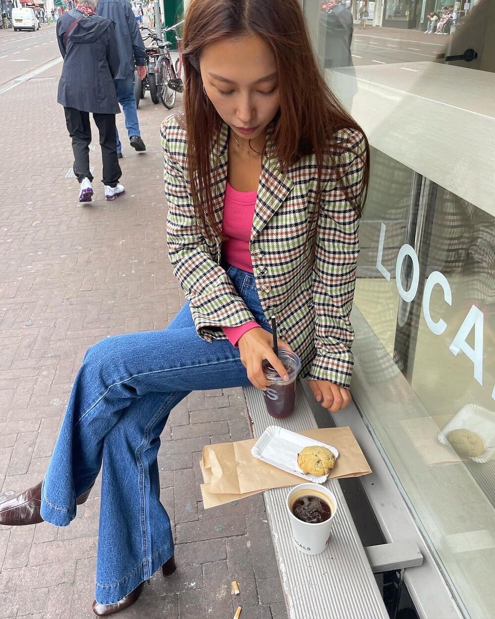 맥시한 소매 기장으로 팔 라인은 슬림해보이구요, 쏘옥 굴려진 허리라인은 들뜸 없이 바디를 감싸주어 감량 효과까지 꽤 좋습니다.