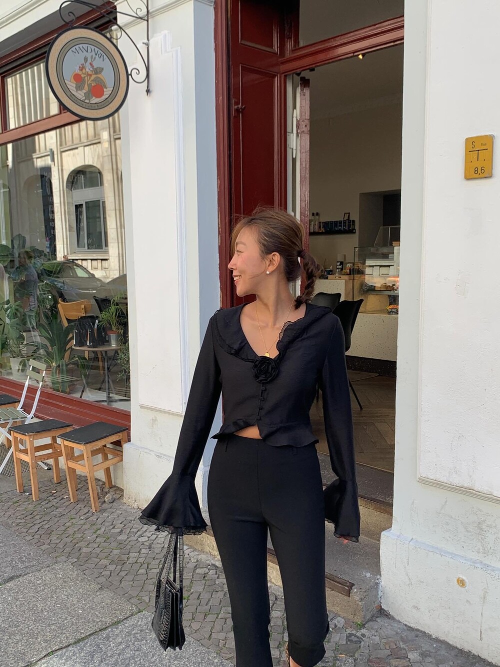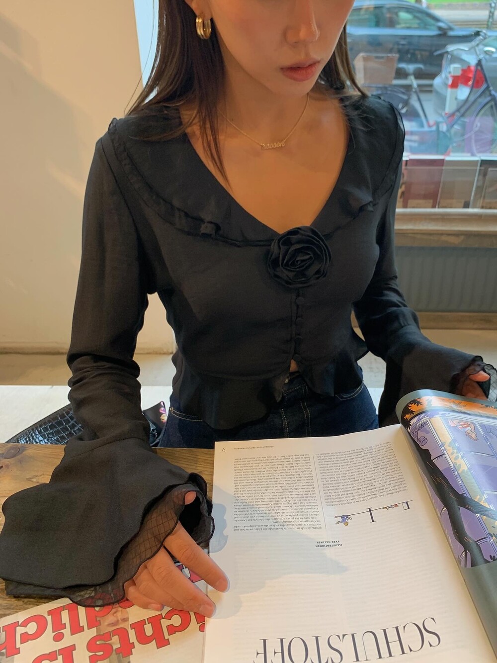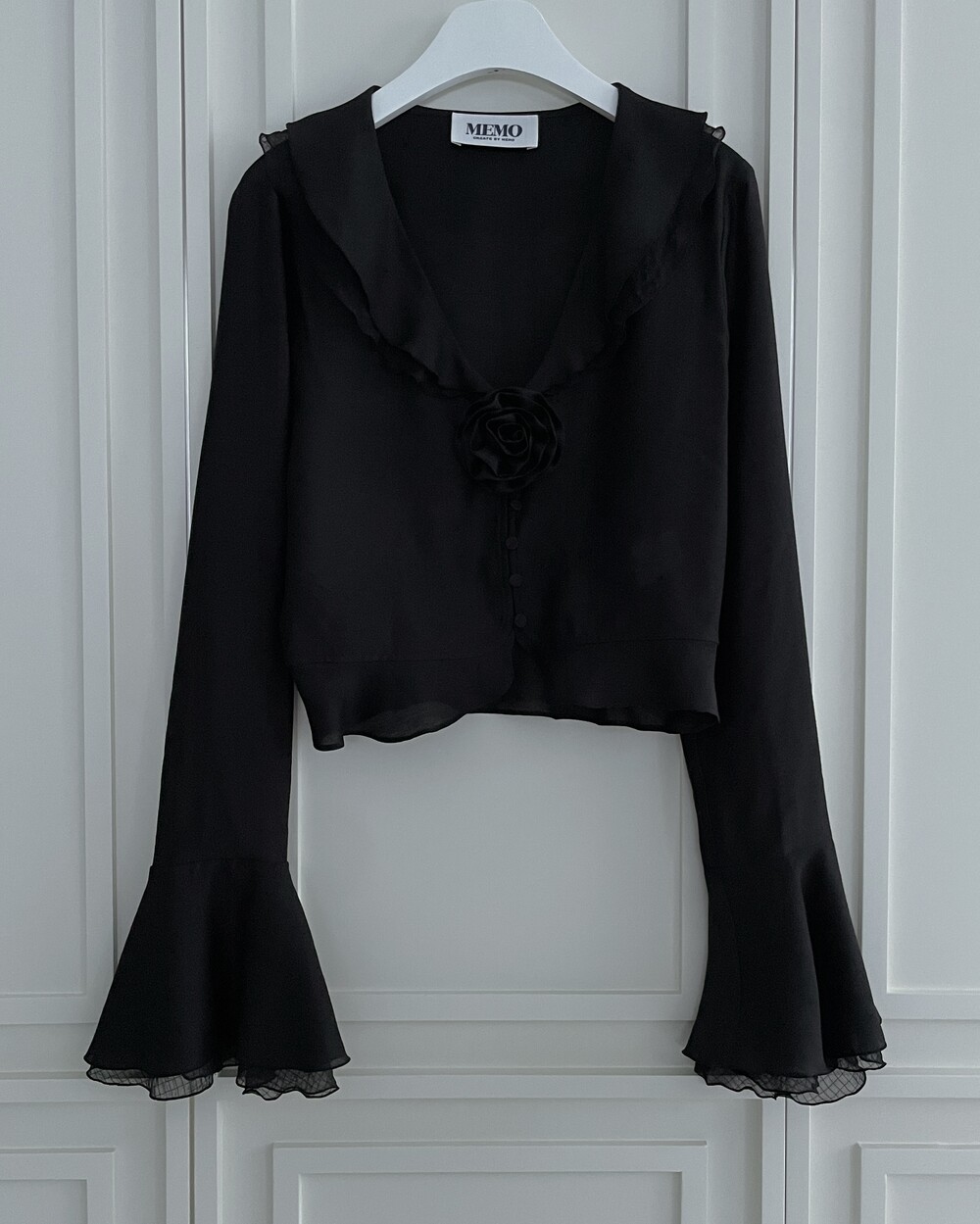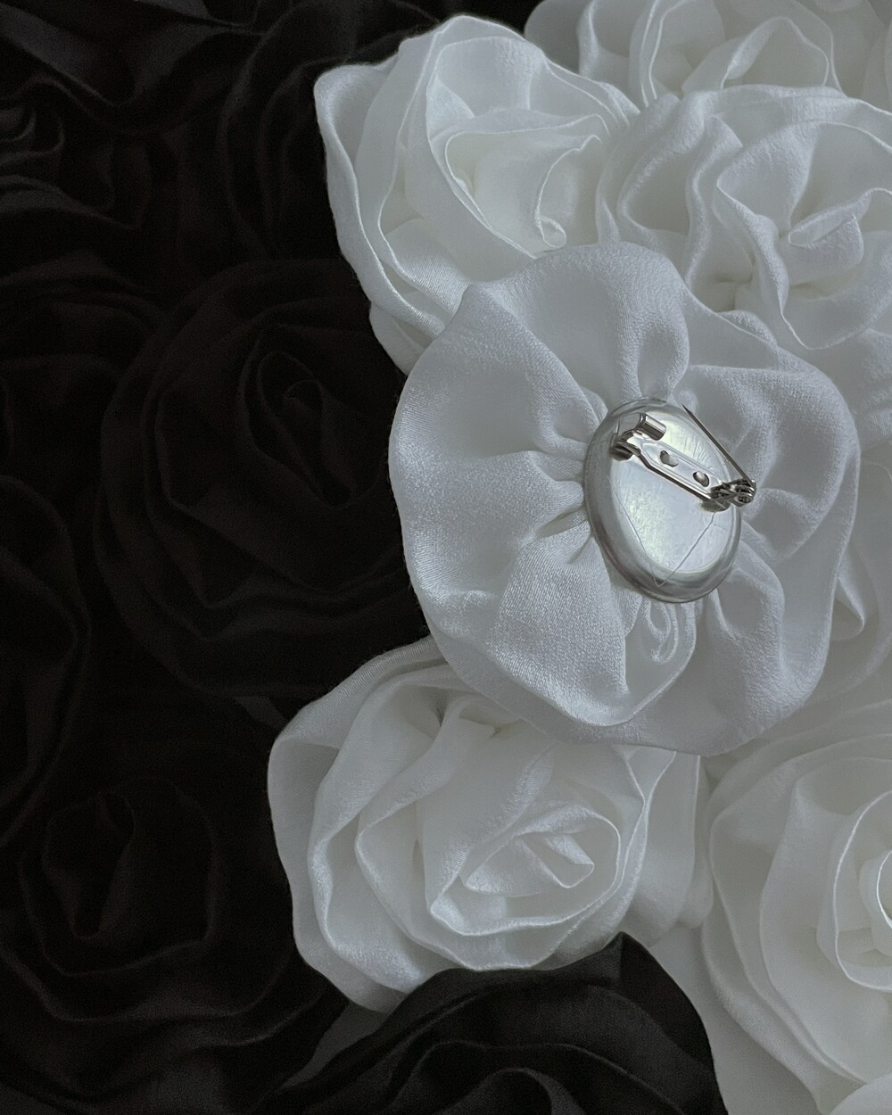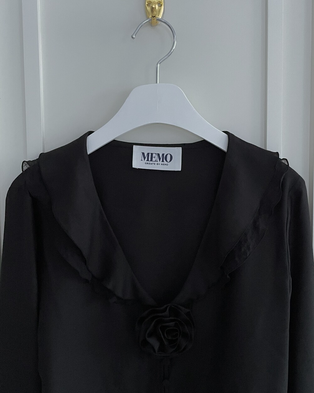 두 소재의 앙상블이 몹시 조화로운 러플 칼라와 슬리브, 그리고 장미 코사지는 킥 중의 킥.