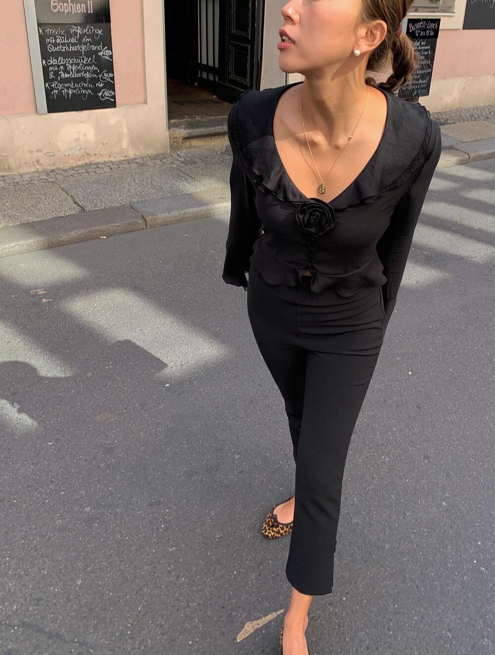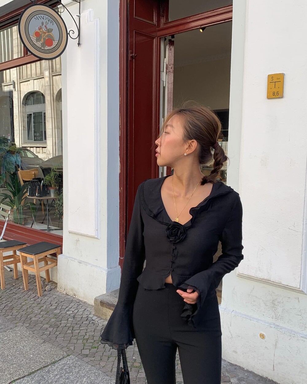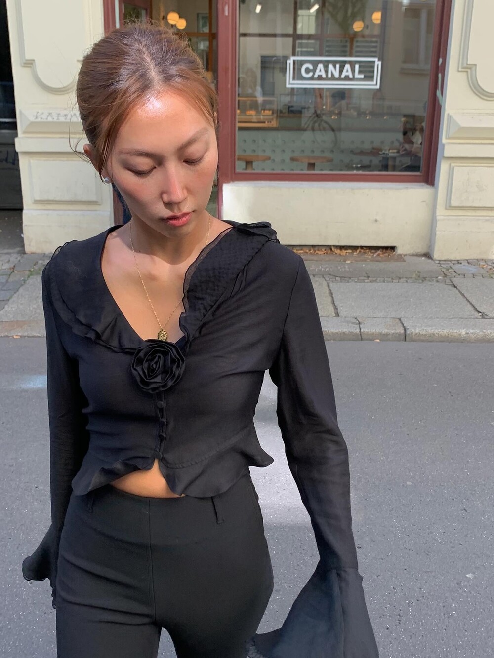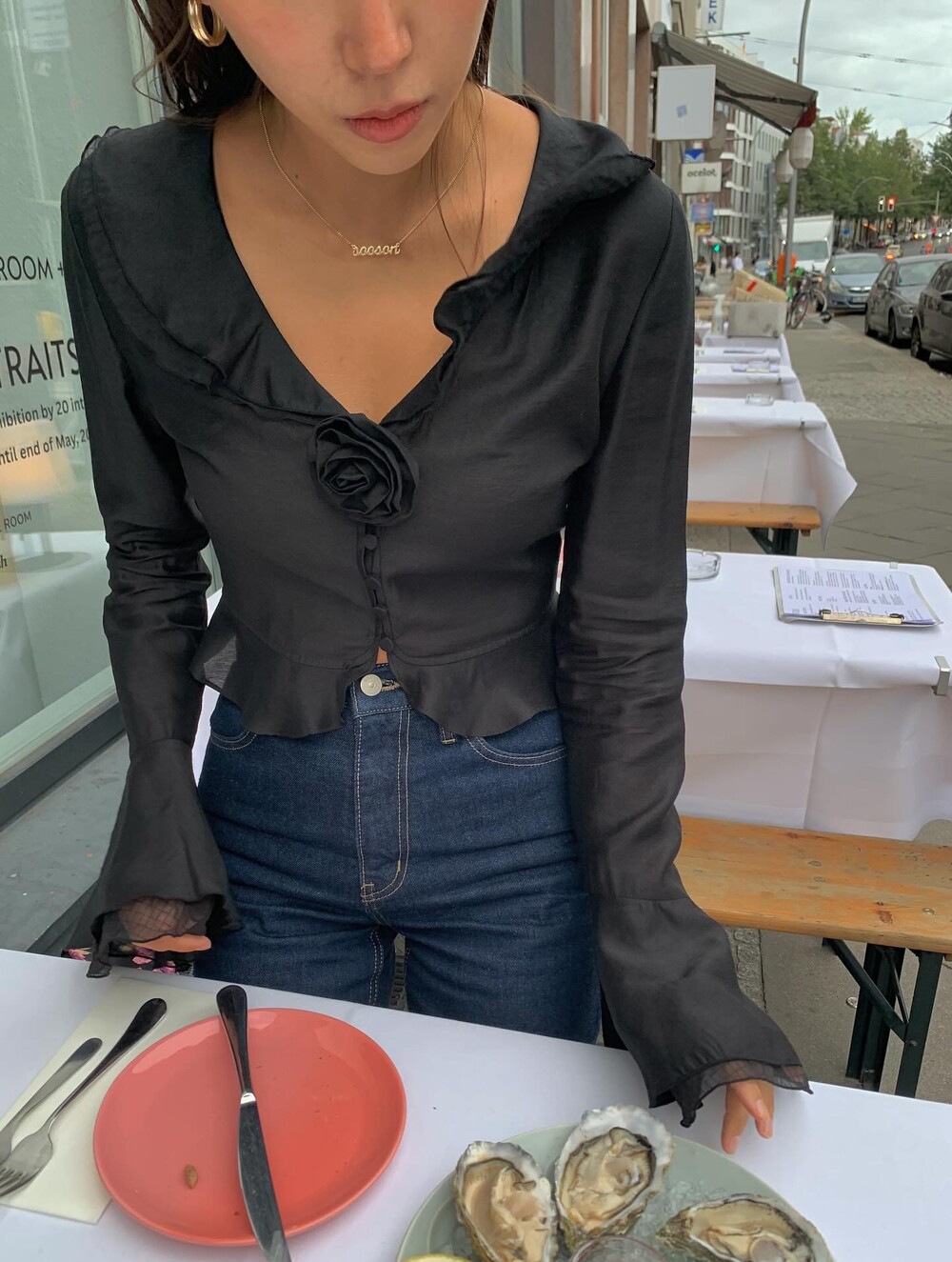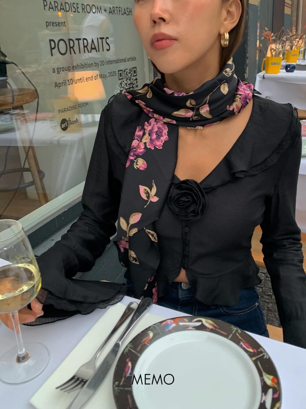 두 소재의 앙상블이 몹시 조화로운 러플 칼라와 슬리브, 그리고 장미 코사지는 킥 중의 킥.