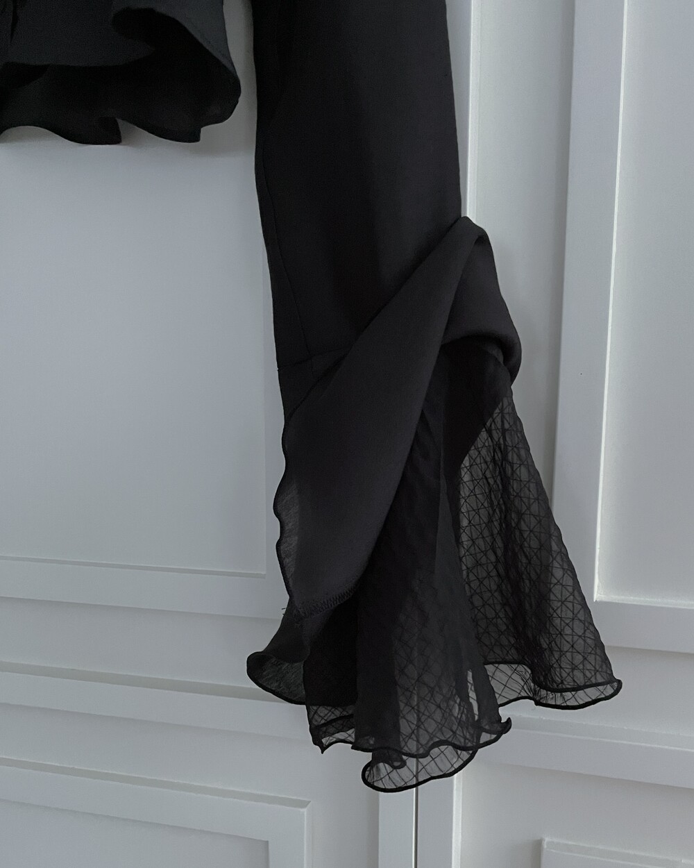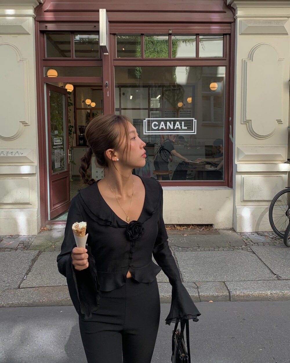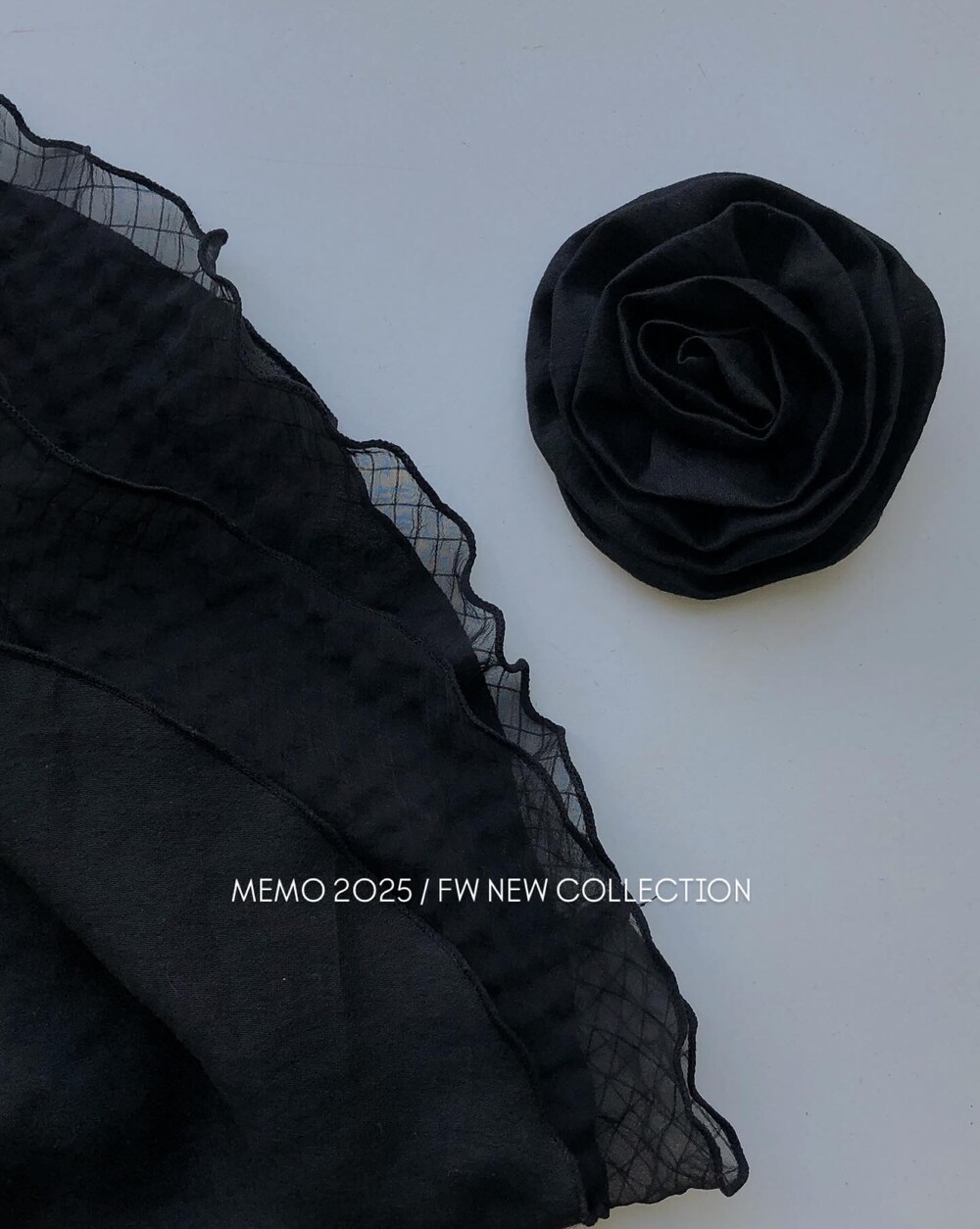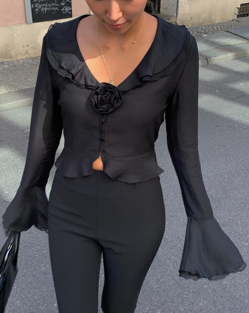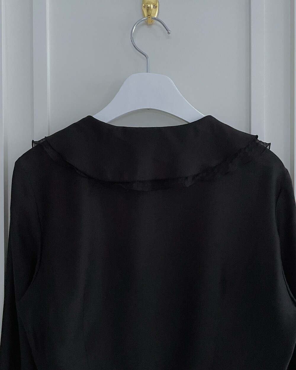 두 소재의 앙상블이 몹시 조화로운 러플 칼라와 슬리브, 그리고 장미 코사지는 킥 중의 킥.