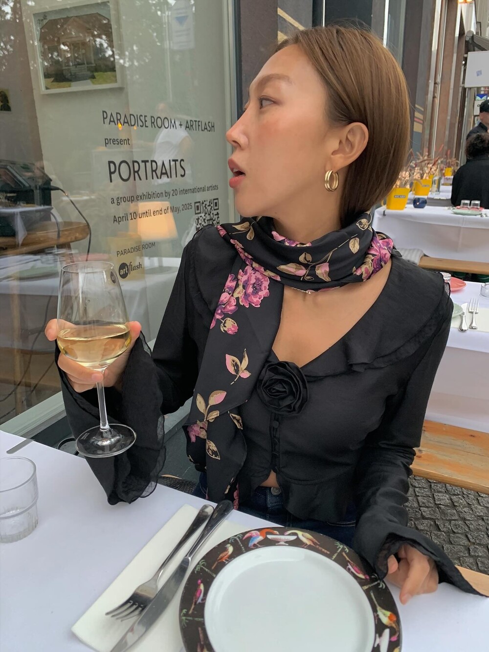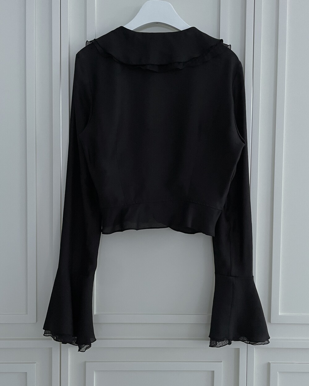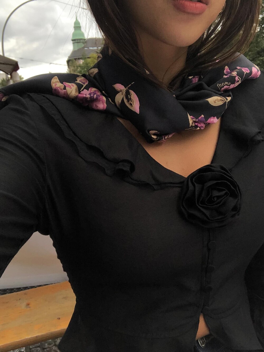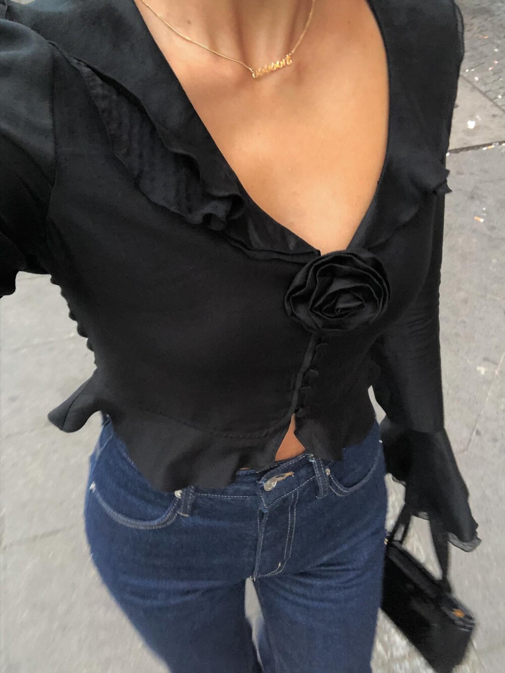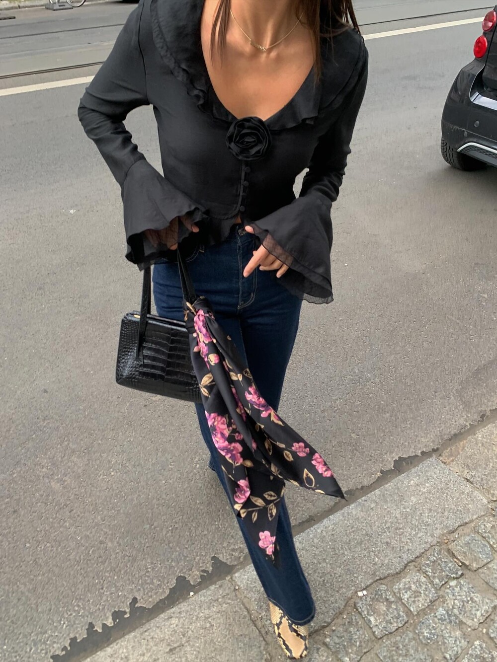 두 소재의 앙상블이 몹시 조화로운 러플 칼라와 슬리브, 그리고 장미 코사지는 킥 중의 킥.