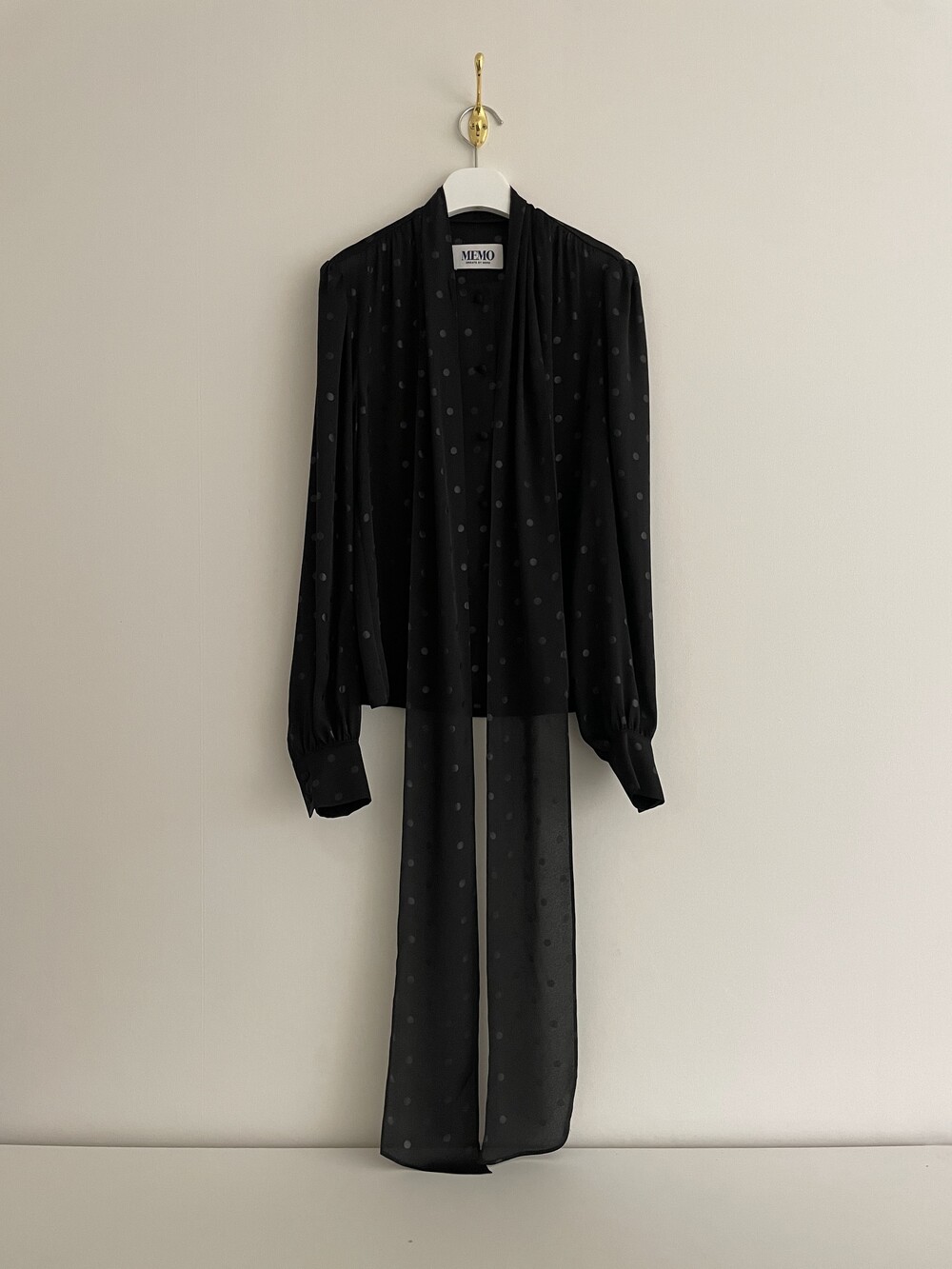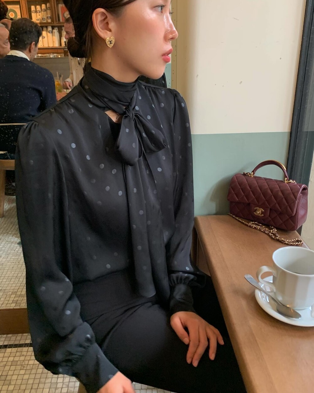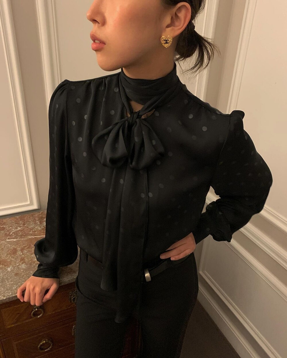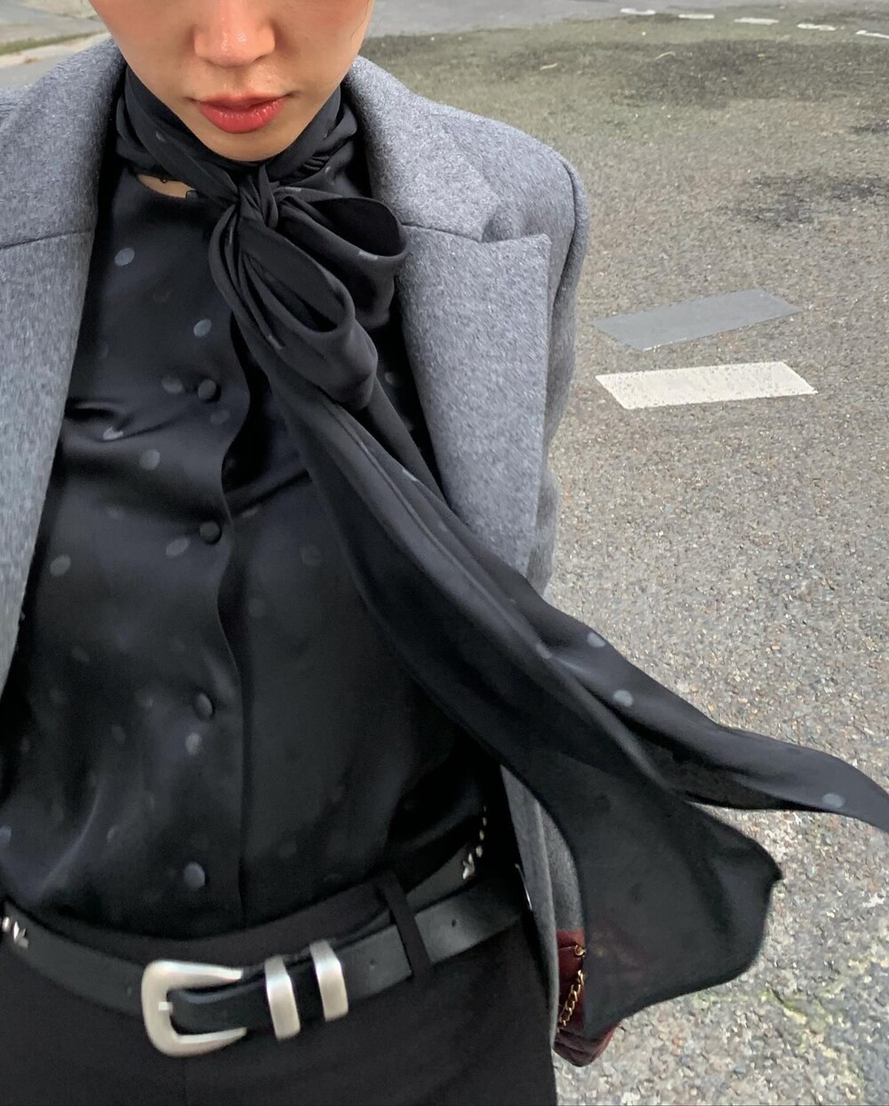 MEMO의 타이블라우스가 유달리 존재감이 있고 더 좋은 점은, 타이 면적이 꽤 넓고 목에 3번도 충분히 감길만큼의 풀 맥시 기장이라, 다양한 스타일링이 가능하다는 점이 가장 클 것 같네요. 가타부타 옷이라는 것이 편하고 손이 많이 가는 것이 제일 아니겠습니까!