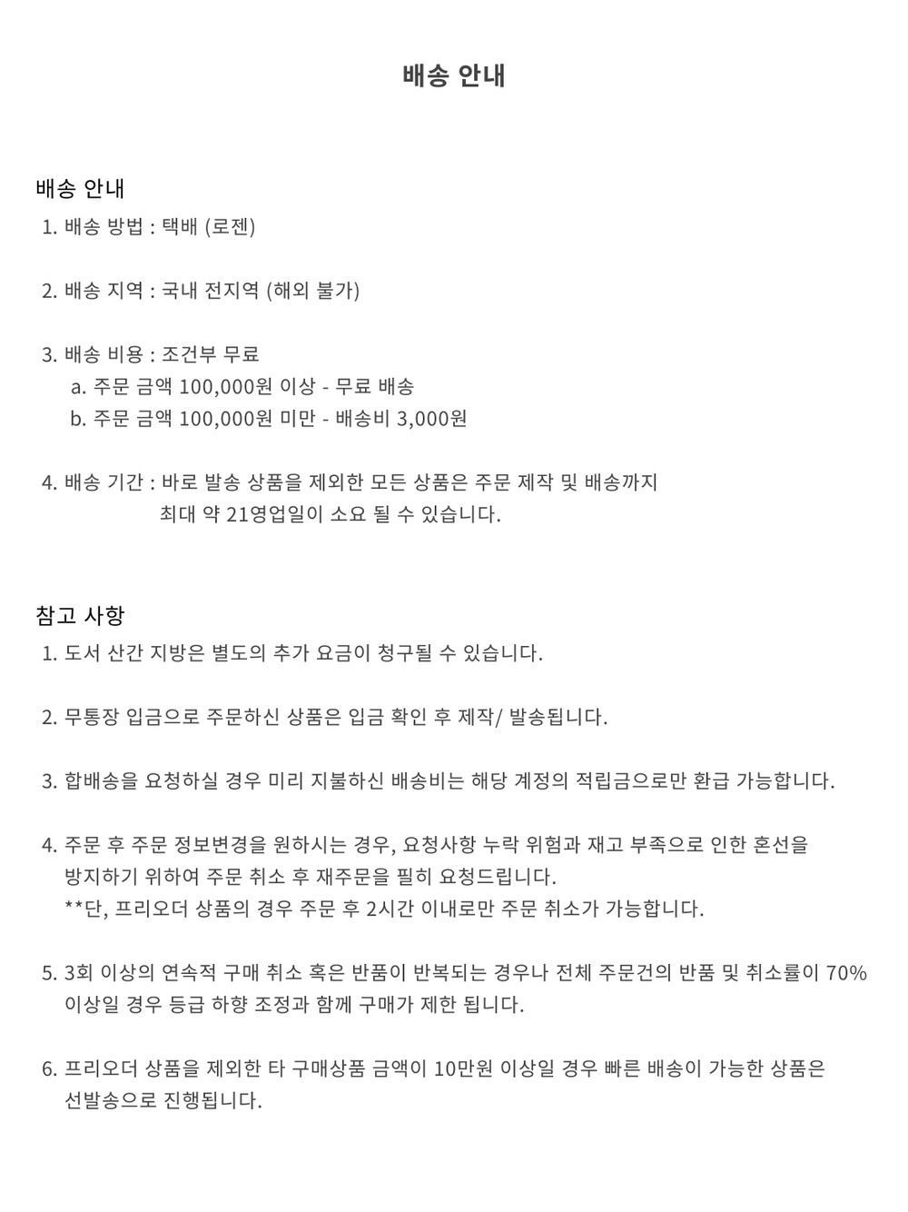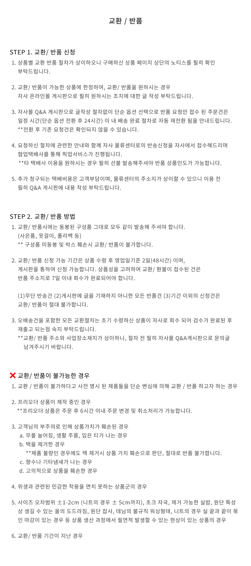 상품에 하자가 있을 경우, 착용 전 상품에 한해 무상으로 교환/반품이 가능하나 제품에 착용 흔적 및 변형이 있는 경우 교환 반품이 불가 합니다.