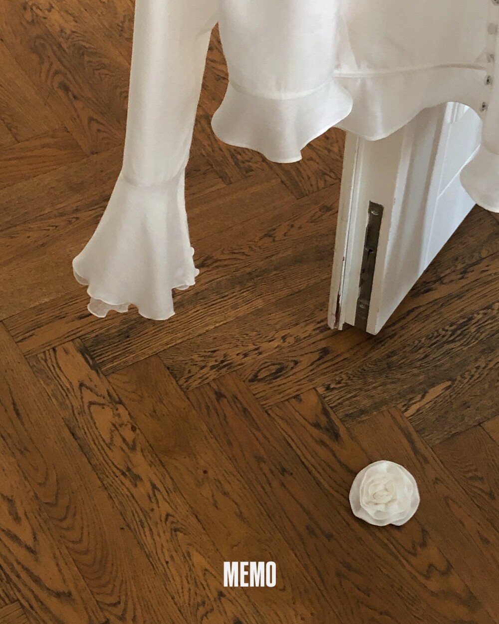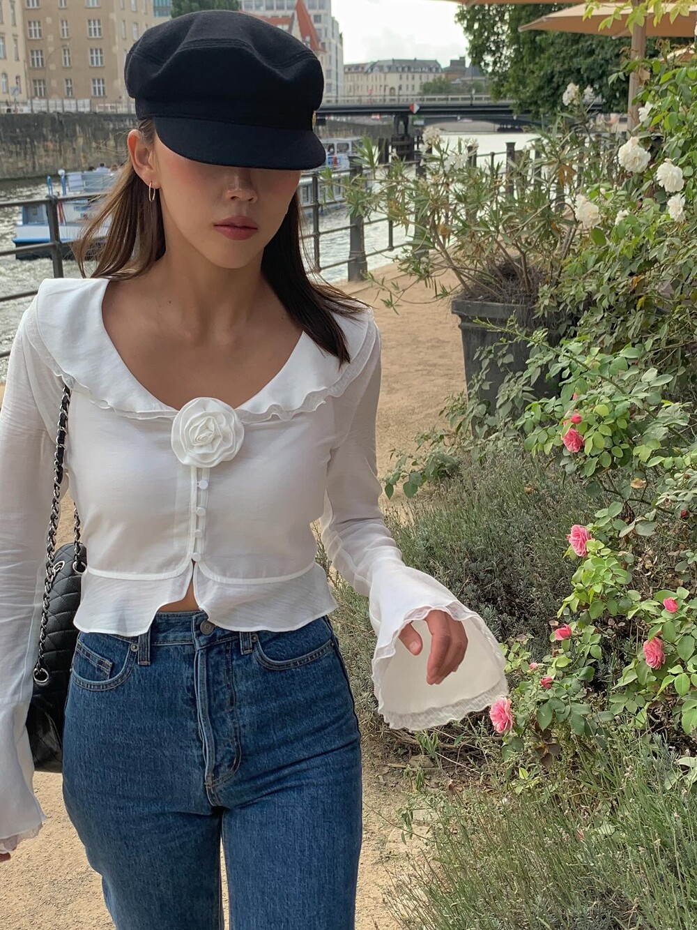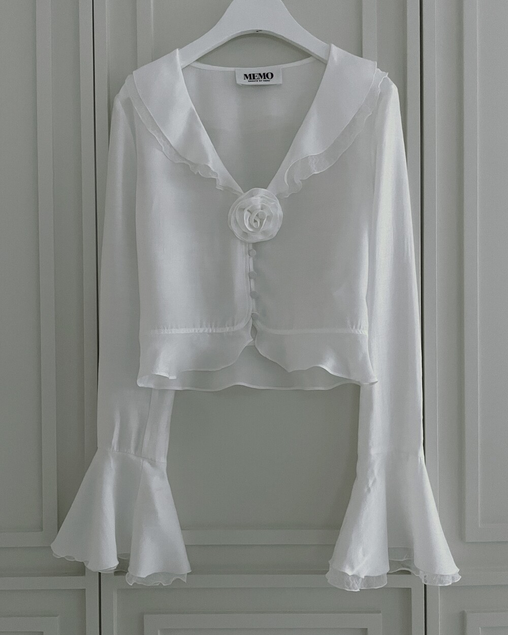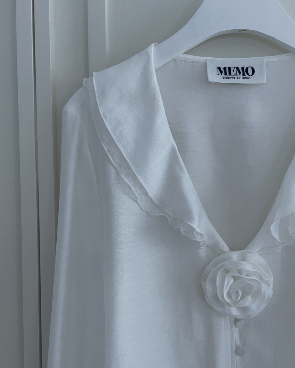 두 소재의 앙상블이 몹시 조화로운 러플 칼라와 슬리브, 그리고 장미 코사지는 킥 중의 킥.