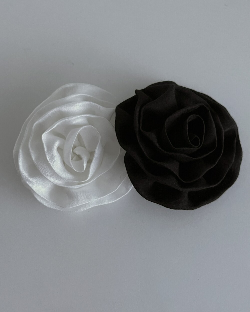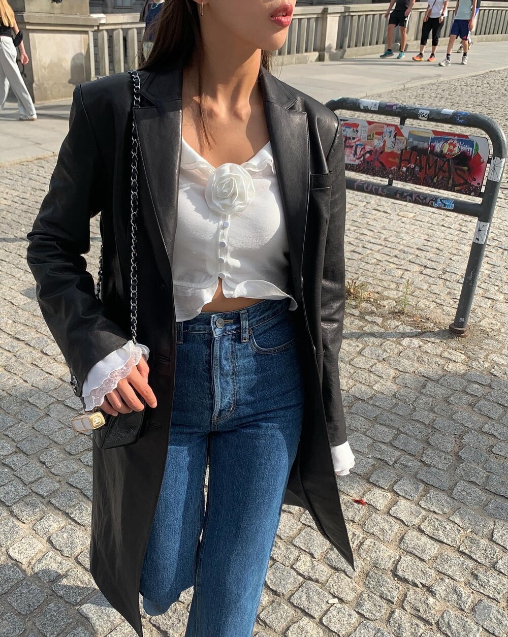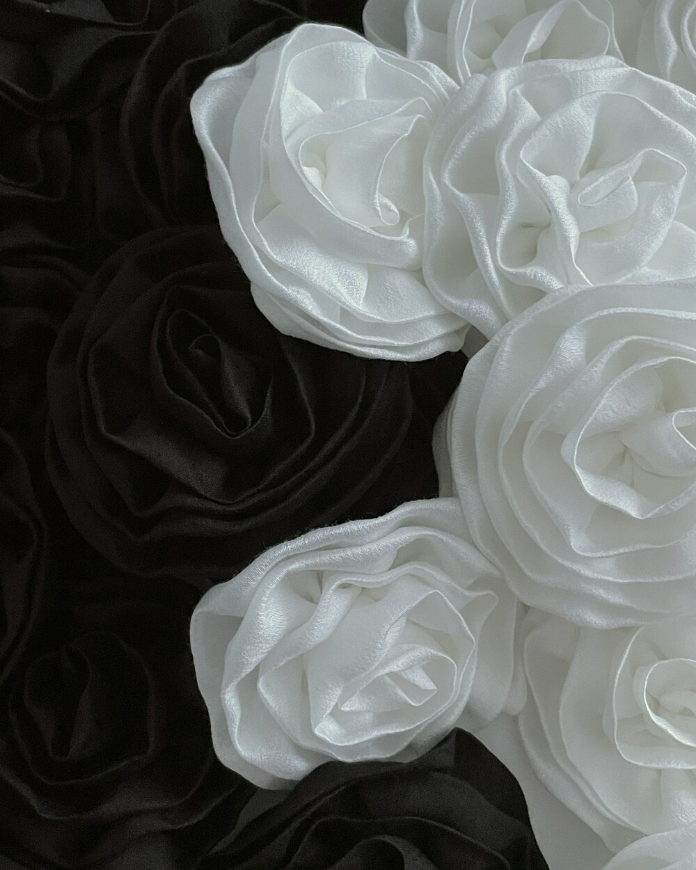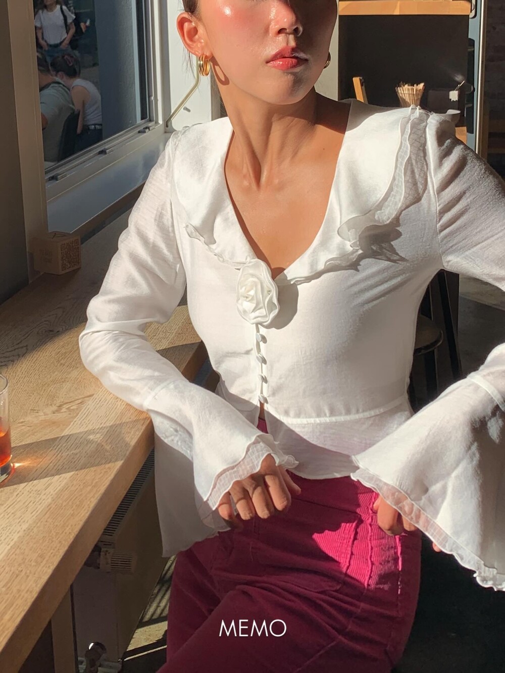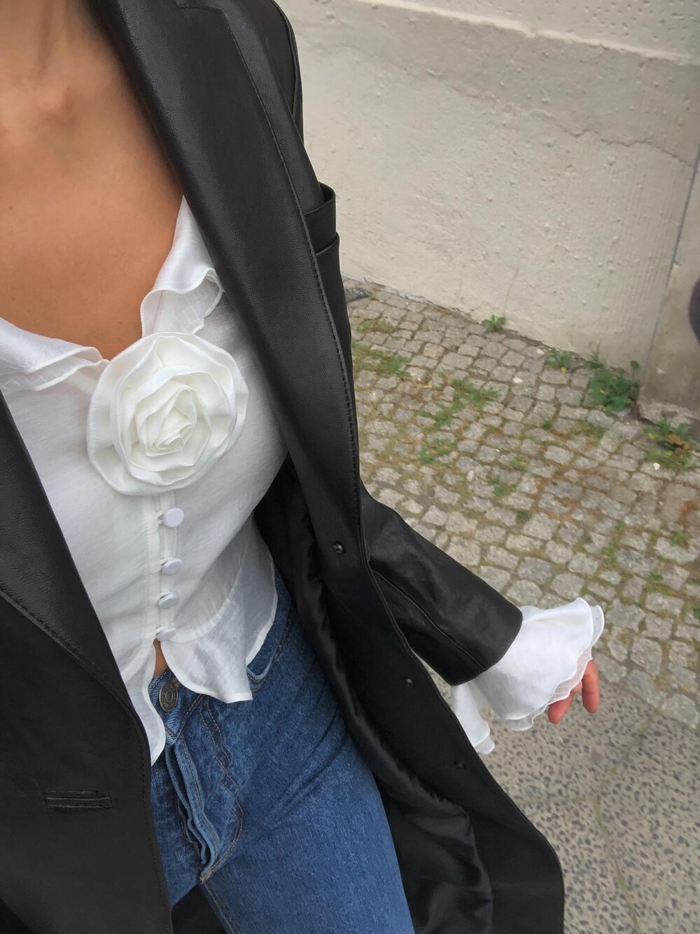 두 소재의 앙상블이 몹시 조화로운 러플 칼라와 슬리브, 그리고 장미 코사지는 킥 중의 킥.