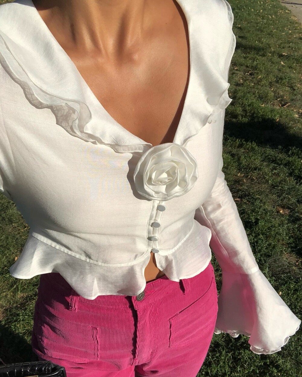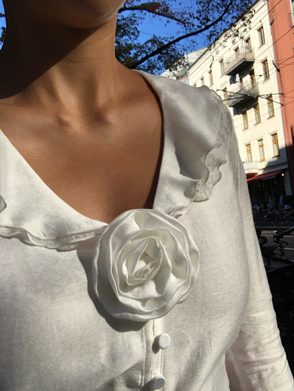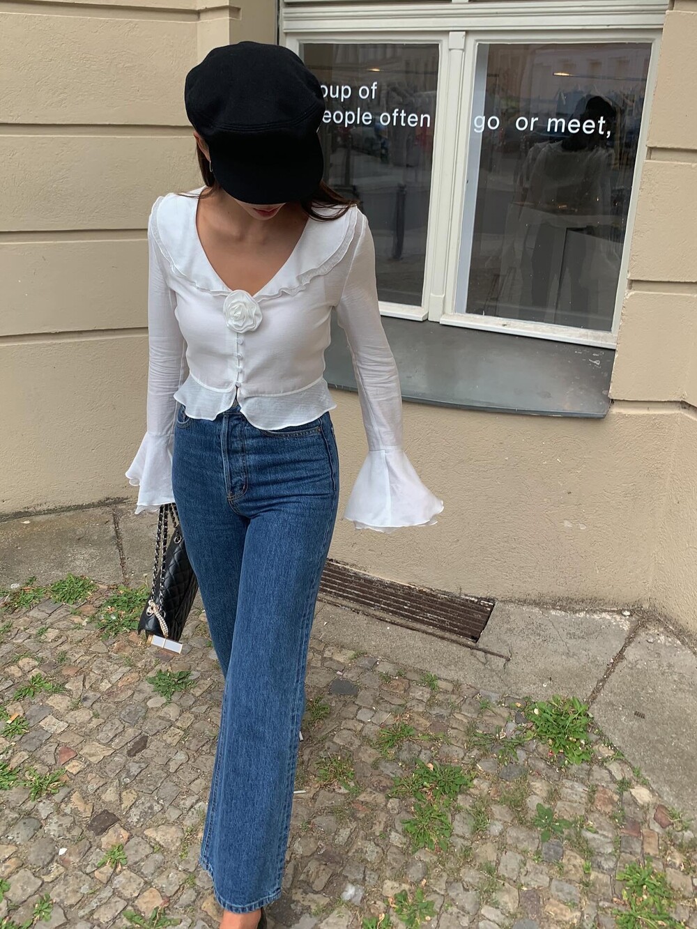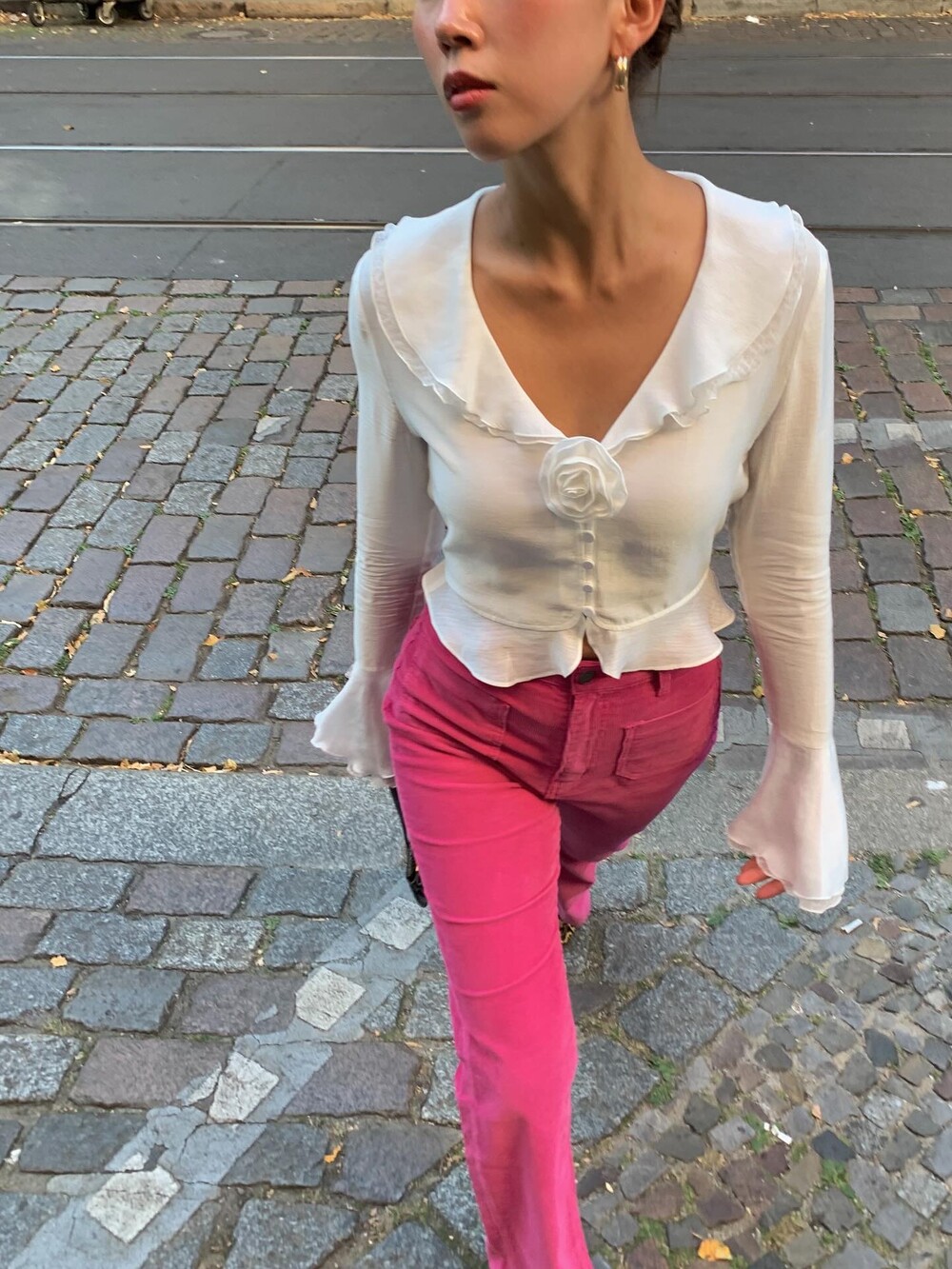 두 소재의 앙상블이 몹시 조화로운 러플 칼라와 슬리브, 그리고 장미 코사지는 킥 중의 킥.