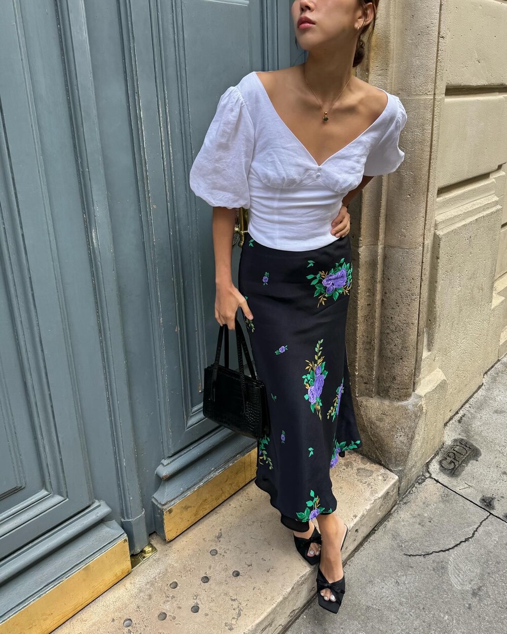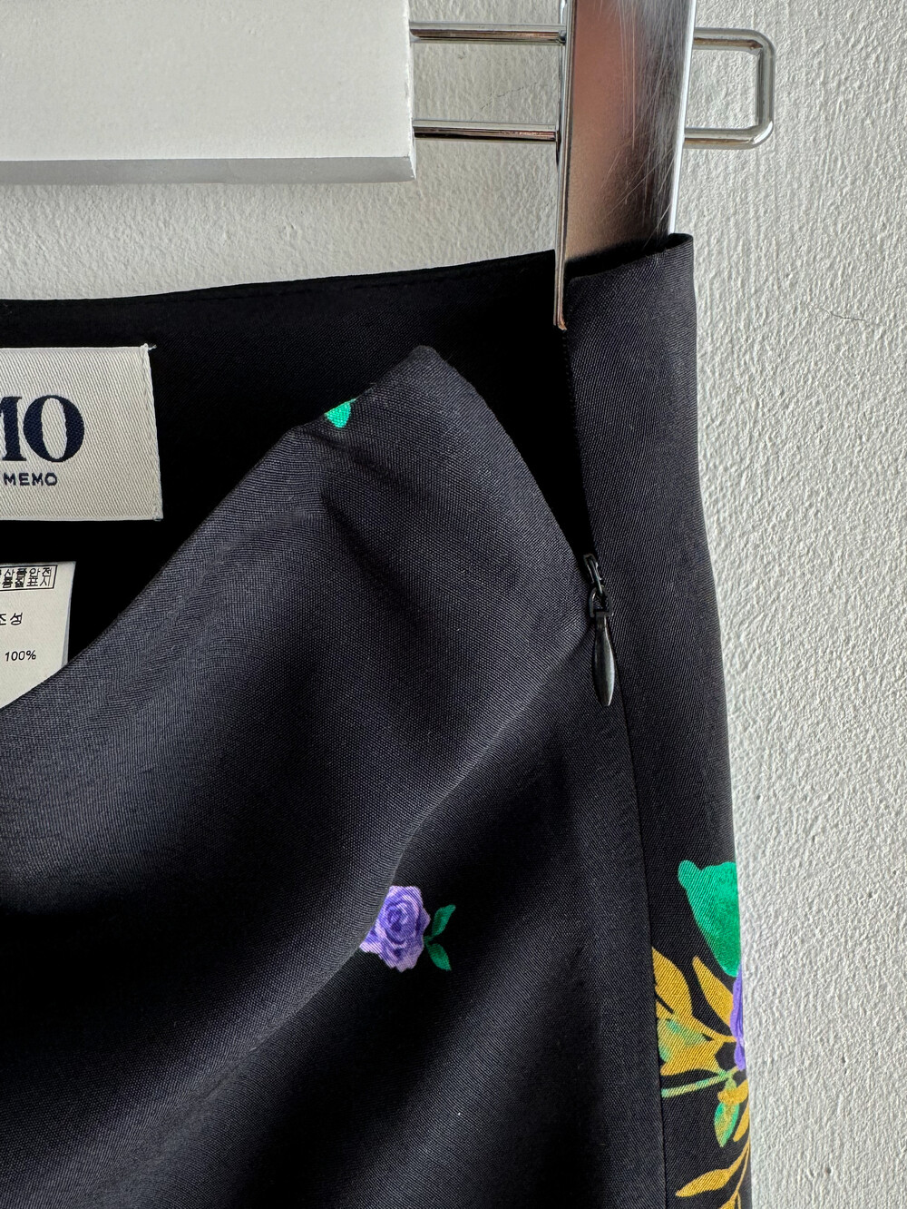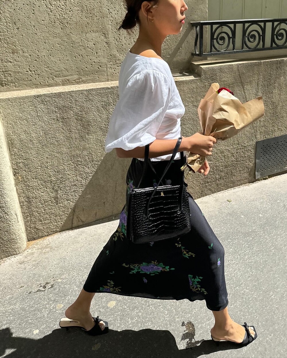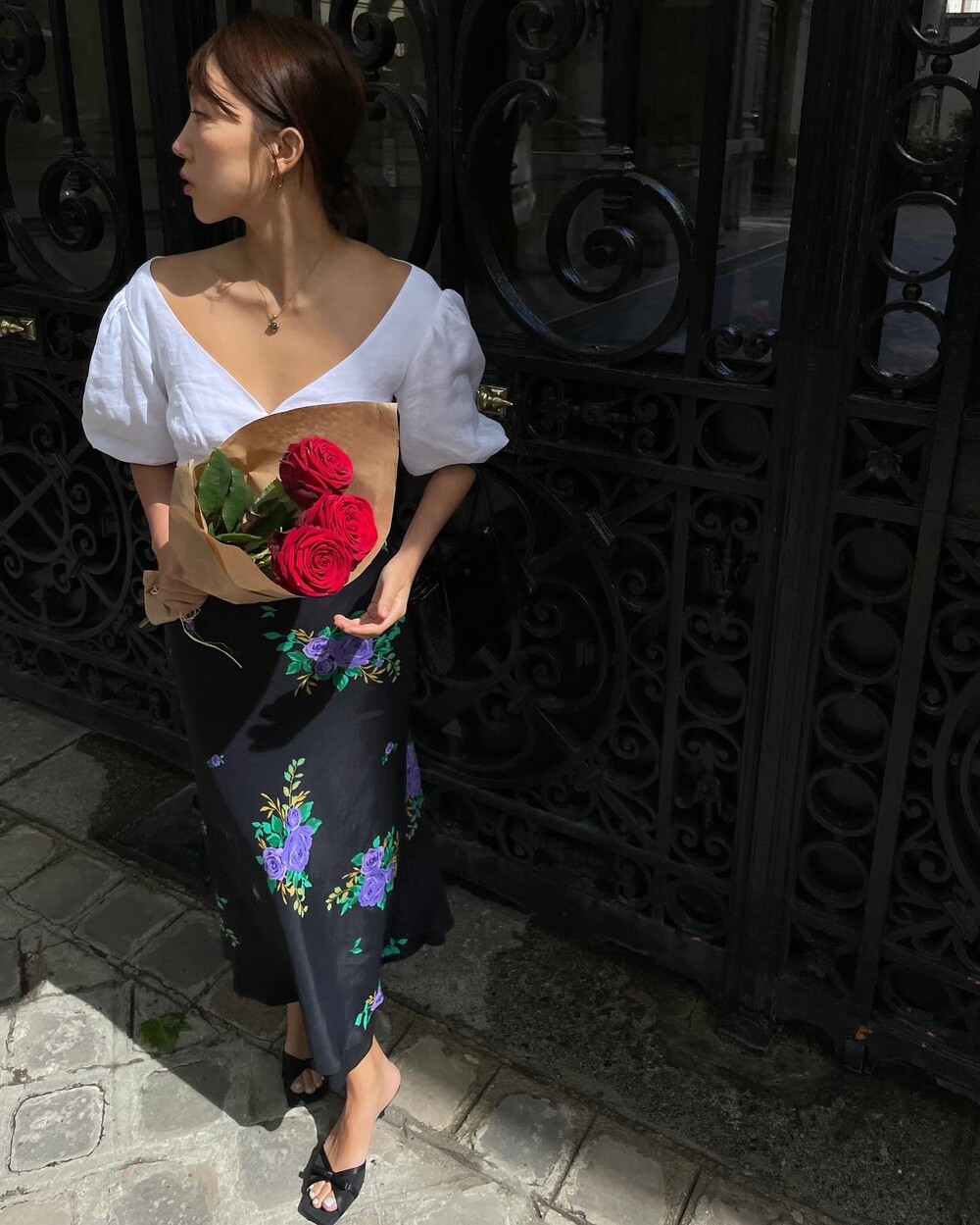 스커트 밑단에 조금 더 보여지는 쉬폰안감은 비침을 방지하는 기능 뿐 아니라 쉬어하고 페미닌한 룩으로 빌드업해줍니다.