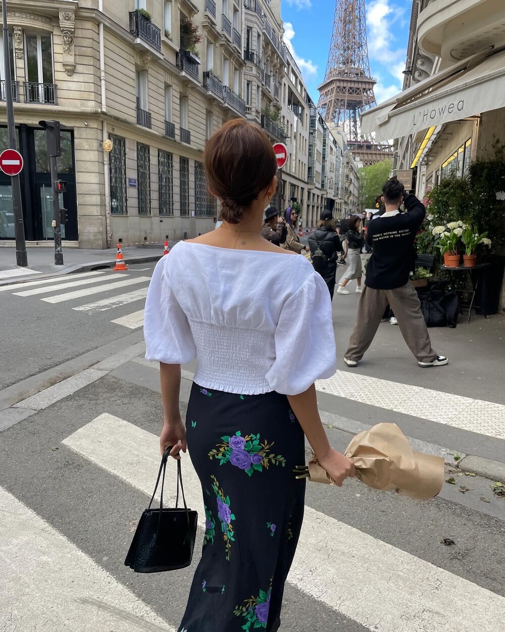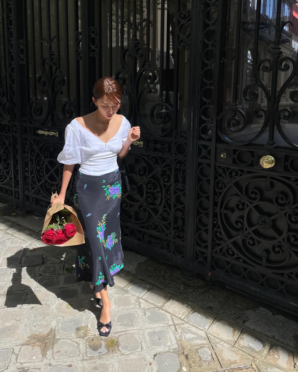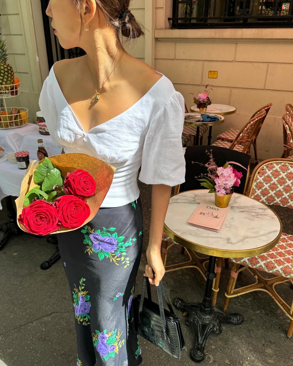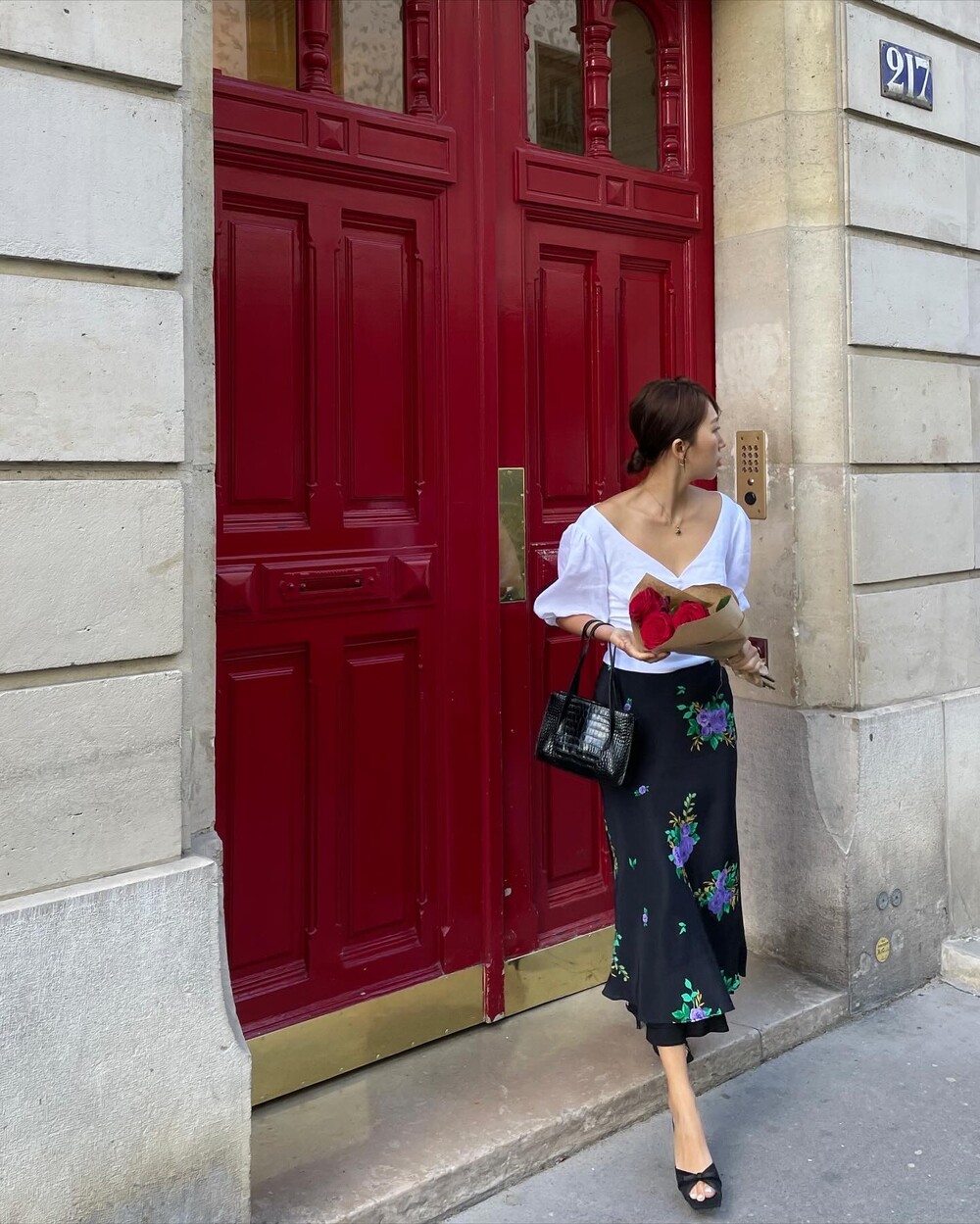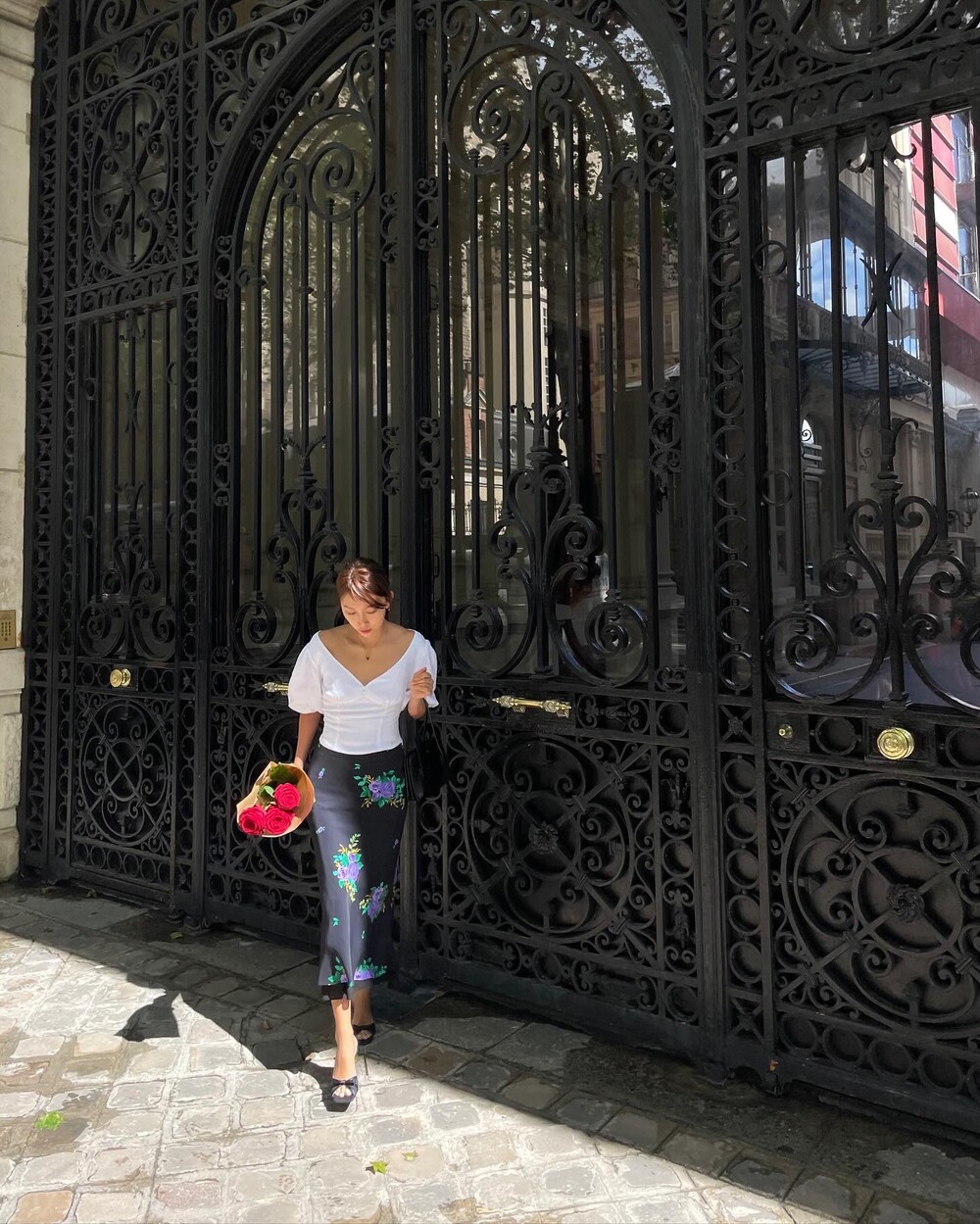 스커트 밑단에 조금 더 보여지는 쉬폰안감은 비침을 방지하는 기능 뿐 아니라 쉬어하고 페미닌한 룩으로 빌드업해줍니다.