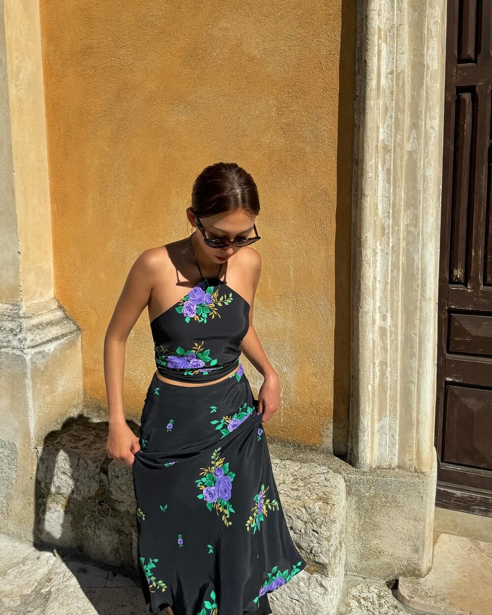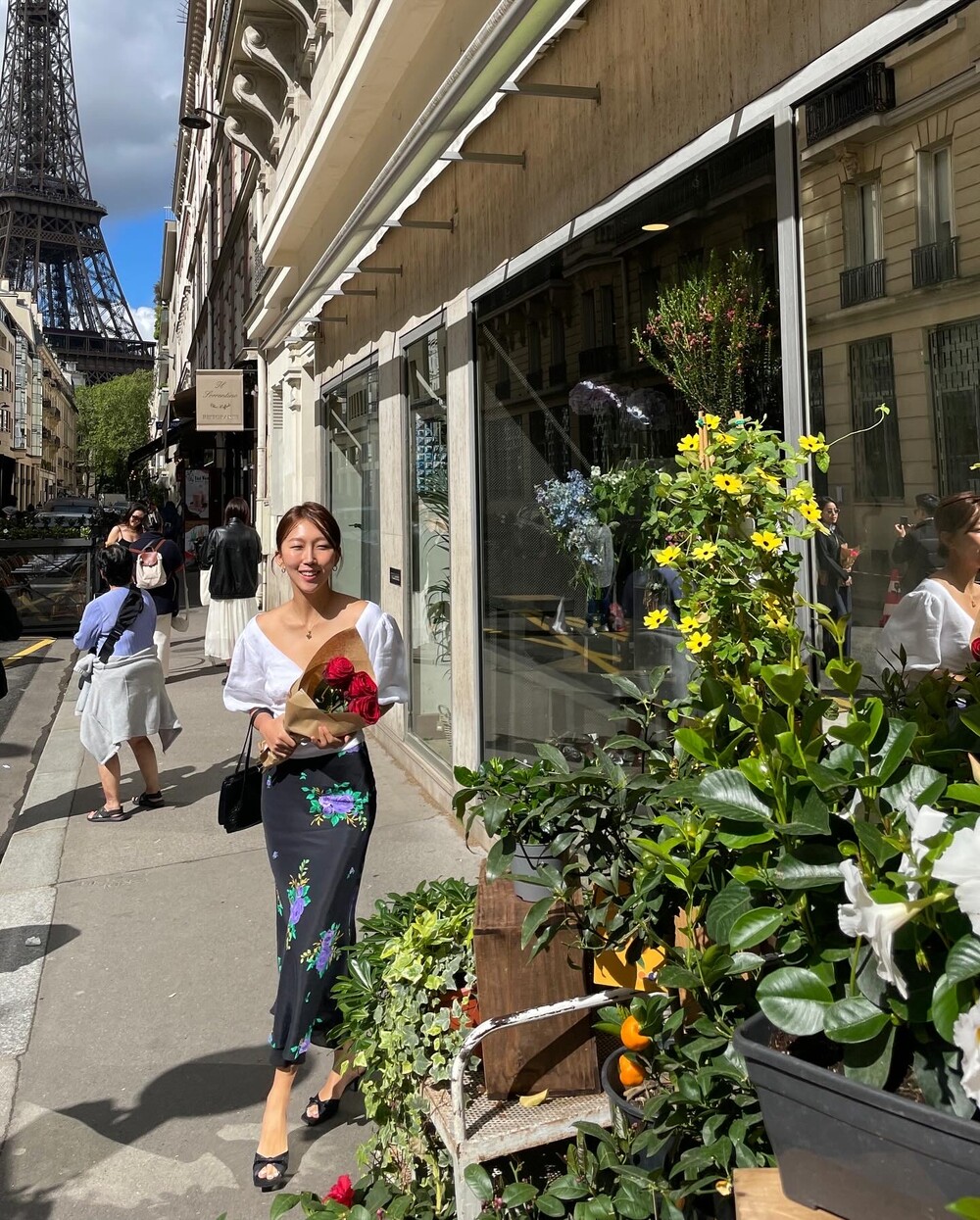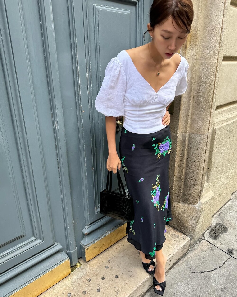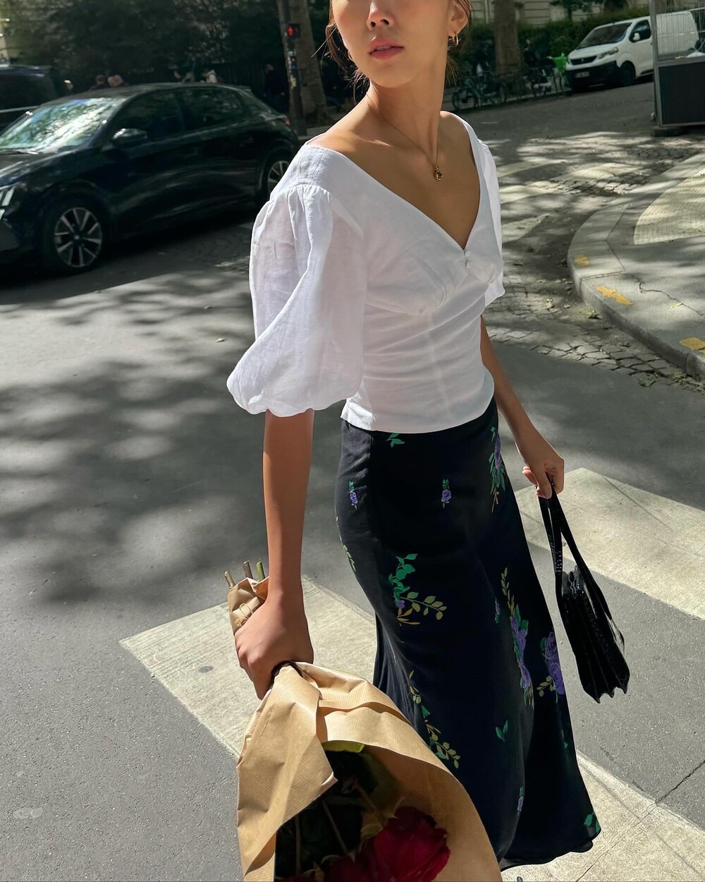 스커트 밑단에 조금 더 보여지는 쉬폰안감은 비침을 방지하는 기능 뿐 아니라 쉬어하고 페미닌한 룩으로 빌드업해줍니다.