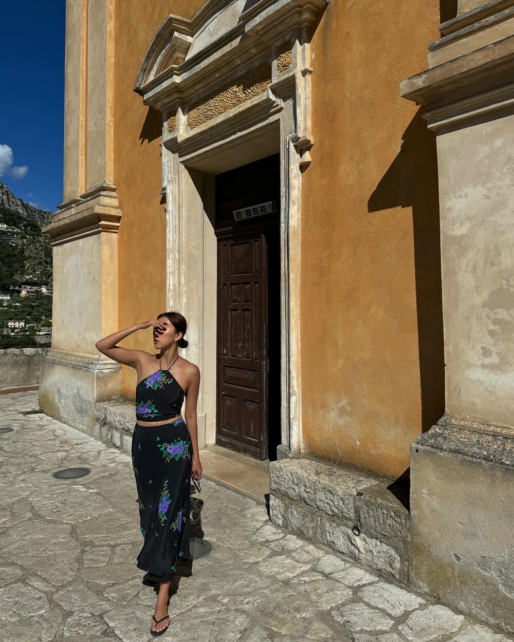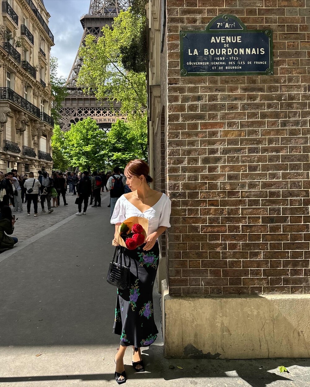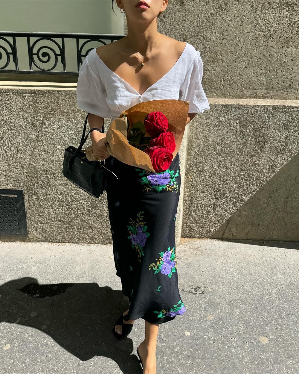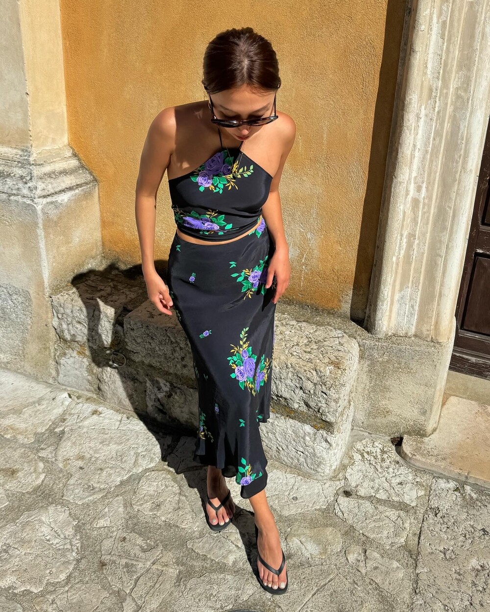 스커트 밑단에 조금 더 보여지는 쉬폰안감은 비침을 방지하는 기능 뿐 아니라 쉬어하고 페미닌한 룩으로 빌드업해줍니다.